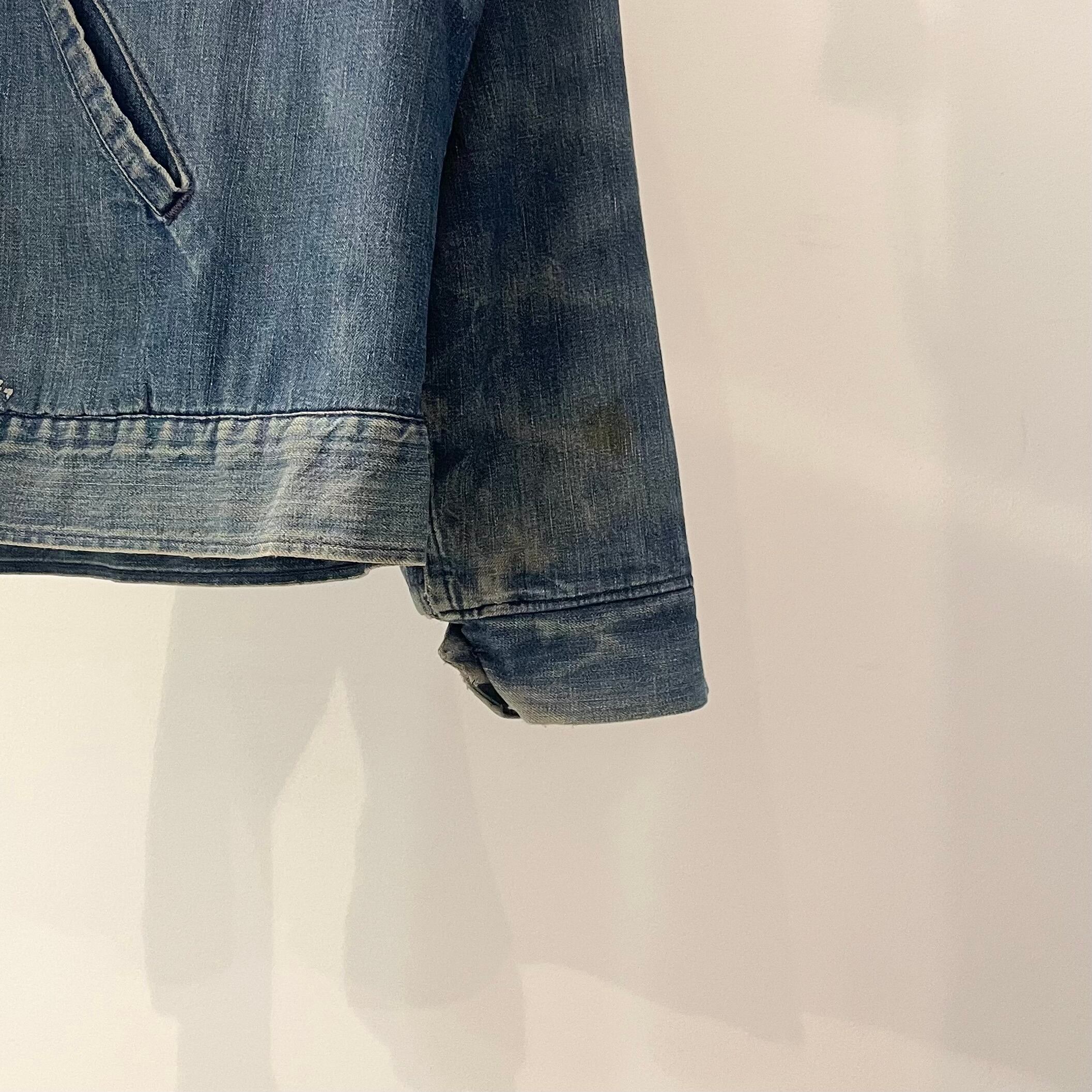 右袖に大き目、背中に小穴が見られます。その他、袖先にダメージ、薄汚れが見られるカ所がありますが、着用に支障となりような目立ったヨゴレやダメージは見られません。