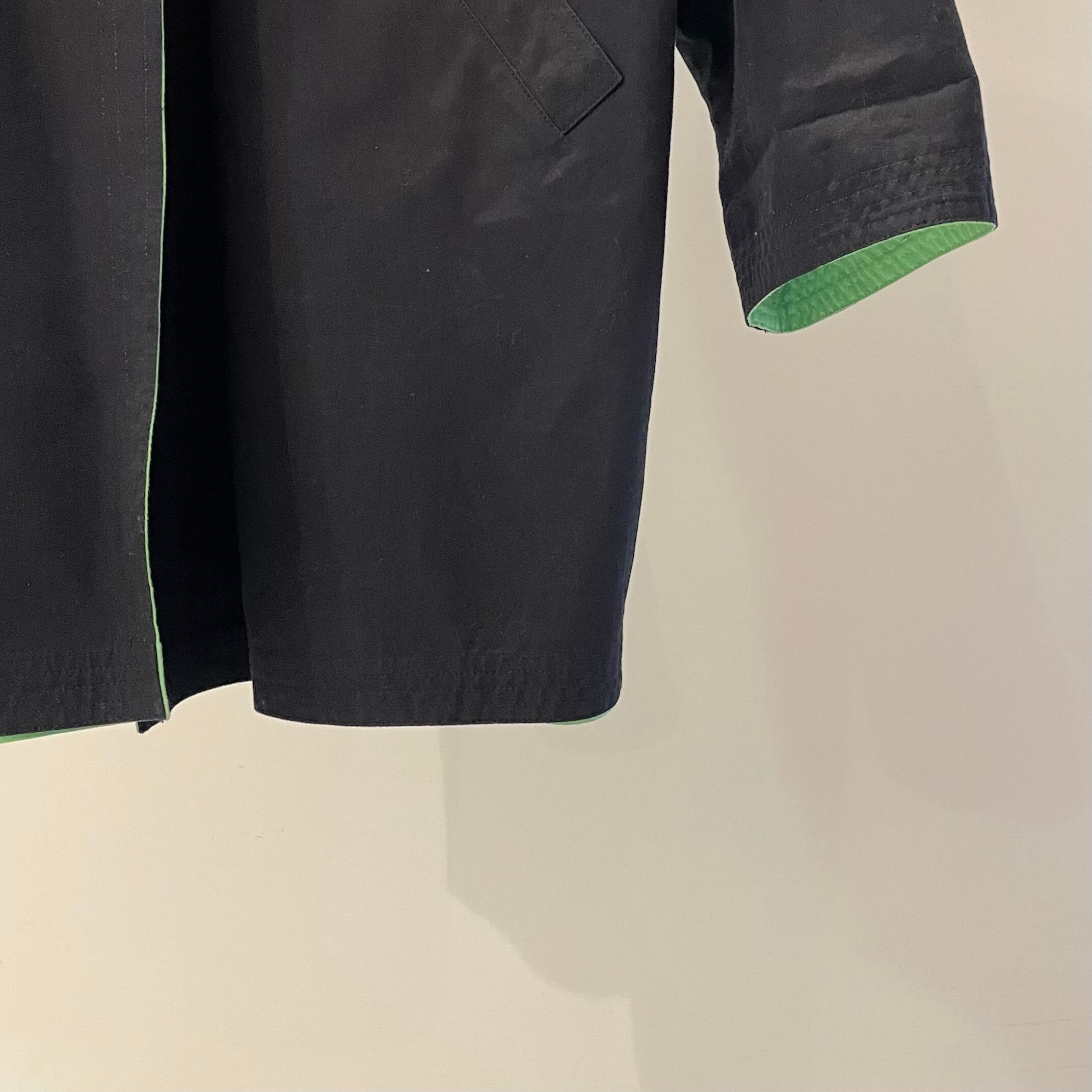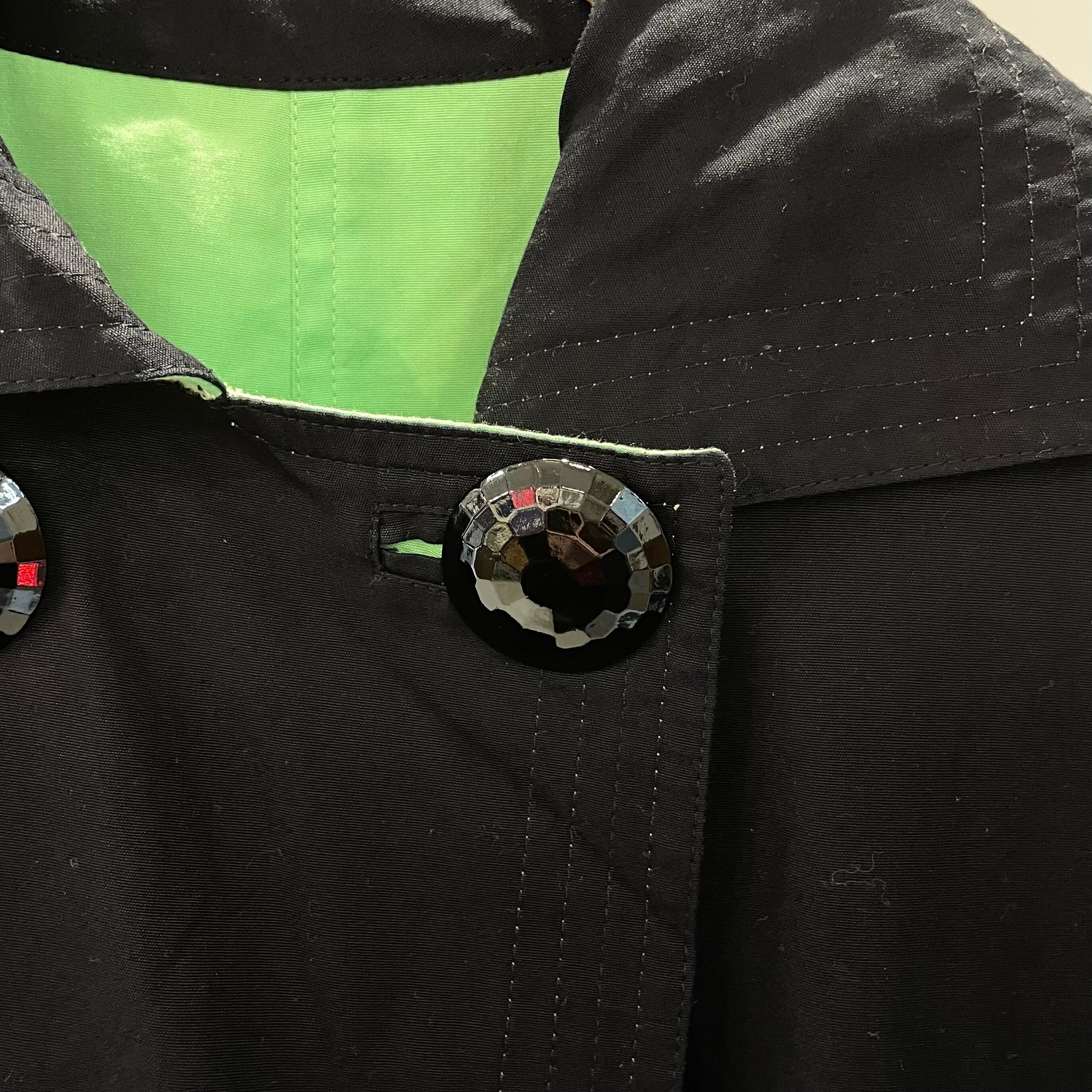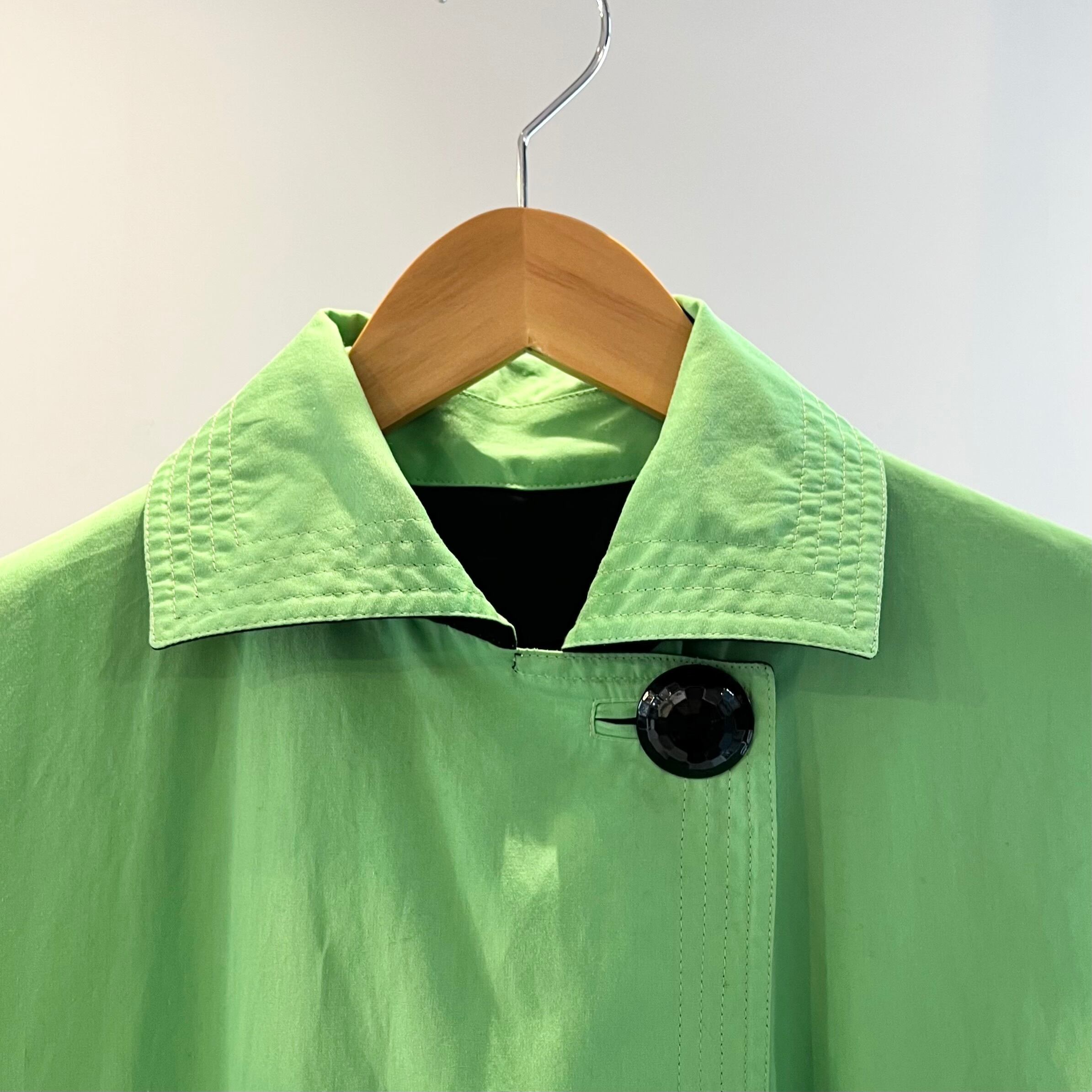 ブラックxライムグリーンのリバーシブル、襟元に2つのメタルボタン、ハンドウォームポケット、薄手の一ウエストにベルトループが付き、供生地のベルトが付けられるデザインです。