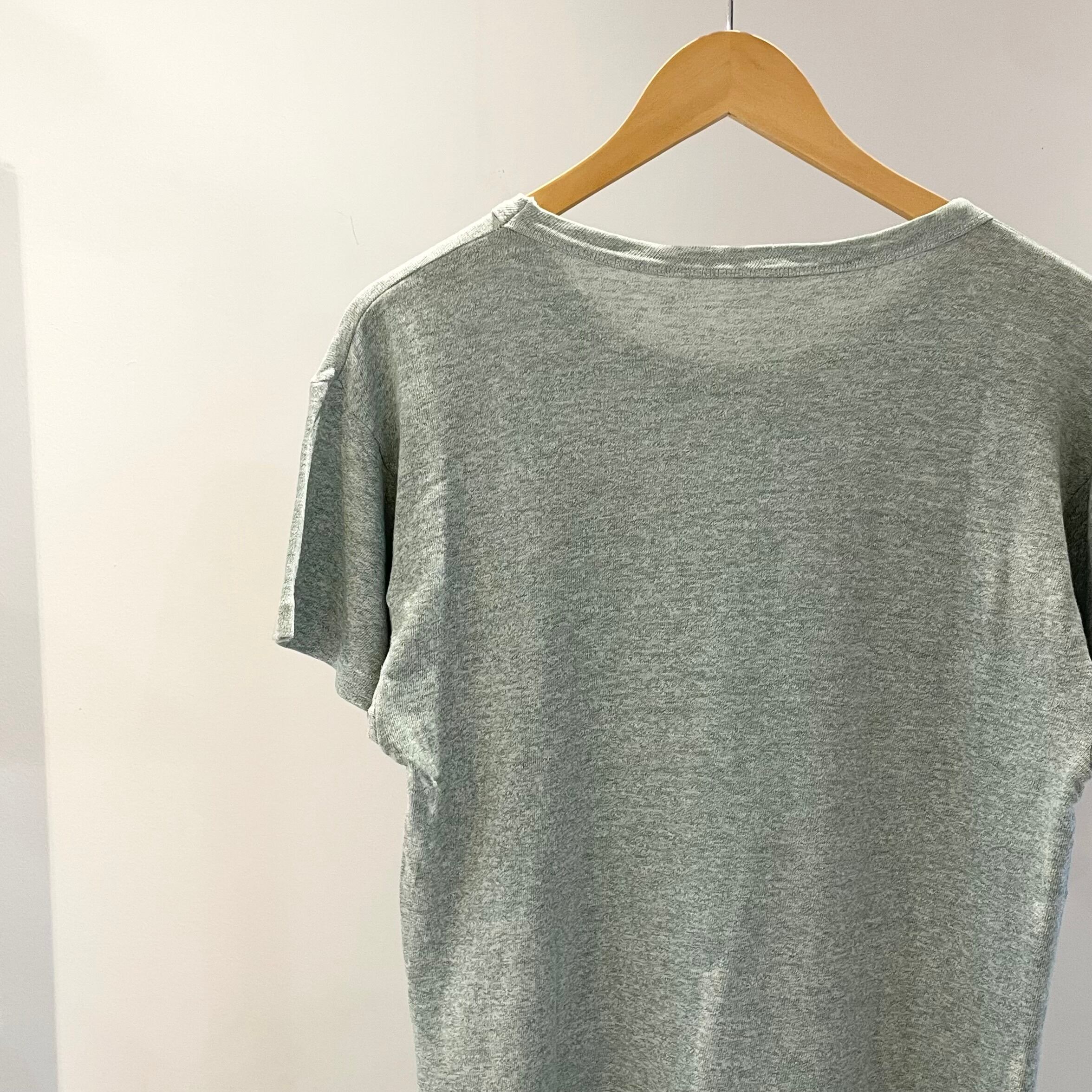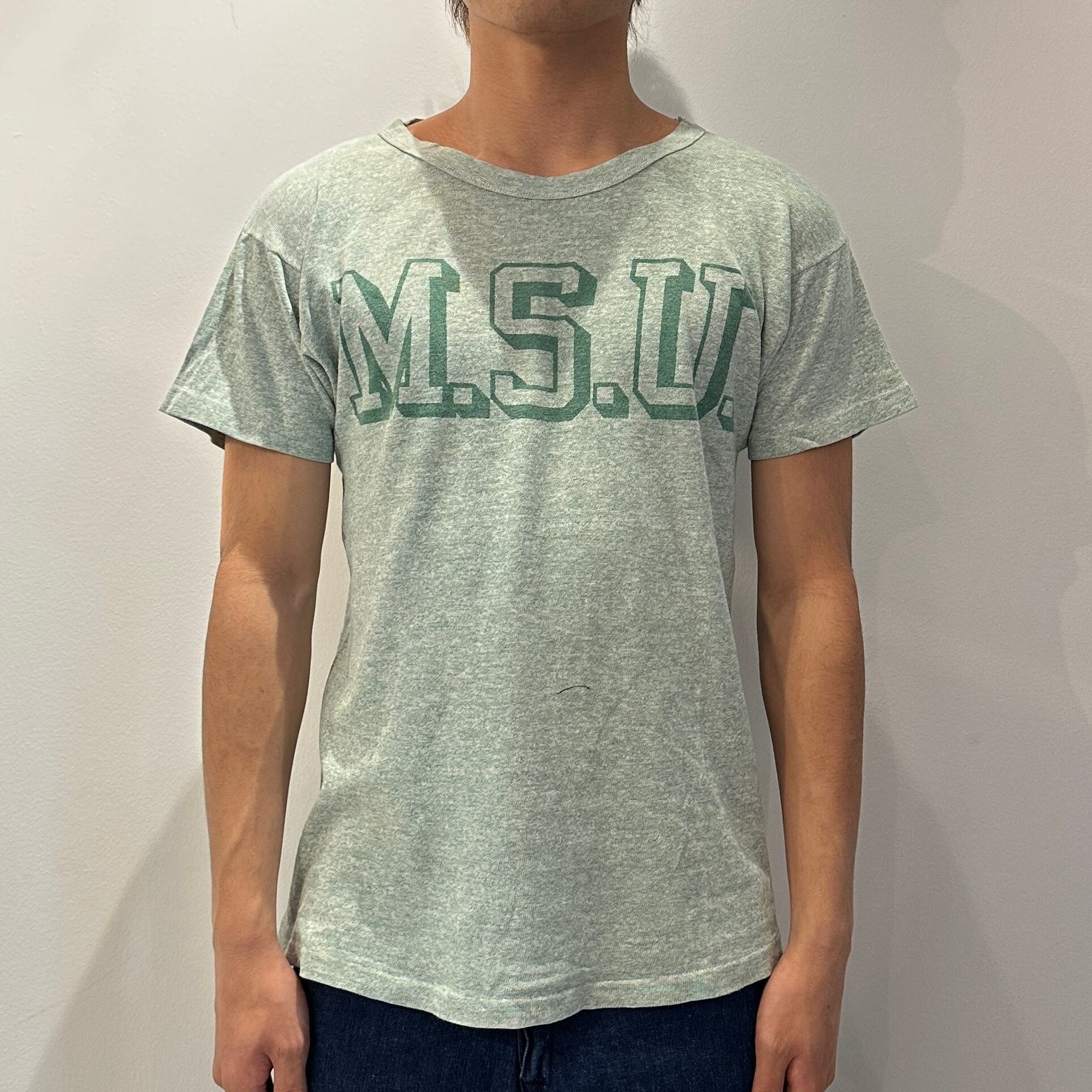 杢グリーンレーヨン混系素材、フロントにM.S.U.の染み込みプリントが入るシンプルデザインです。