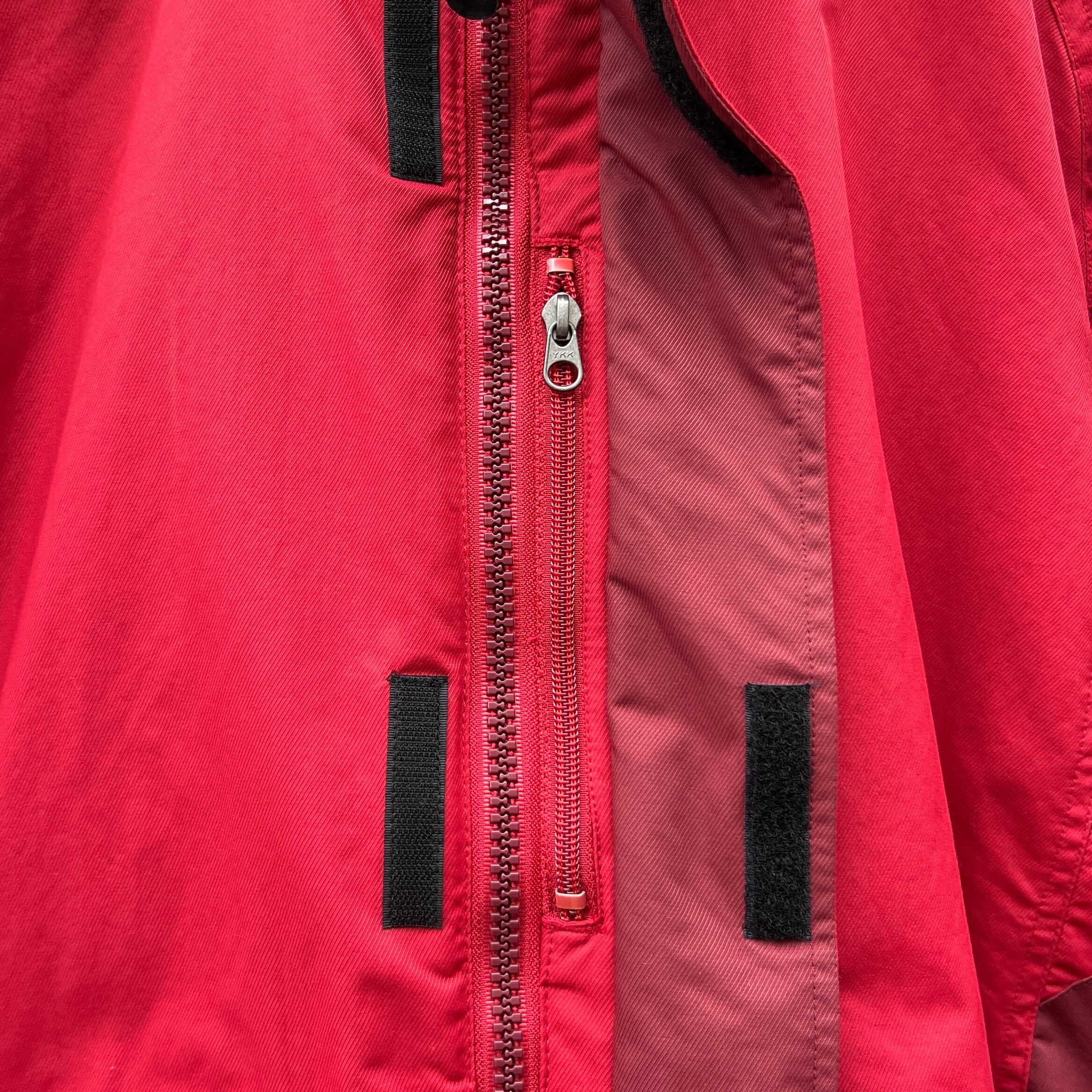 レッドxダークレッドのナイロン素材、左袖にロゴマーク刺繍、ジッパー付きハンドウォームポケット、内側にライナーが付けられる防寒アウターのデザインです。