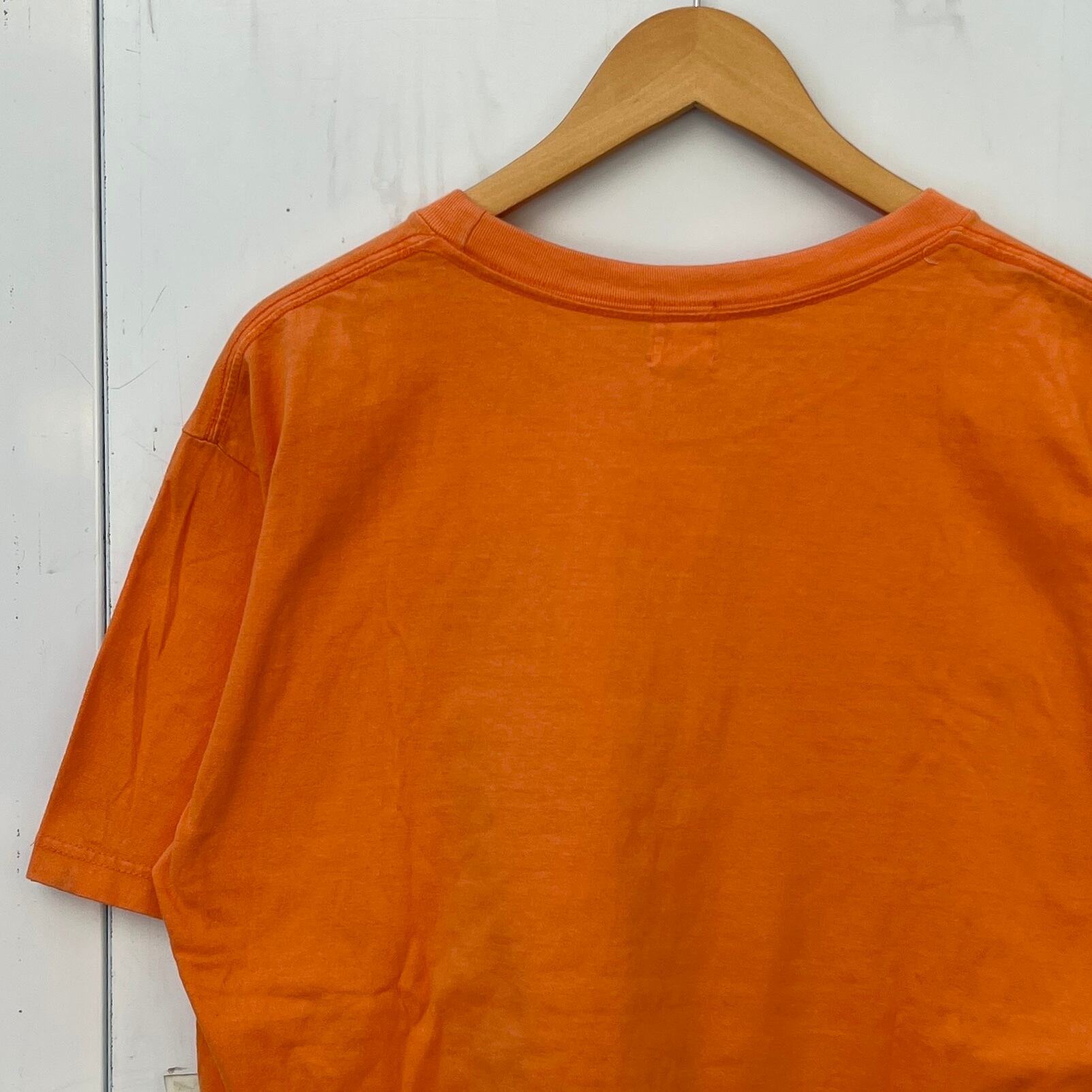 オレンジのコットンボディ、フロントにロゴプリント、左袖にピスネームが付いたデザインです。