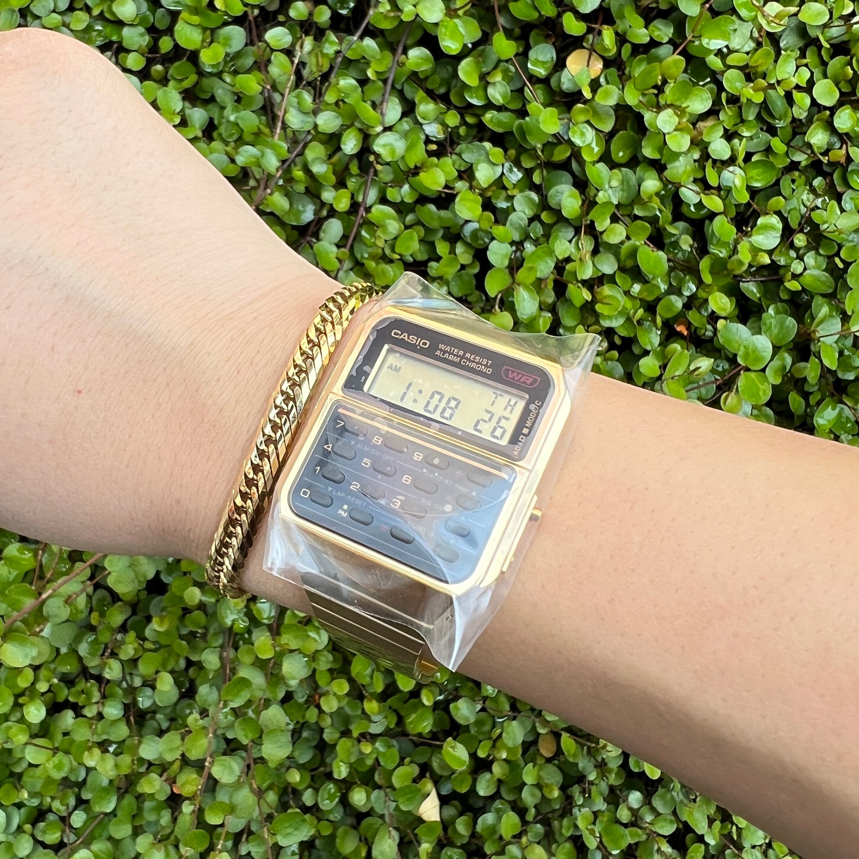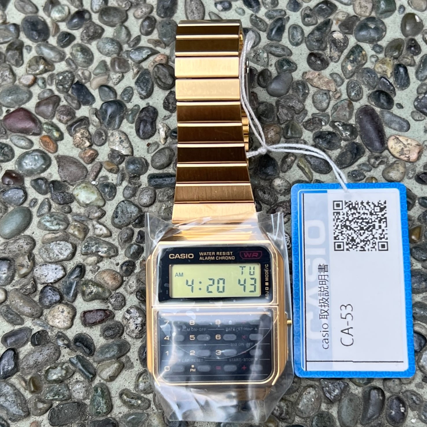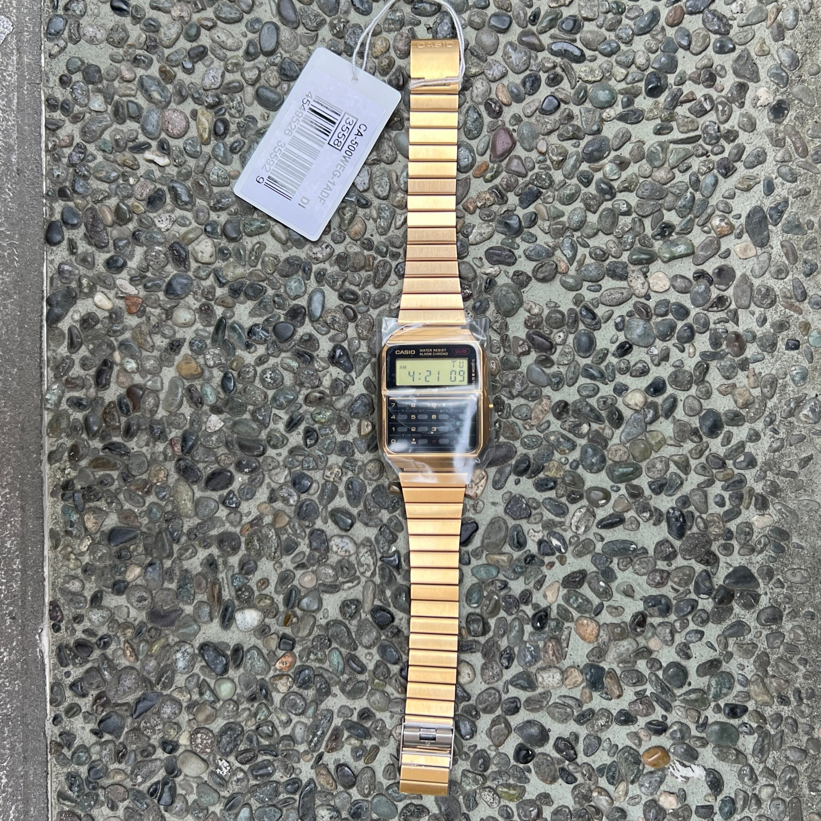 ゴールドカラー、デジタル文字盤、アラーム機能、電卓機能、ストップウォッチ機能ファンクションボタンがフロントに付いたデザインです。