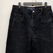 ウォッシュドブラックデニム、右バックポケットにロゴネーム、ロゴダブル入りボタン、リベットの付いたデザインです。