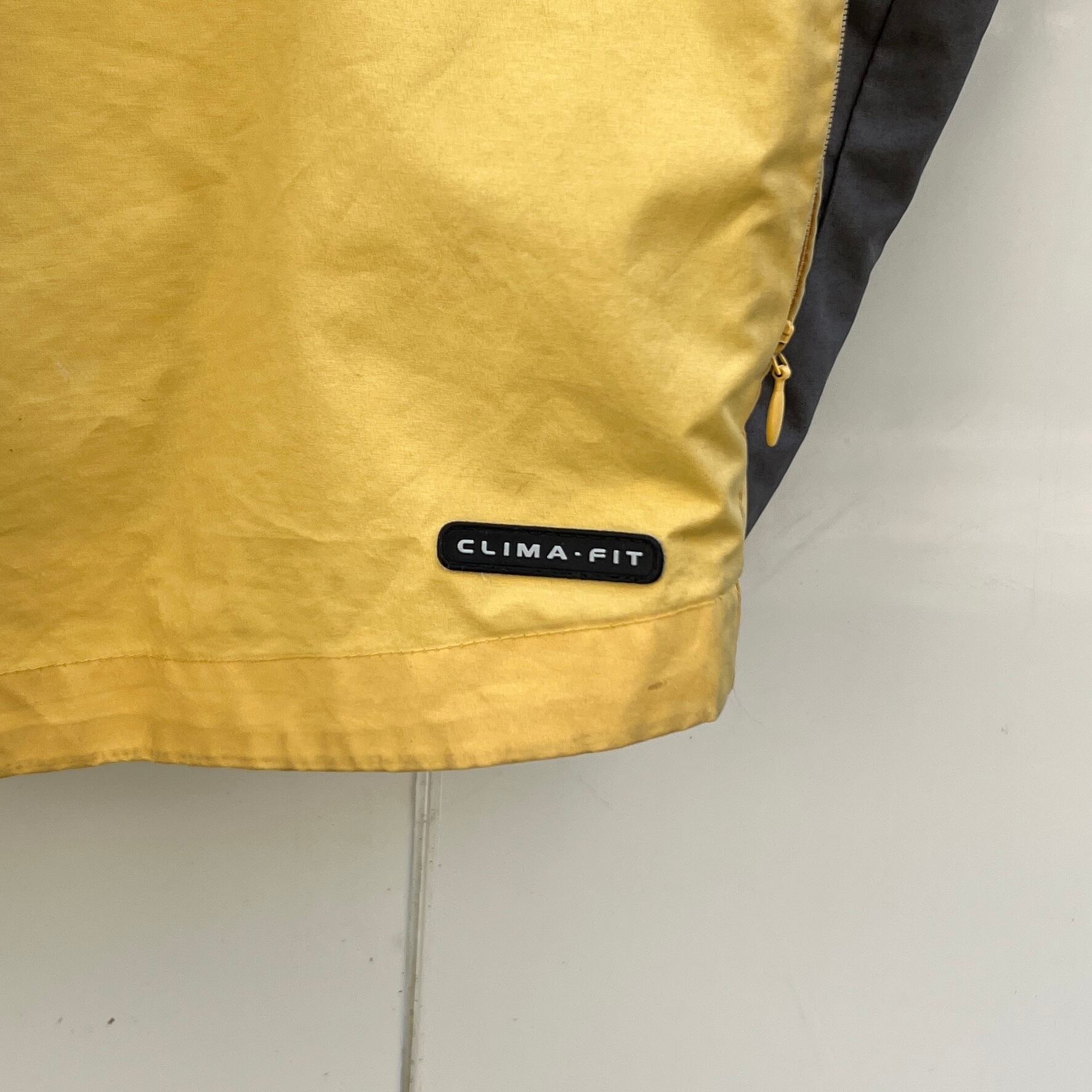 イエロー×グレーのポリエステル素材、左袖にスウォッシュ刺繍、ハンドウォームポケットが付くデザインです。