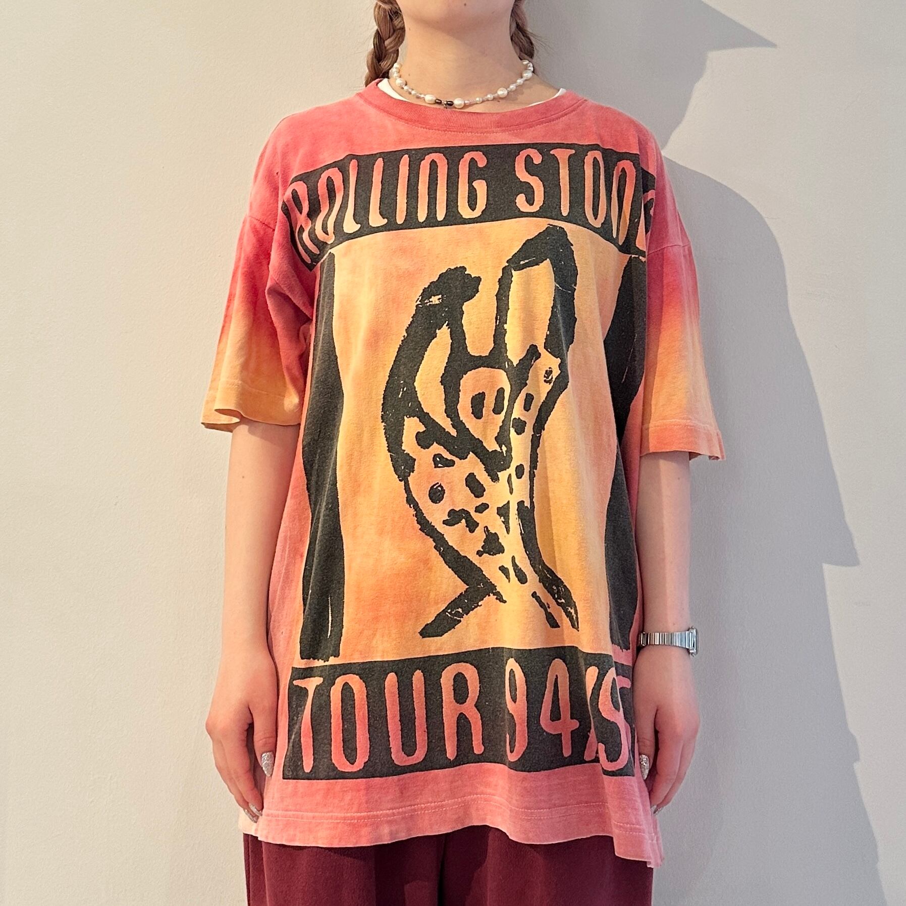 レッド/イエロー系のムラ染ボディ、フロントにVOO DOO LOUNGEのロゴマークとTOUR 94/95プリント、バックにROLLING STONES WORLD TOUR VOO DOO LOUNGEプリントの入るデザインです。