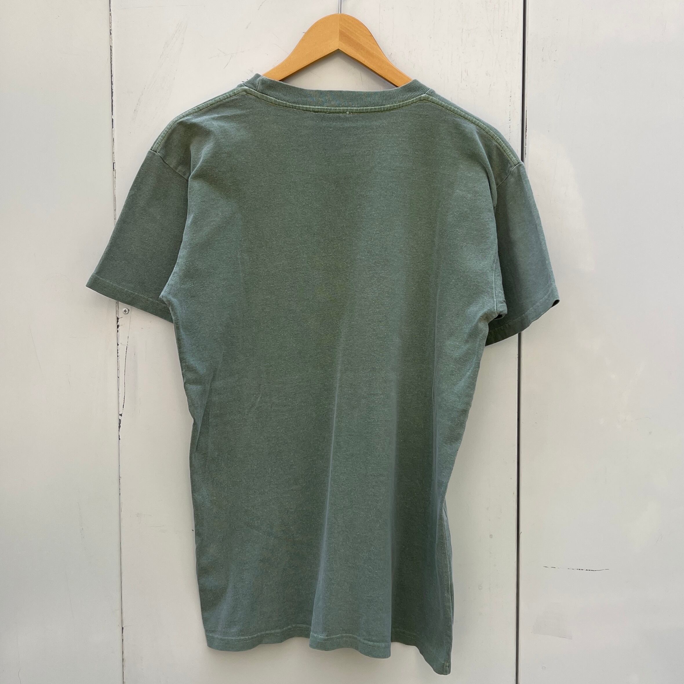 グリーンのピグメントダイ、フロントに筆記体ロゴがプリントされたシンプルデザインです。