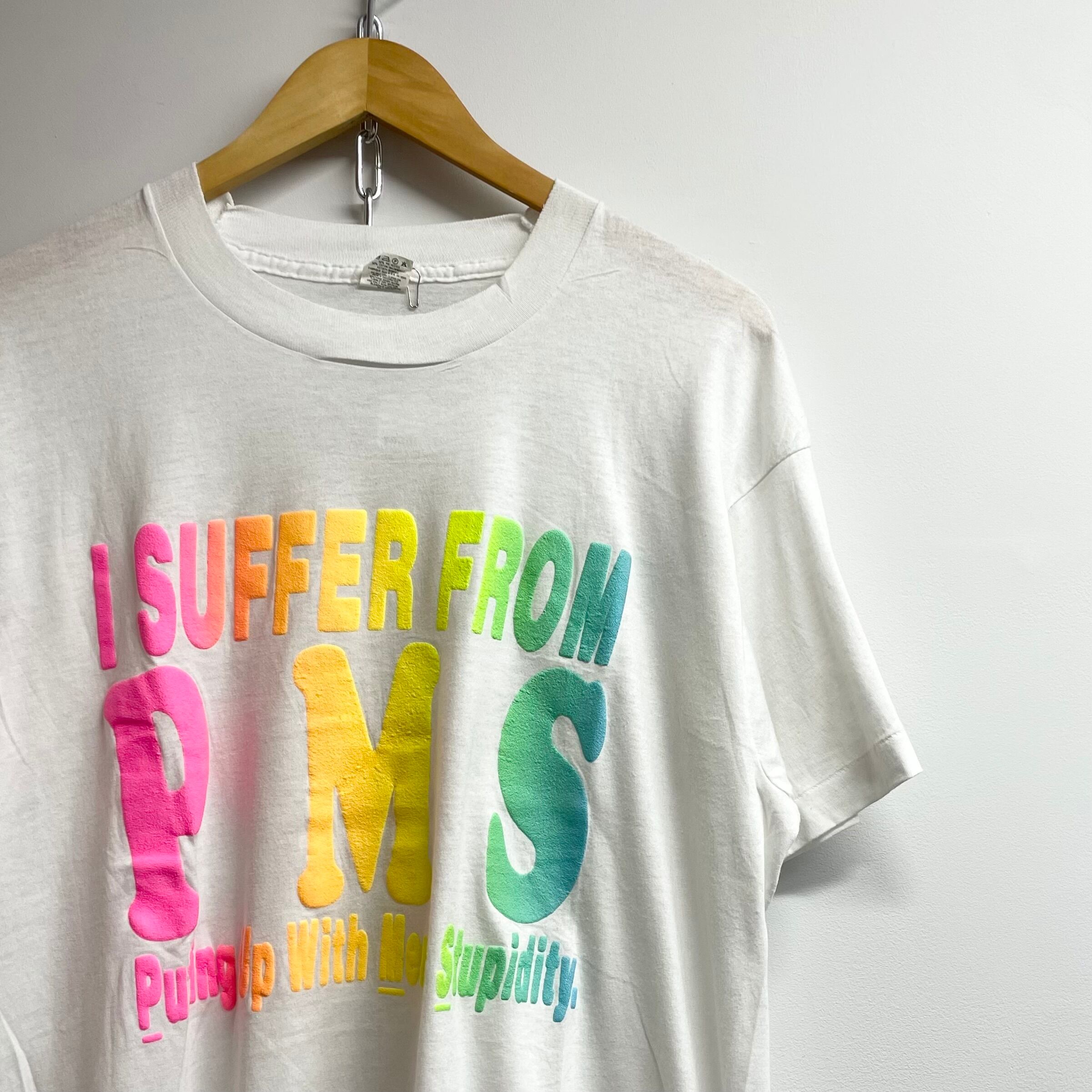 ホワイトのポリエステル混素材、フロントにI SUFFER FROM PMSのレインボーカラーの発泡プリントが入るデザインです。