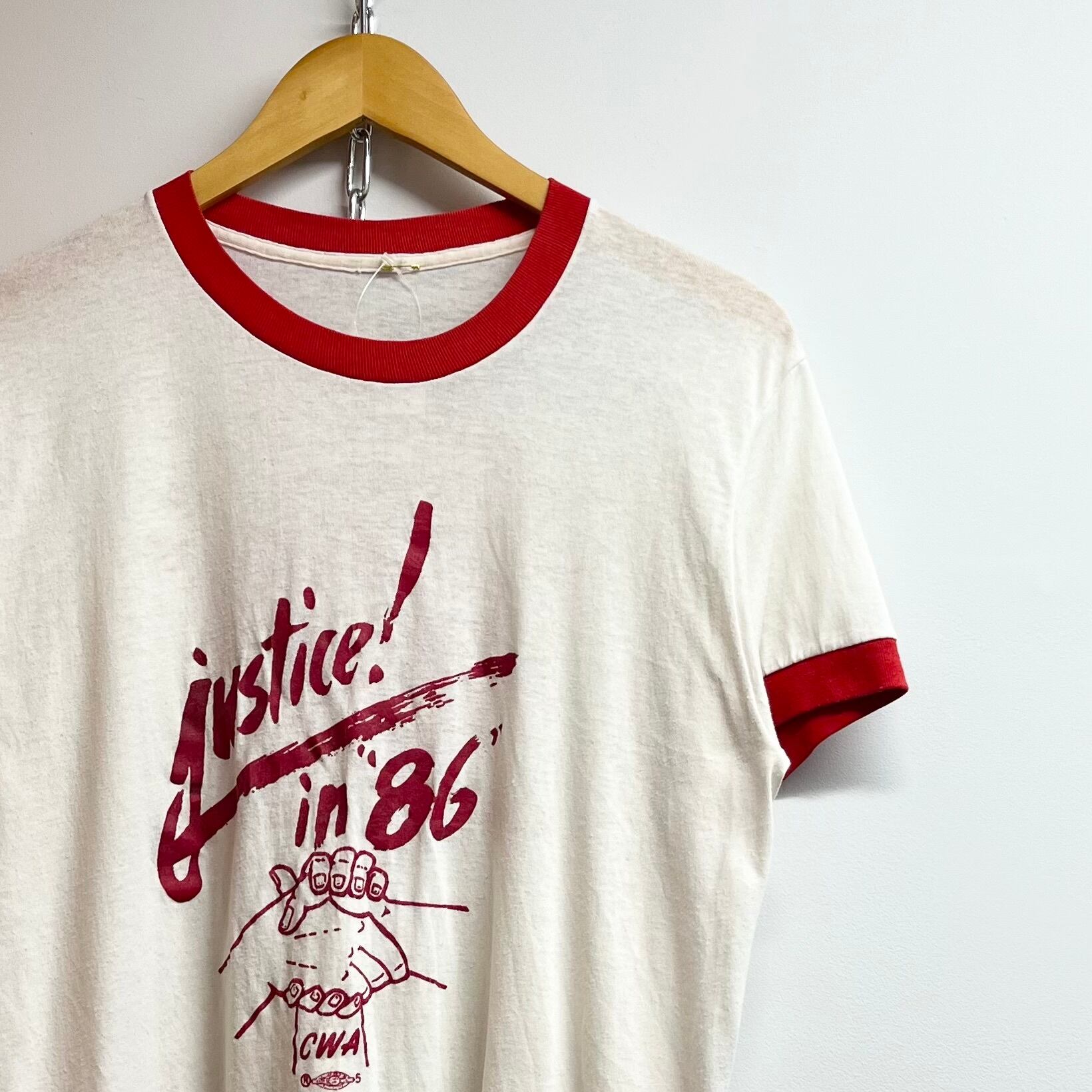 ホワイトxレッドのポリエステル混系素材、フロントにjustice in 86プリント、バックにLOCAL 6132 AUSTIN TEXASがプリントされたデザインです。