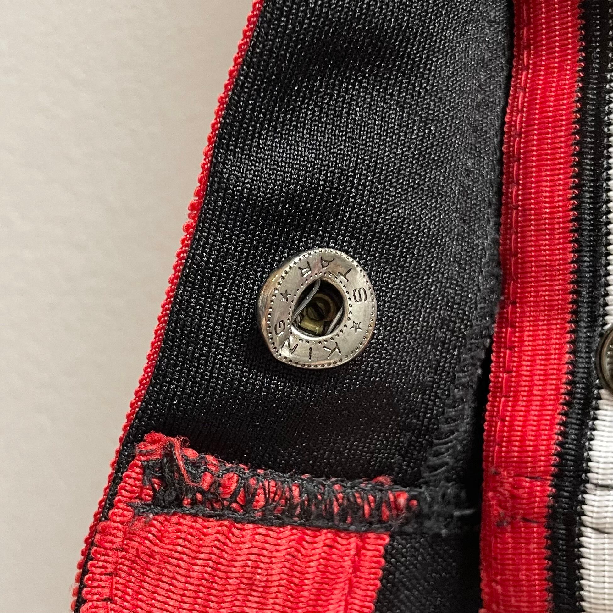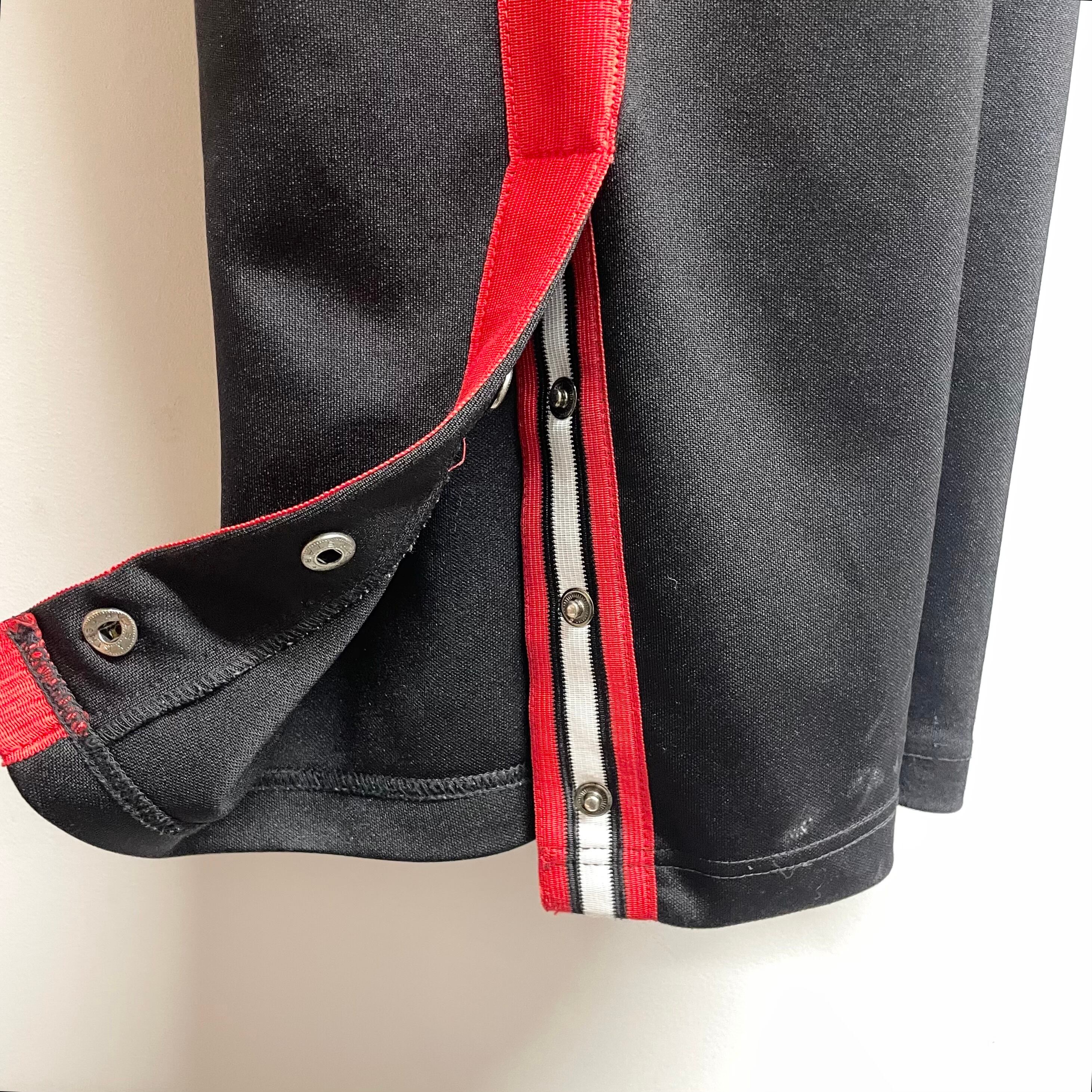 ブラックxホワイト/レッドラインのジャージ素材、左足にBLAZERSロゴマーク刺繍、右足にスウォッシュとNBAロゴマーク刺繍、ウエストの中心にロゴマークネーム、ハンドウォームポケット、裾の両サイドに3つスナップボタンで開閉するバスケット用デザインです。