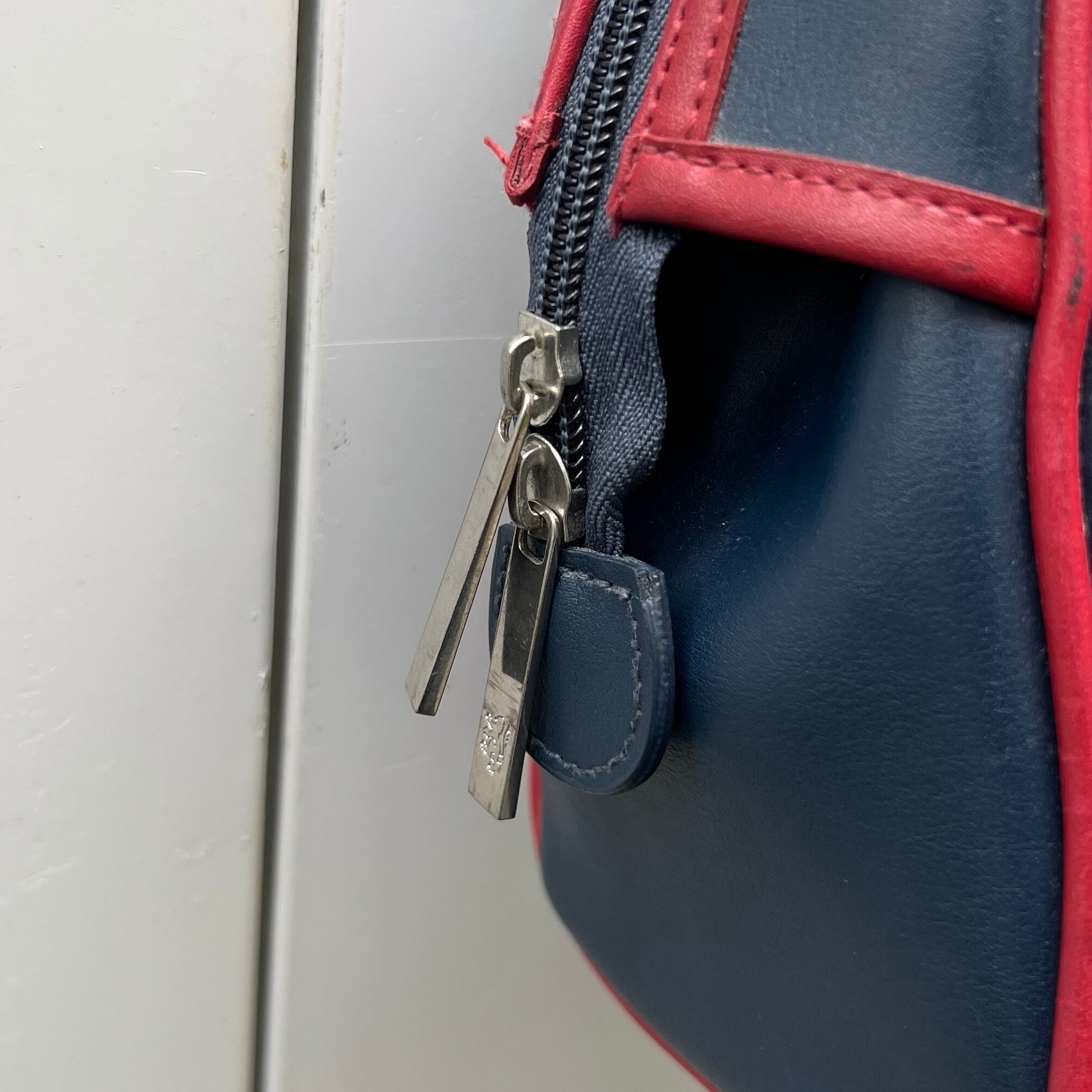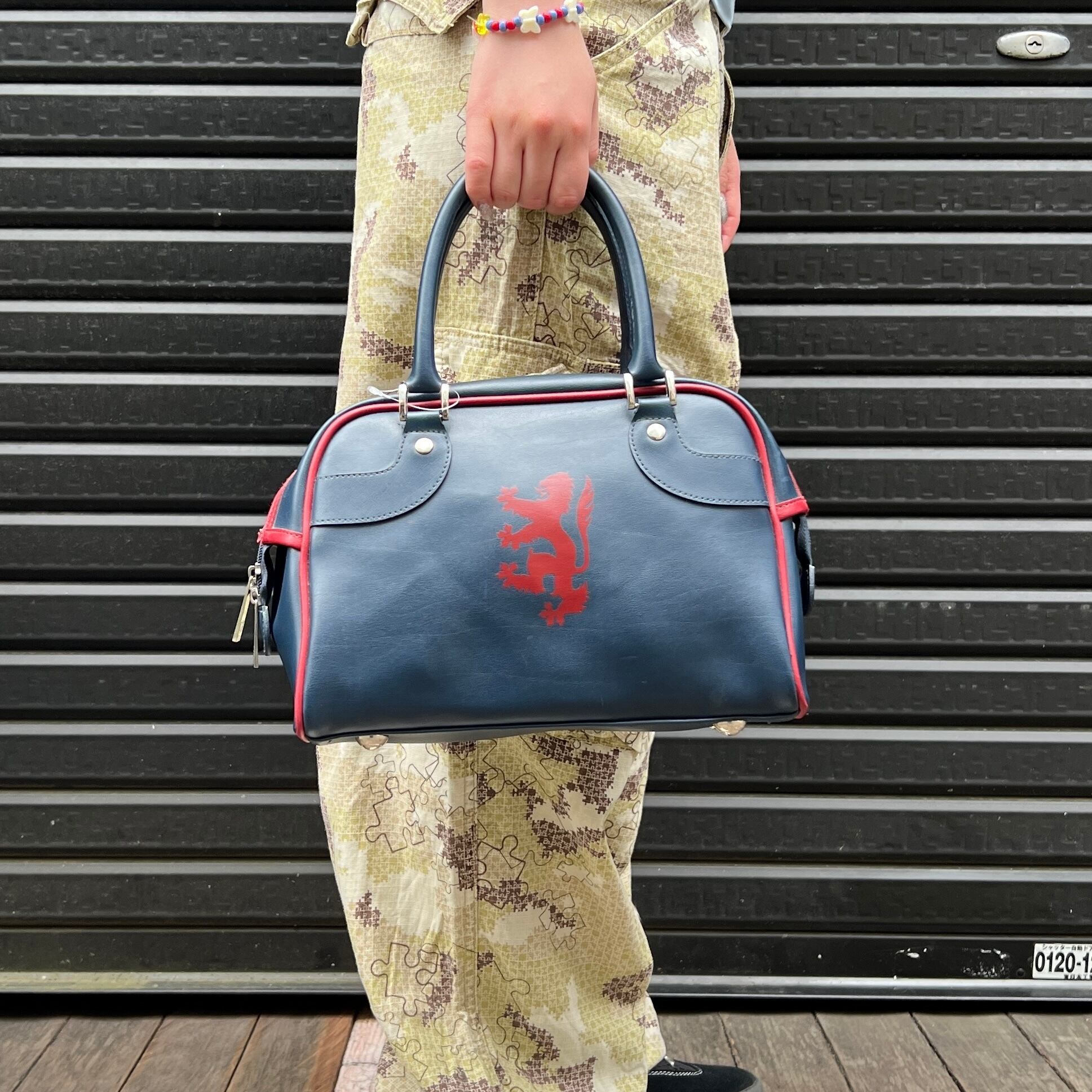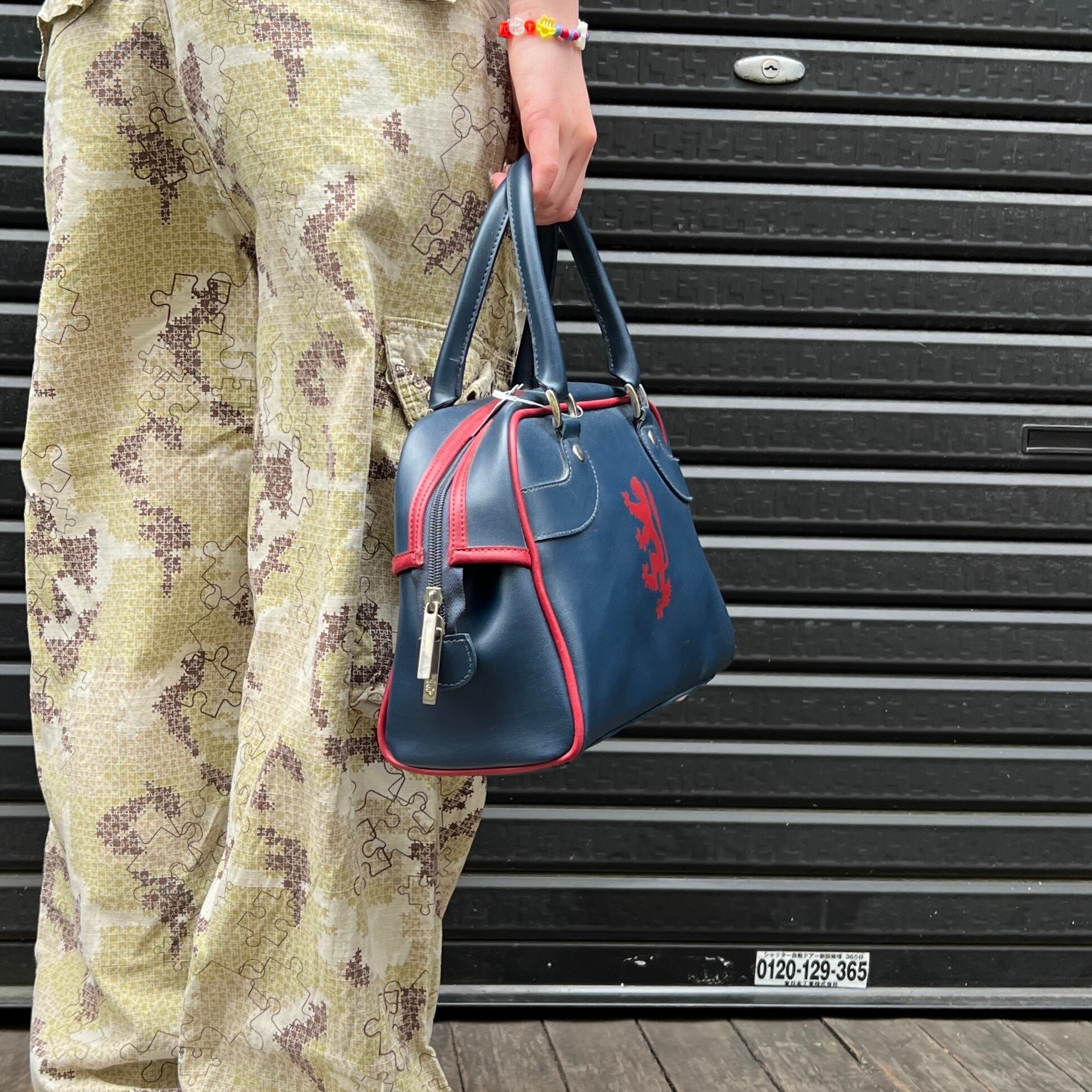 ネイビーxレッドラインのPV系素材、フロントにロゴマークプリント、ジッパー付き内ポケット、ロゴ入りジッパースライダーが付いたボストン型デザインです。