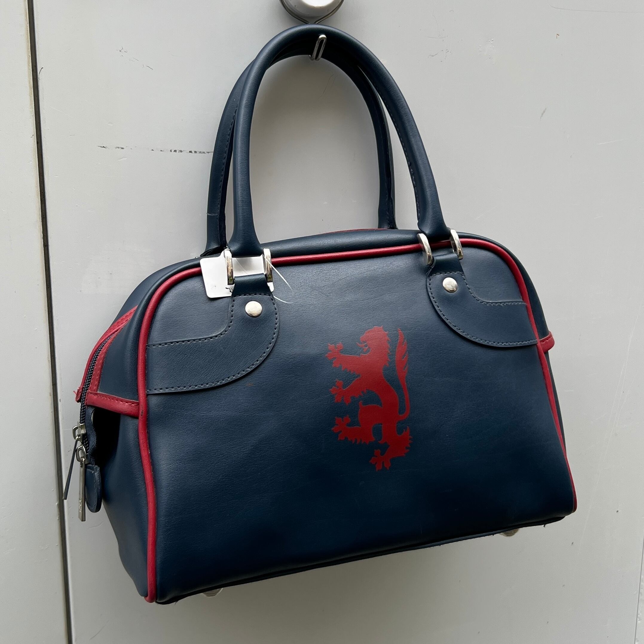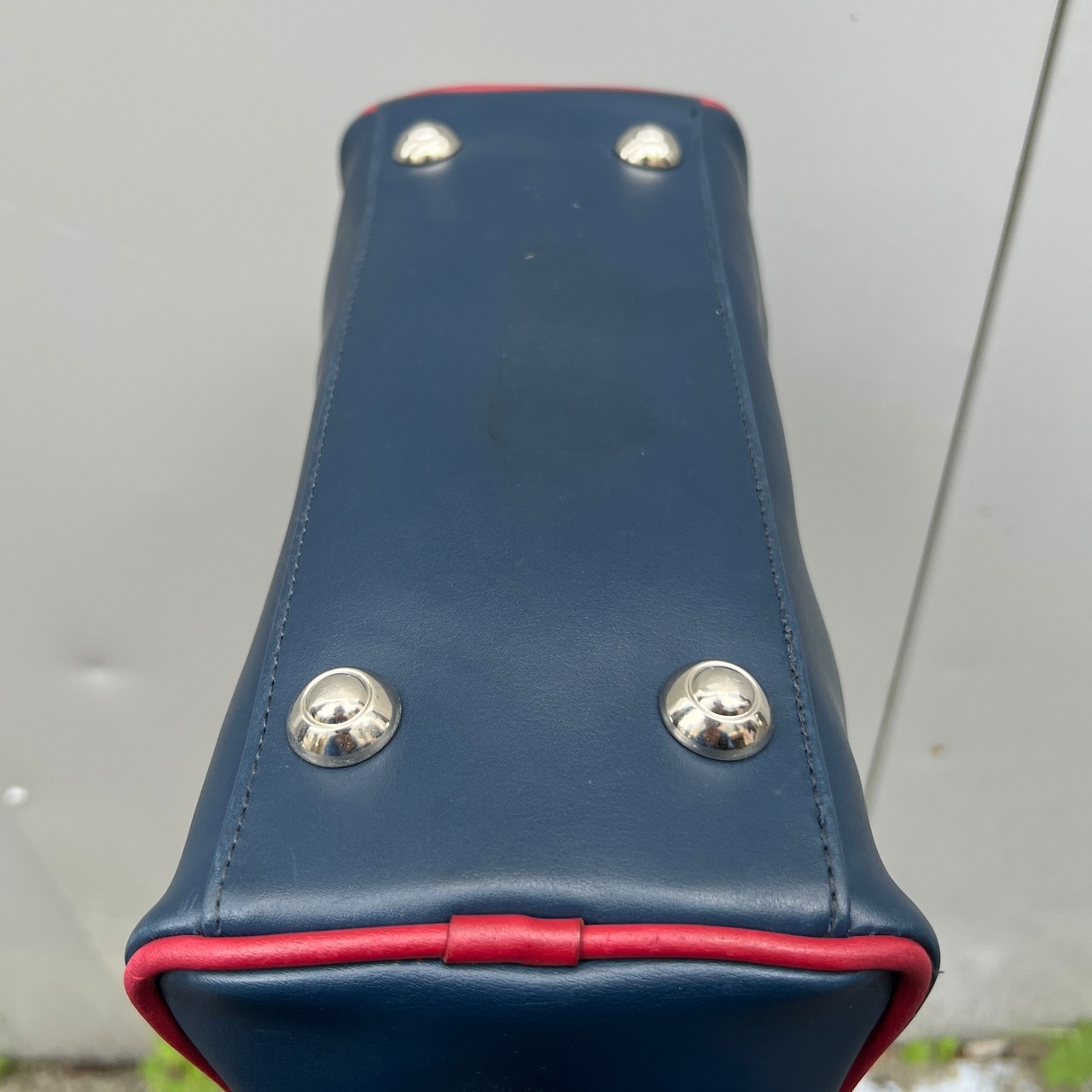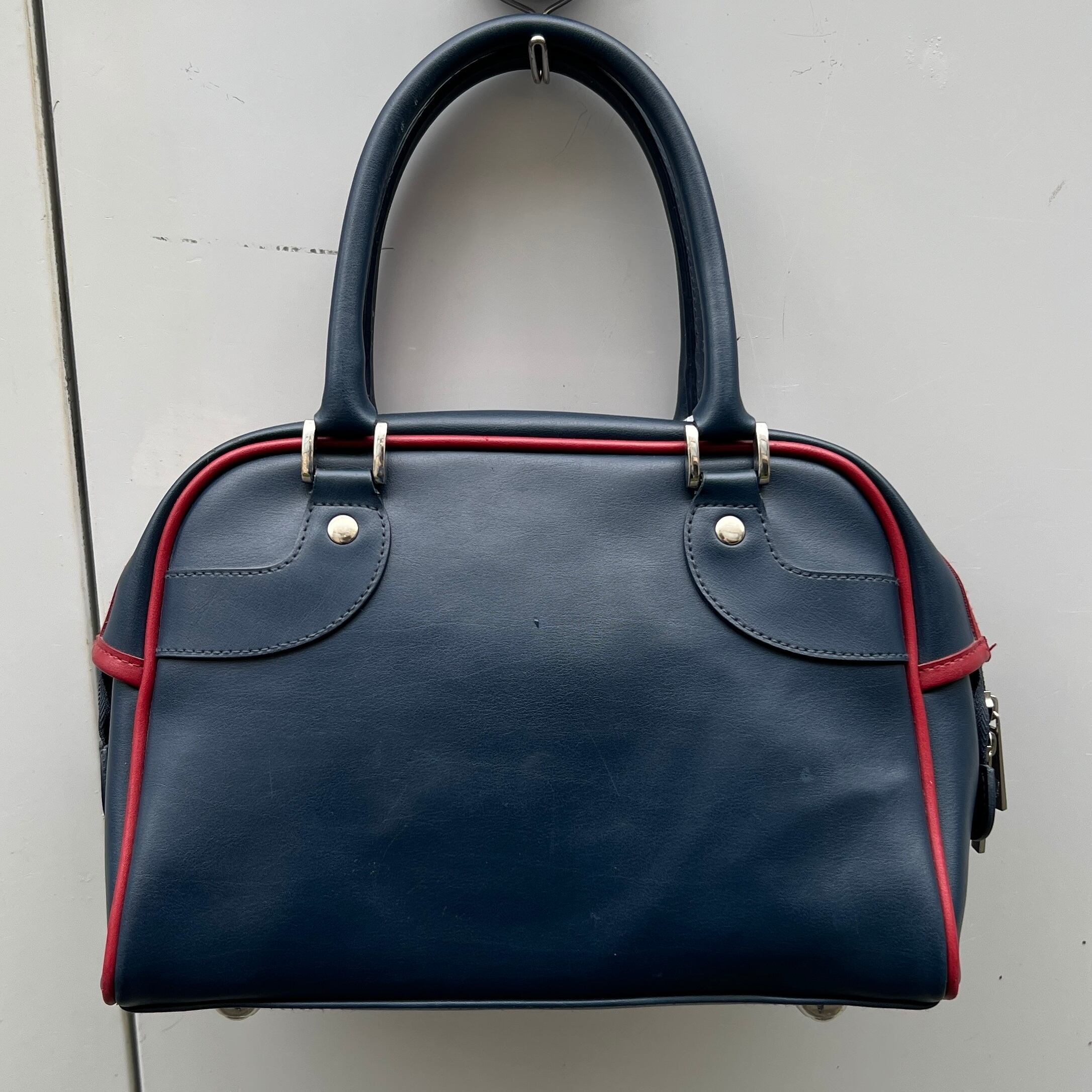 ネイビーxレッドラインのPV系素材、フロントにロゴマークプリント、ジッパー付き内ポケット、ロゴ入りジッパースライダーが付いたボストン型デザインです。