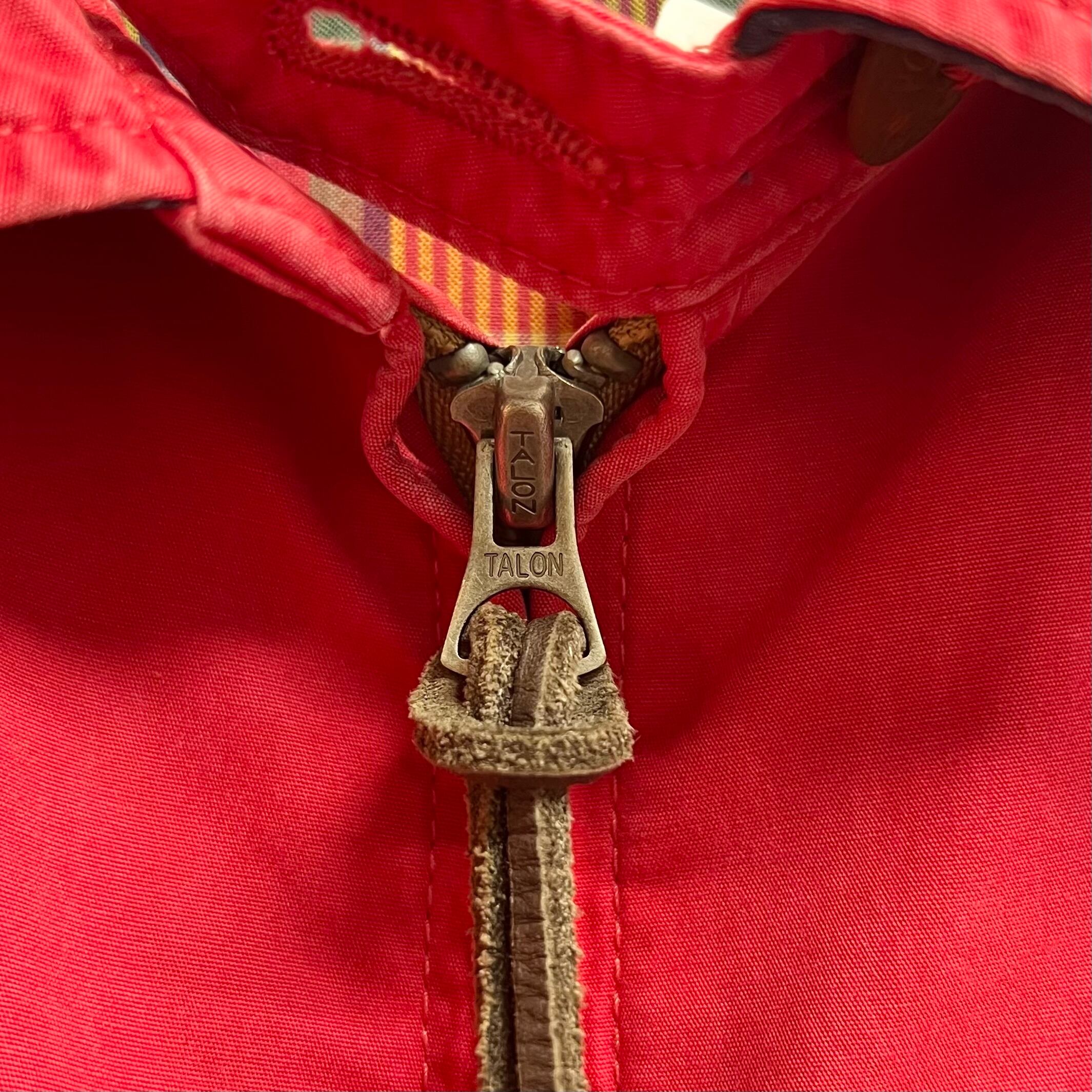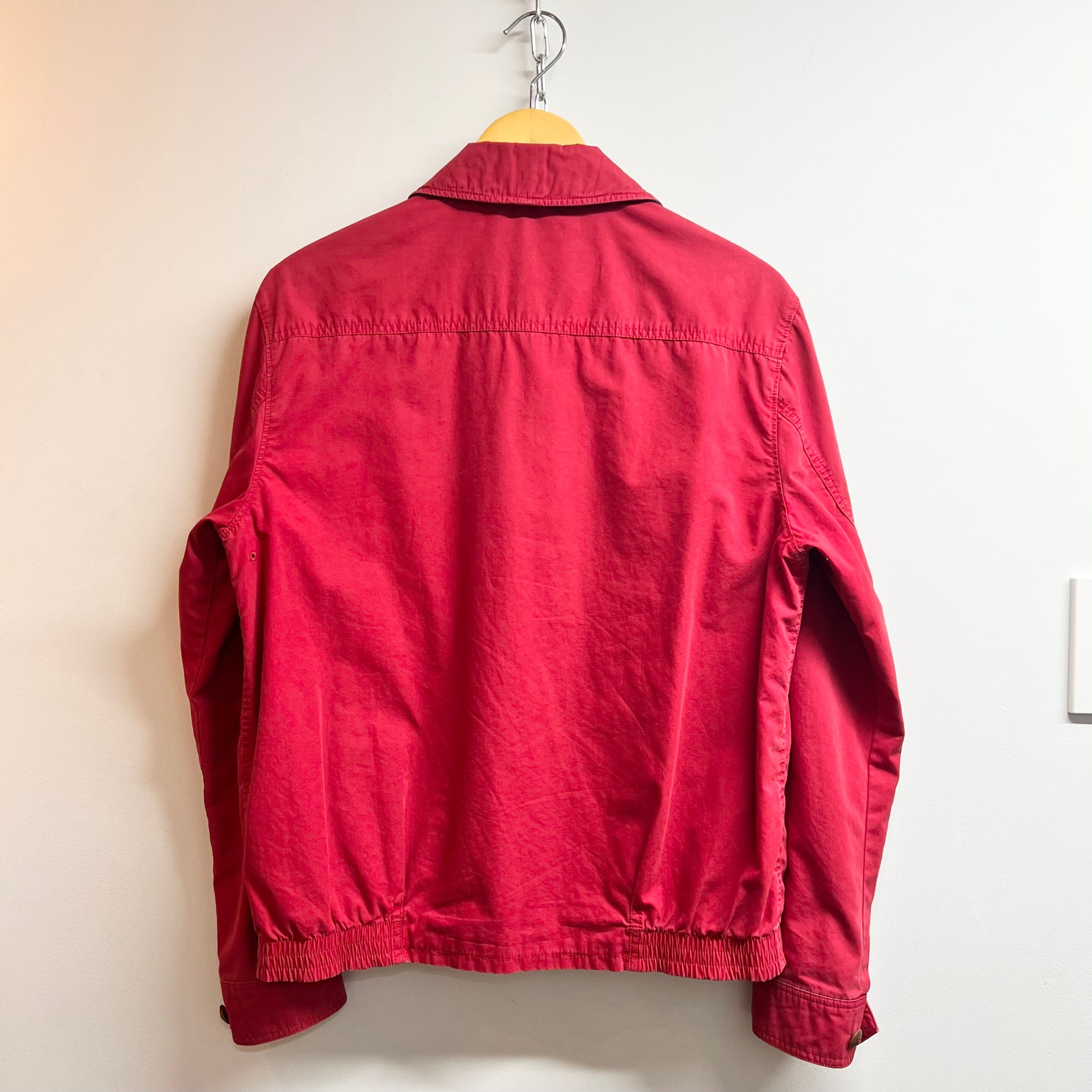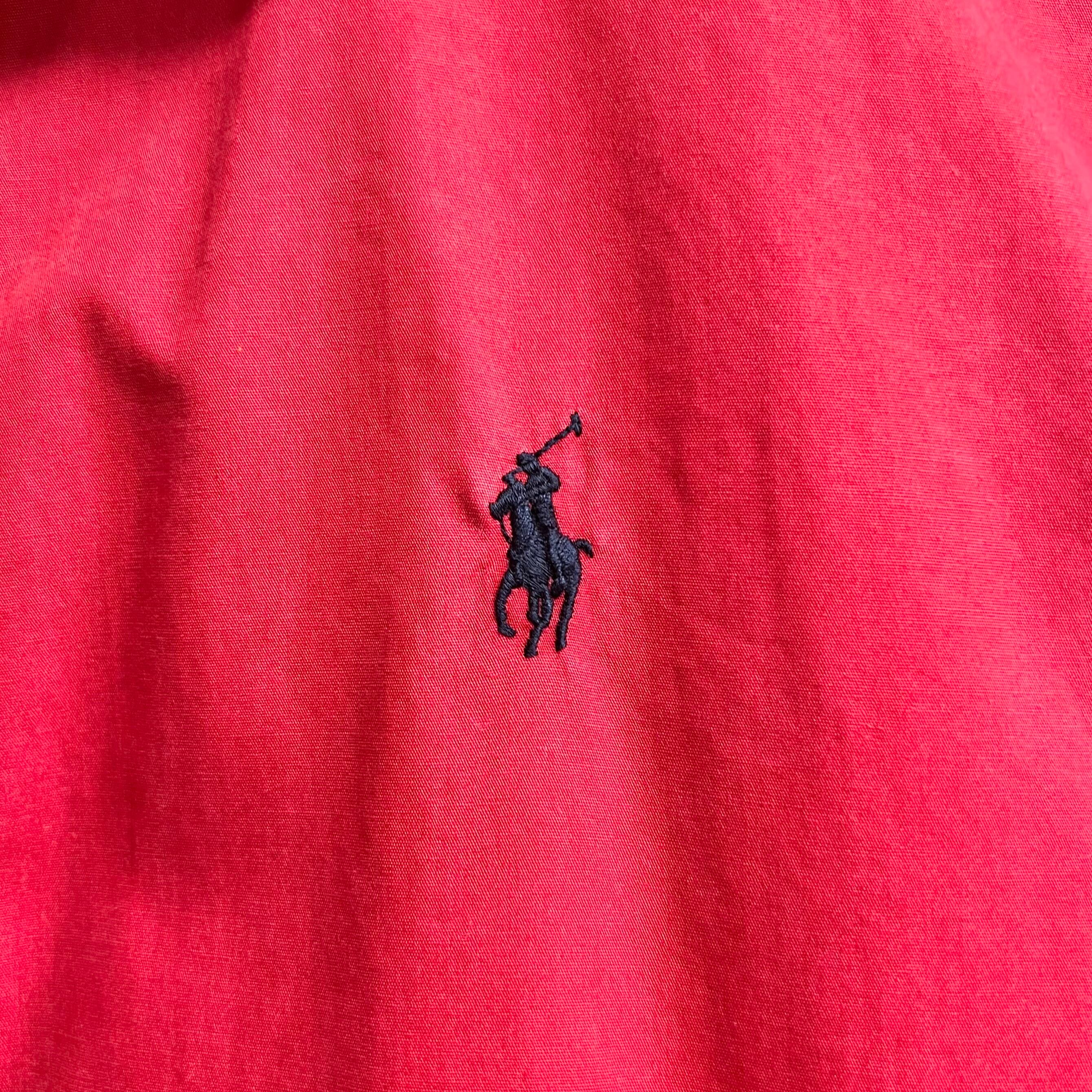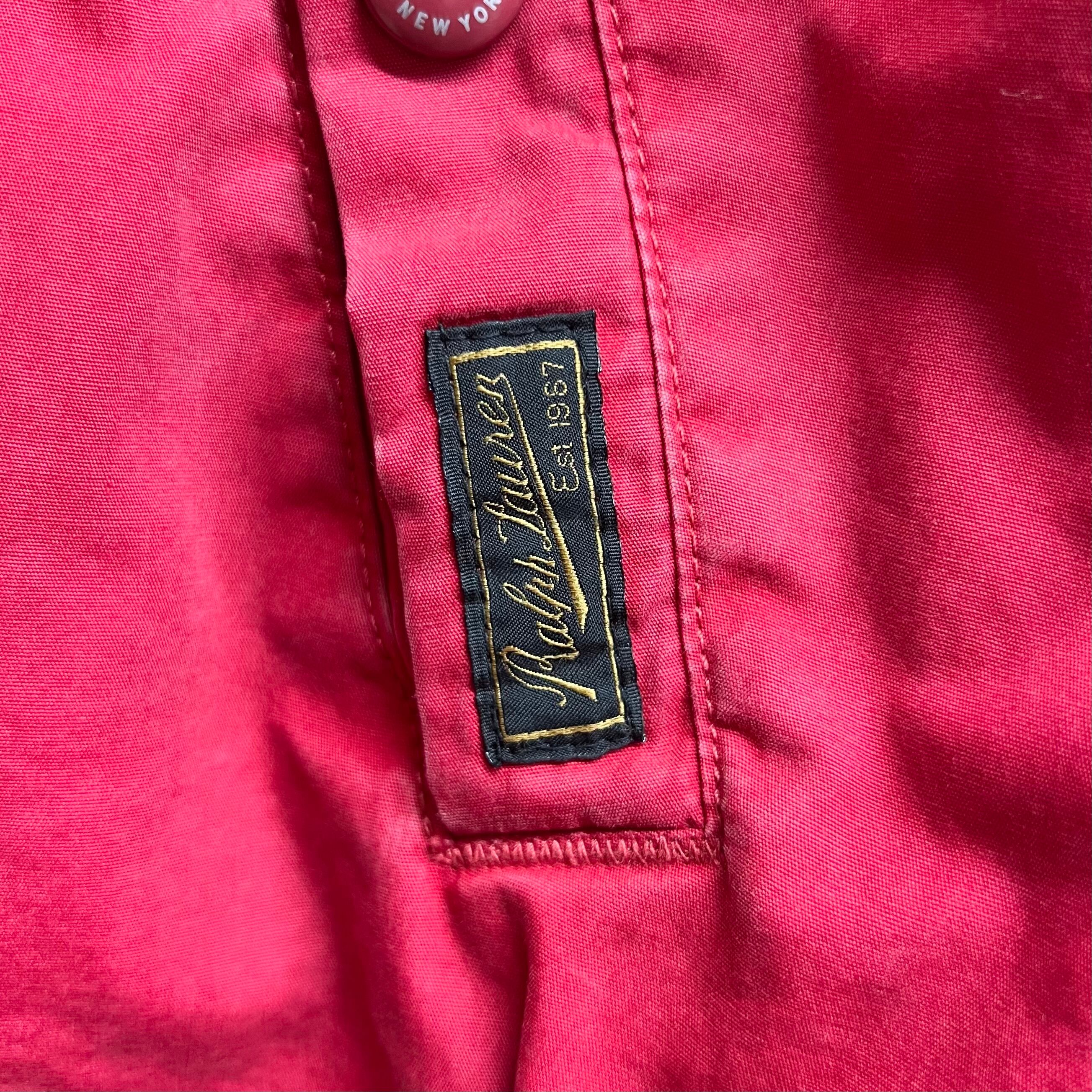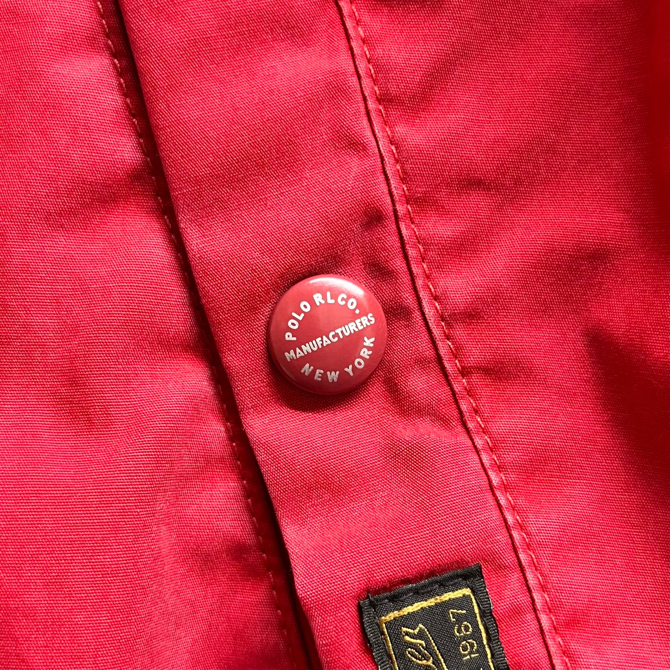 レッドのコットン素材、左胸にポニー刺繍、左ハンドウォームポケットにネーム、ロゴ入りスナップボタン、チェック裏地のデザインです。