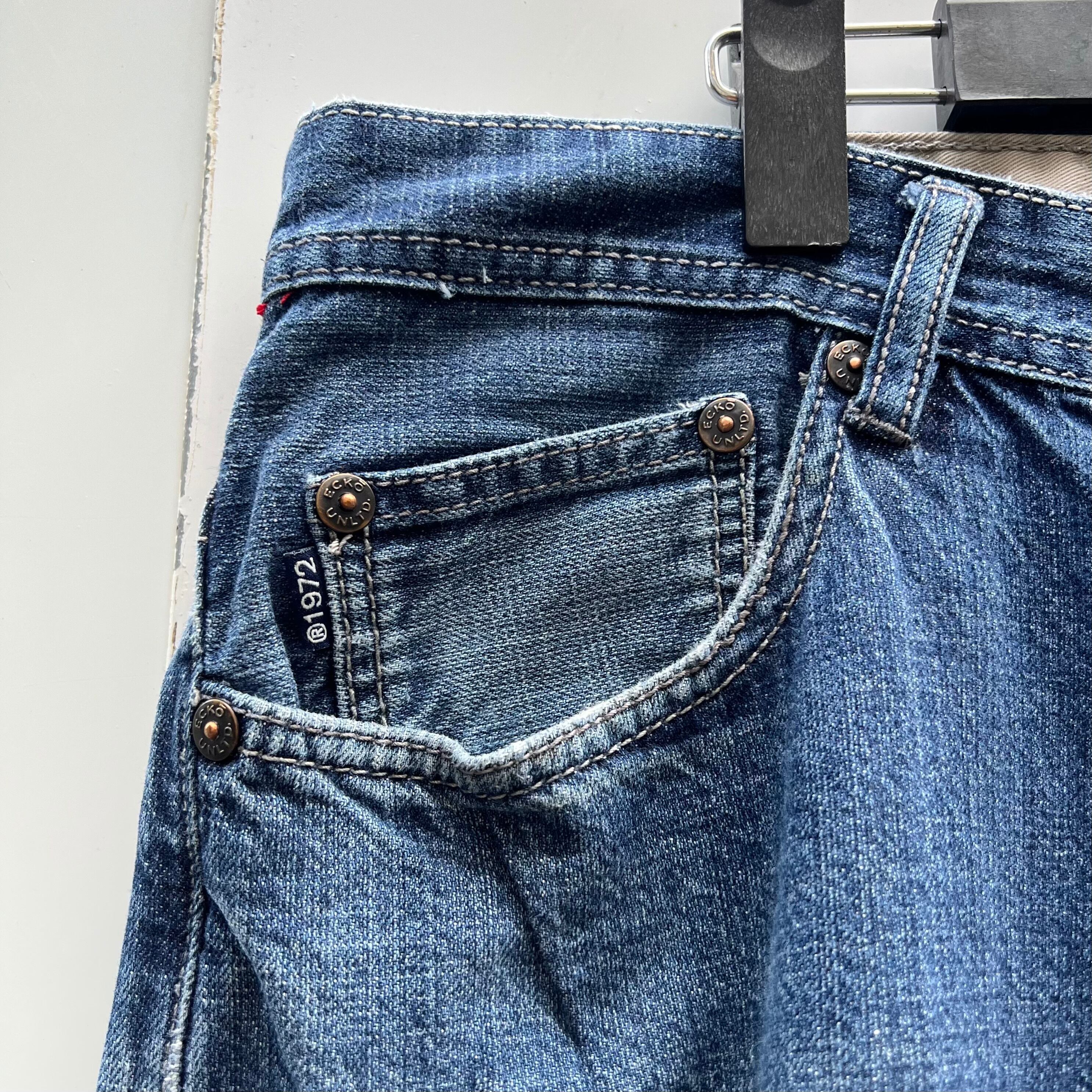 ウォッシュドブルーデニム、両バックポケットにステッチ、右バックポケットにネーム、コインポケットにピスネーム、ロゴ入りボタン、リベット、5ポケット型のスタンダードデザインです。