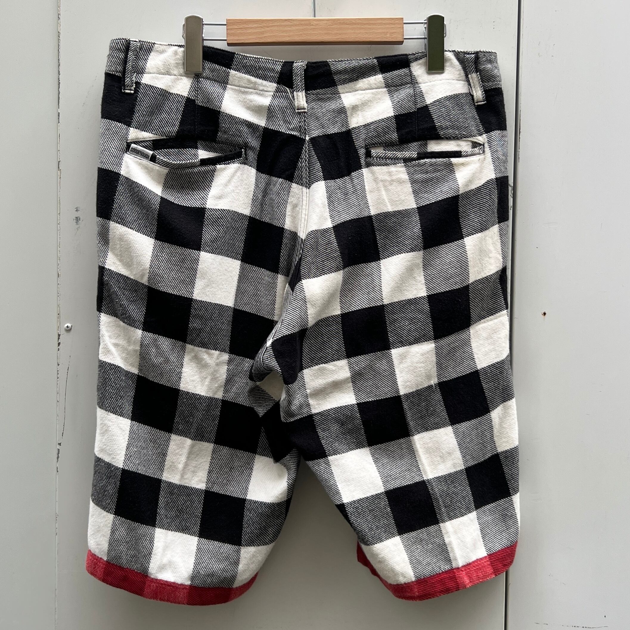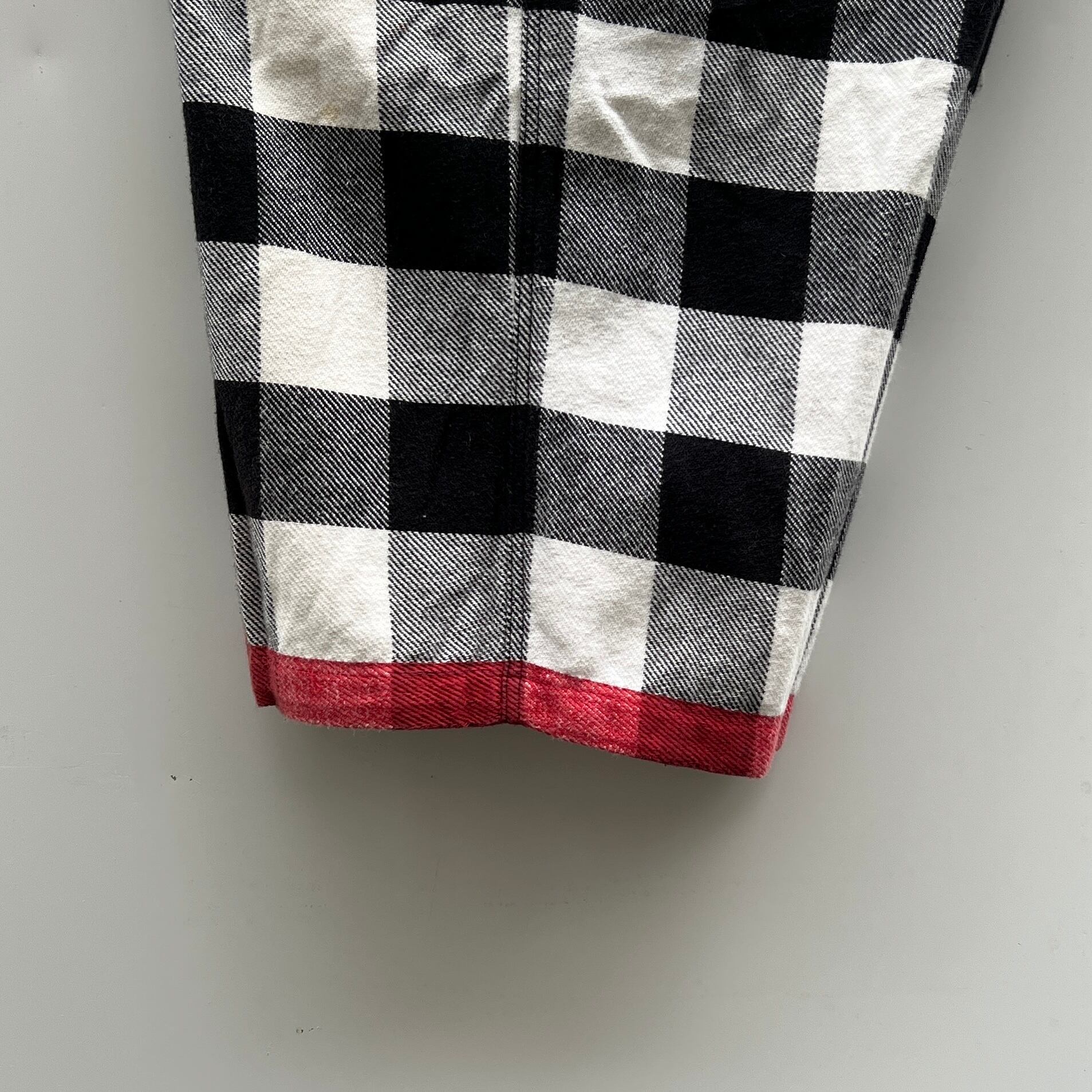 ブラックxホワイトのブロックチェック/レッドライン、左バッグポケット上にピスネーム、4ポケットのトラウザー型デザインです。