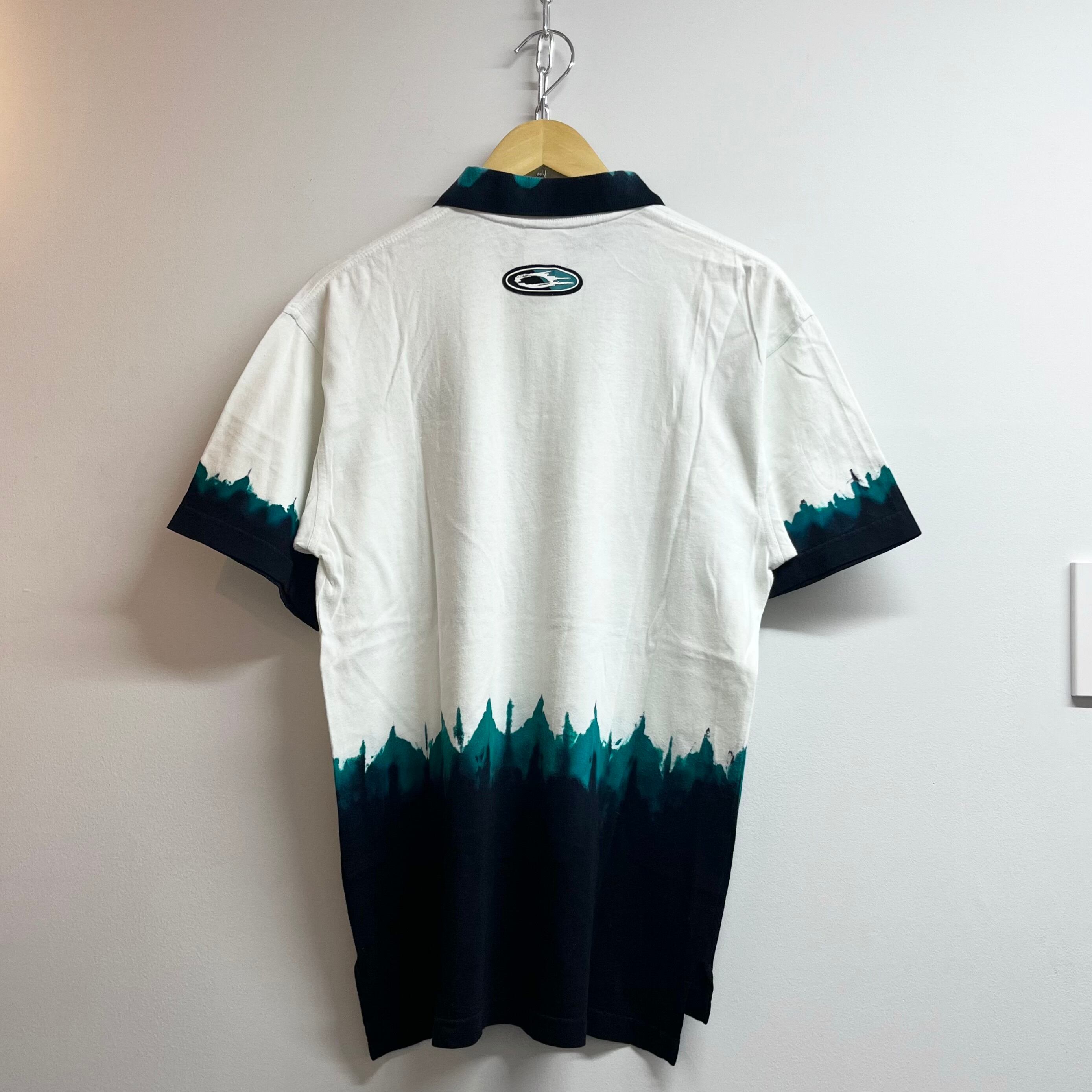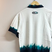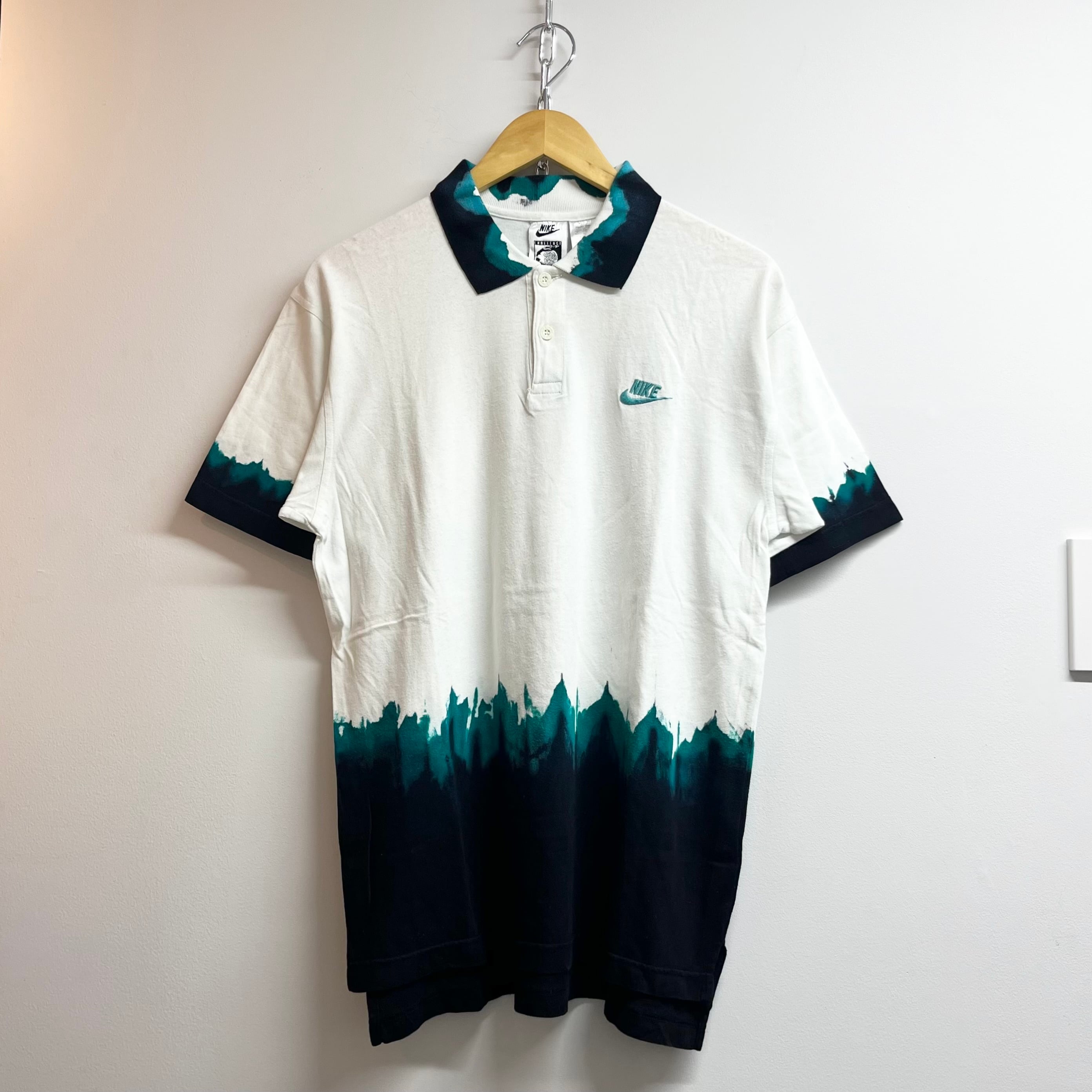 ホワイトxブラック/グリーンの染柄、左胸にNIKEロゴ刺繍、襟、両袖、裾に染柄、バック襟元にラバーのロゴマークワッペンが付いたデザインです。