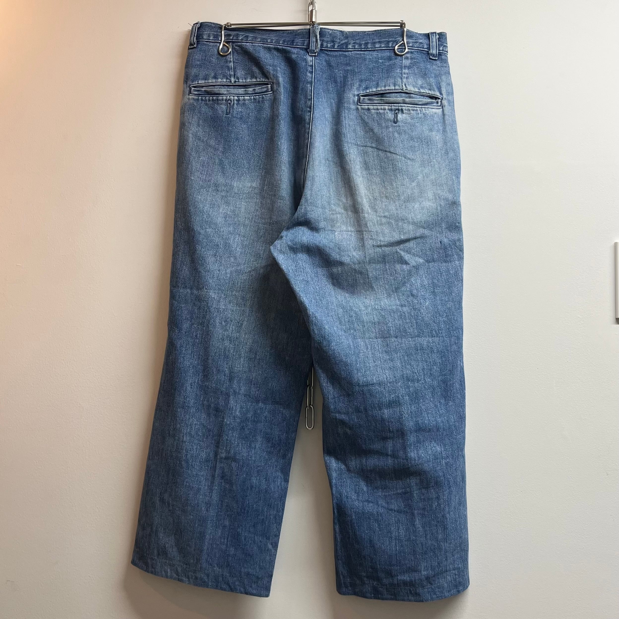 ウォッシュドミディアムカラーのライトオンスデニム、2タックのスラックス型デザインです。