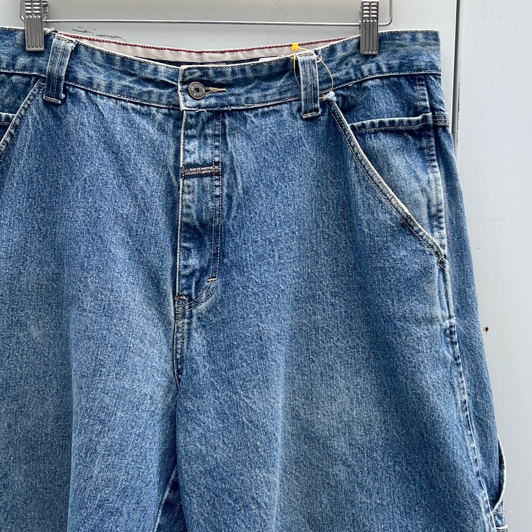 ウォッシュドブルーデニム、フロントボタン下にネーム、両足に2つのサイドポケット、右サイドポケットにロゴ刺繍、ロゴ入りボタン、リベット、ダブルコインポケットの付くデザインです。