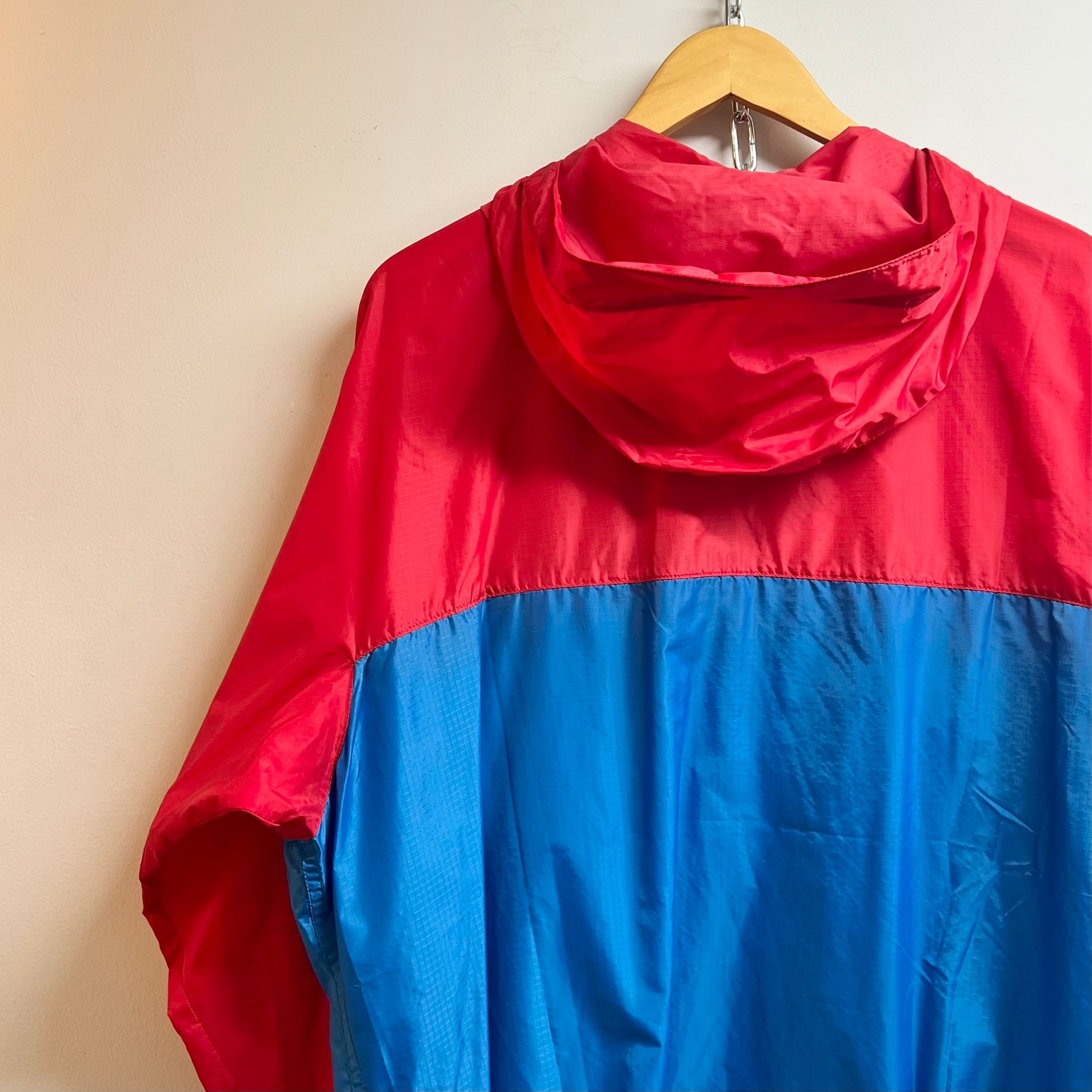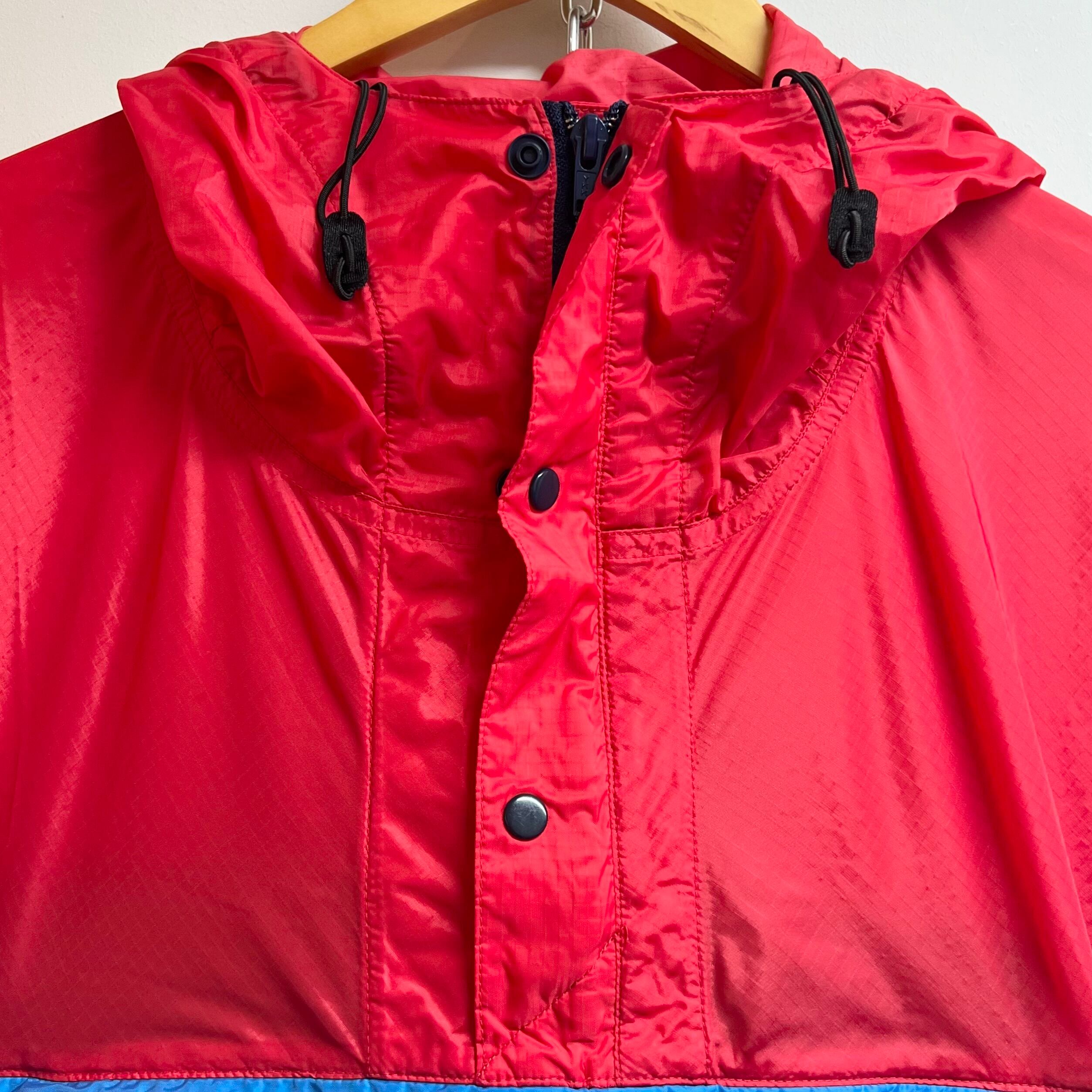 レッドxサックスブルーのナイロンリップストップ素材、左胸にネーム、腹部にパッカブルポケット、フードと裾にドローコードが入るデザインです。