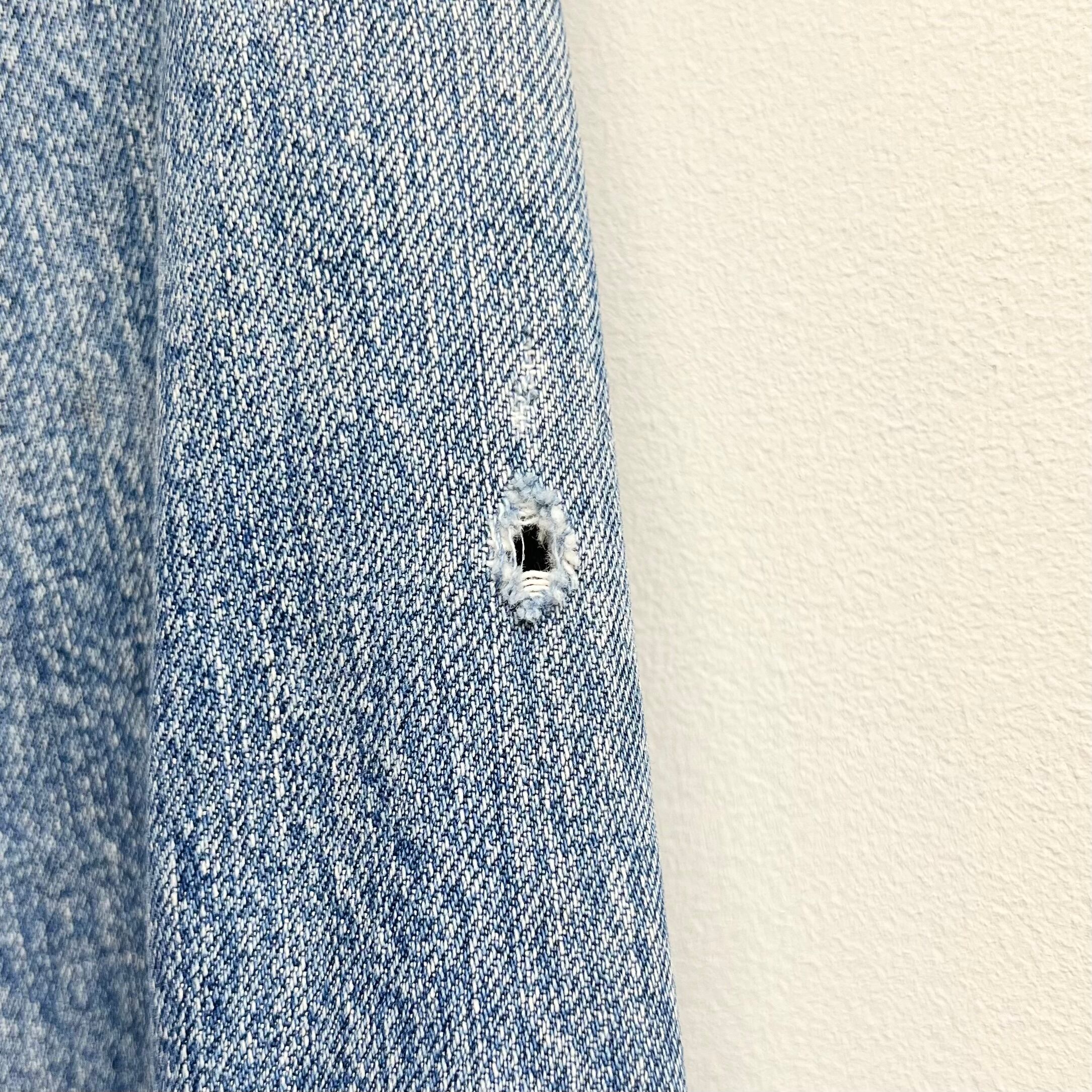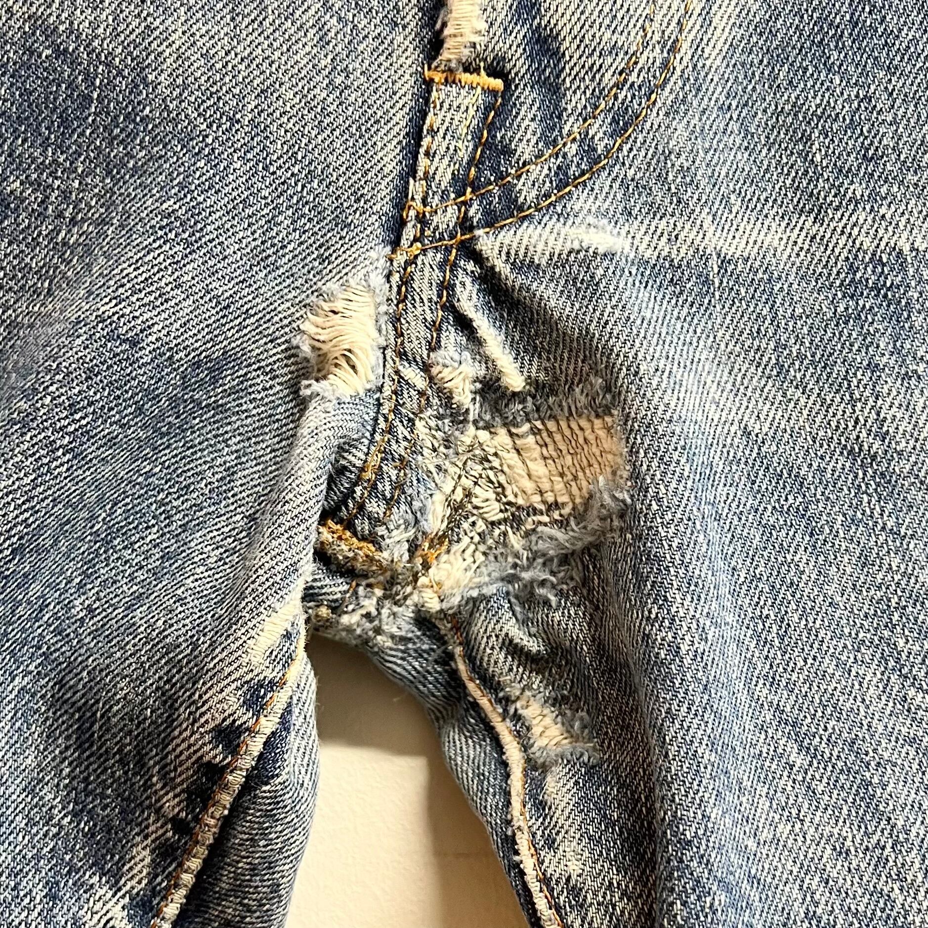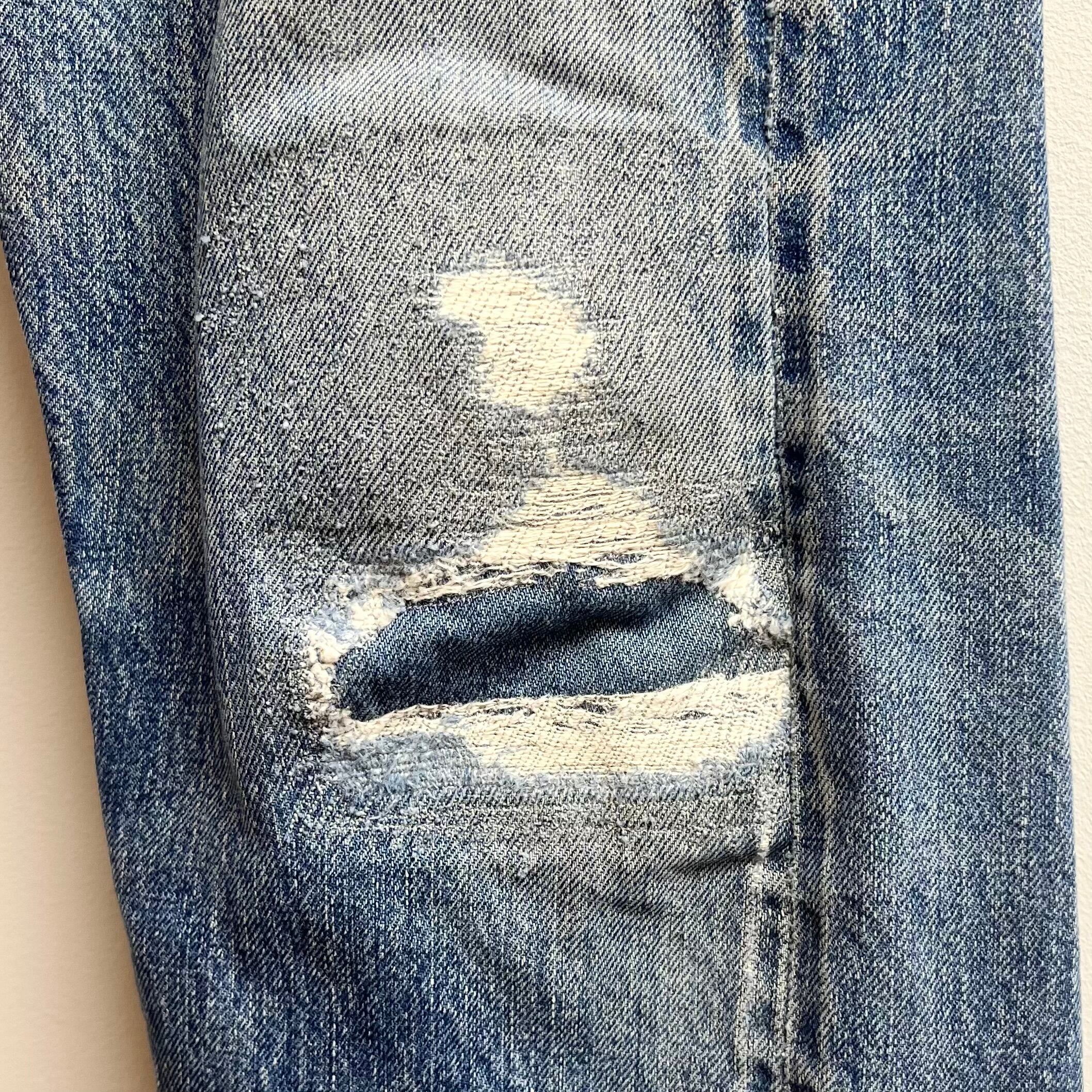 股と右バックポケット下に穴、両膝、股、裾にリペアー跡が見られます。また、赤タブがカットされています。その他、着用感及び細かなダメージが見られますが、着用に支障となるようなヨゴレやダメージは見られません。