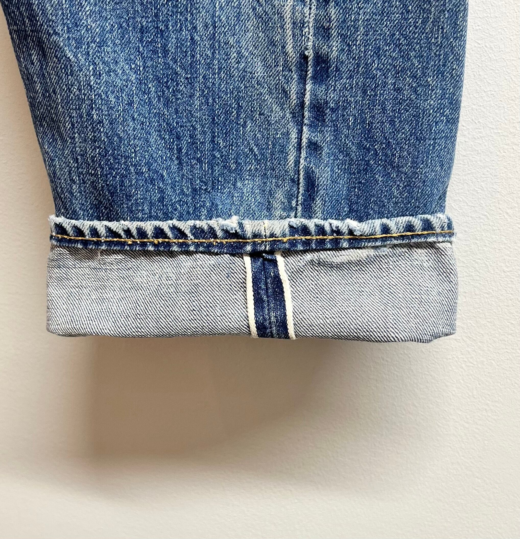 ウォッシュドブルーデニム、フロントボタン裏6、バックポケットシングルステッチ、赤耳、フロントボタンの定番デザインです。