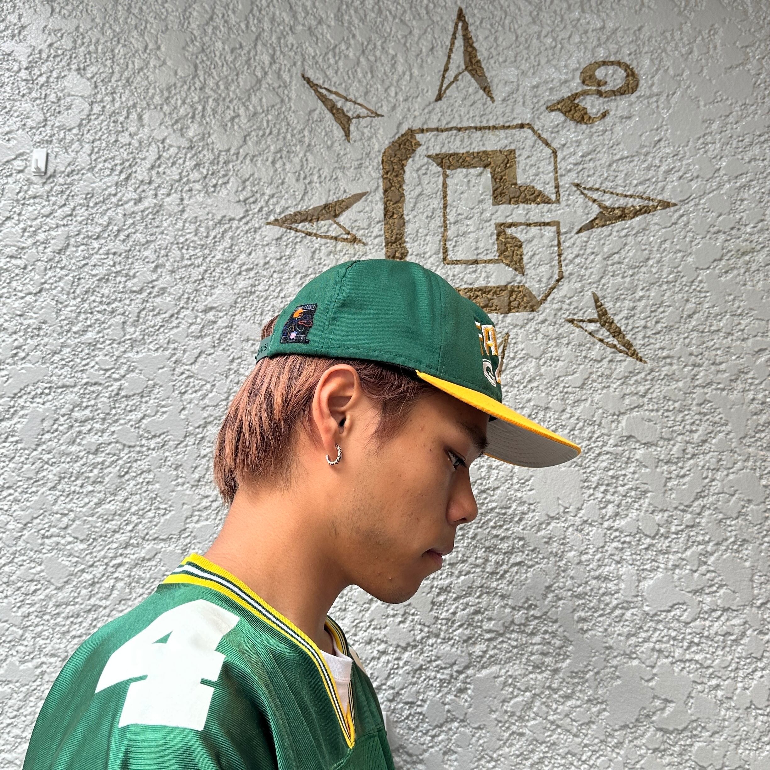 グリーンxイエローのコットン系素材、フロントにFAVRE4とパッカーズロゴマーク、サイン刺繍、バックにQUATERBACK CLUBのフロッキーワッペン、スナップバックアジャスターのシンプルデザインです。