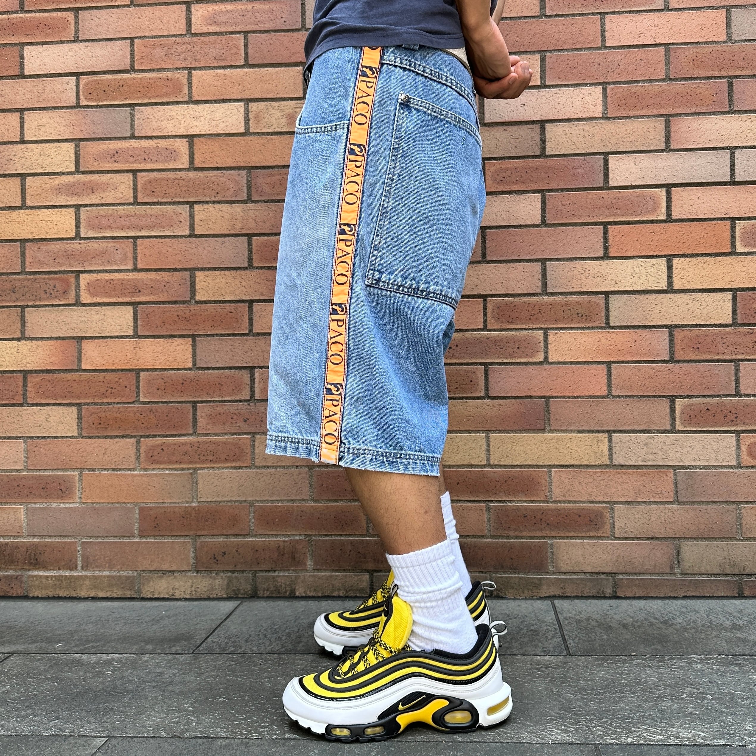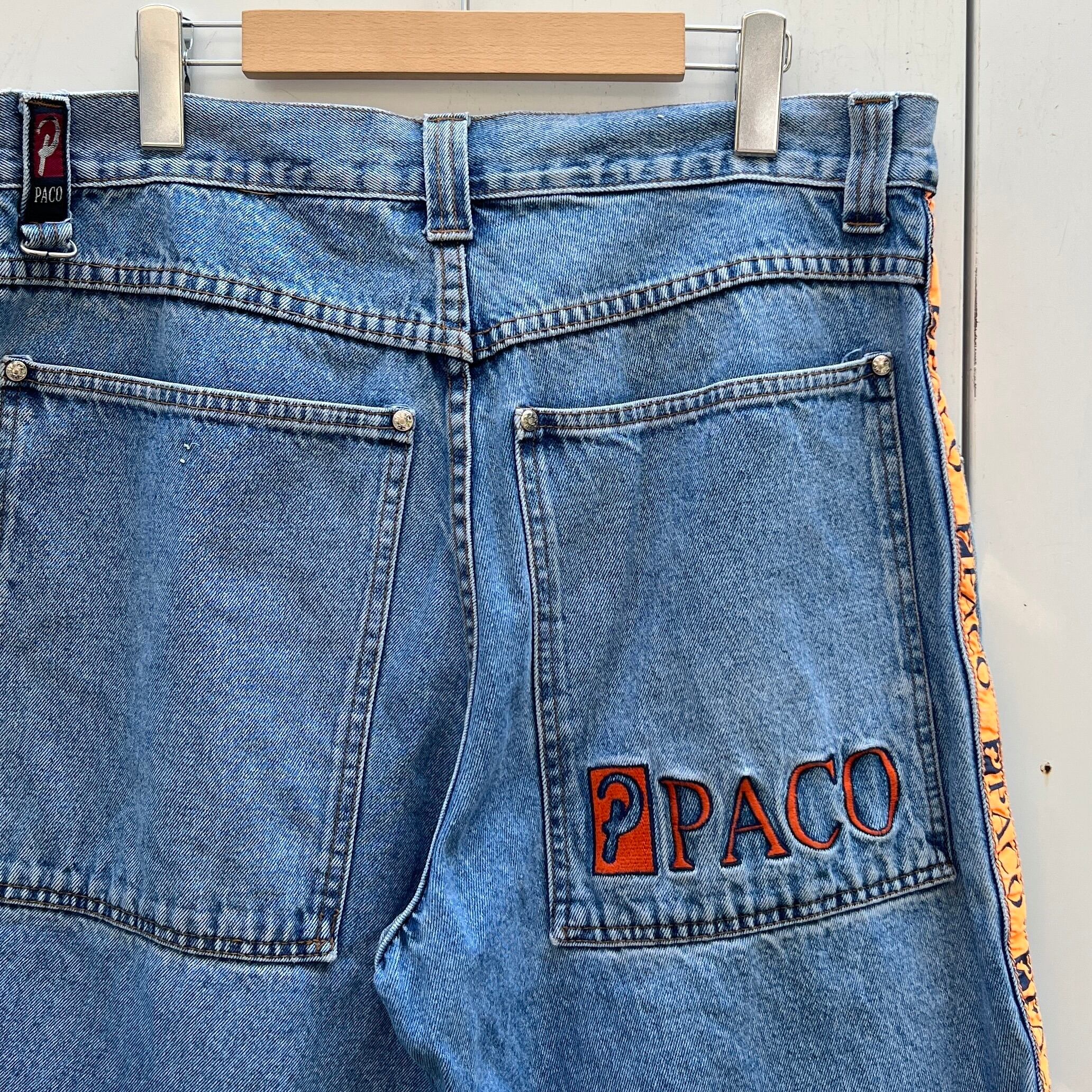 ウォッシュドブルーデニム、右バックポケットにロゴ刺繍、コインポケットにネーム、両サイドにロゴ入りラインテープ、バック左ベルトループ上にロゴネーム、ロゴ入りボタン、リベットが付いたデザインです。