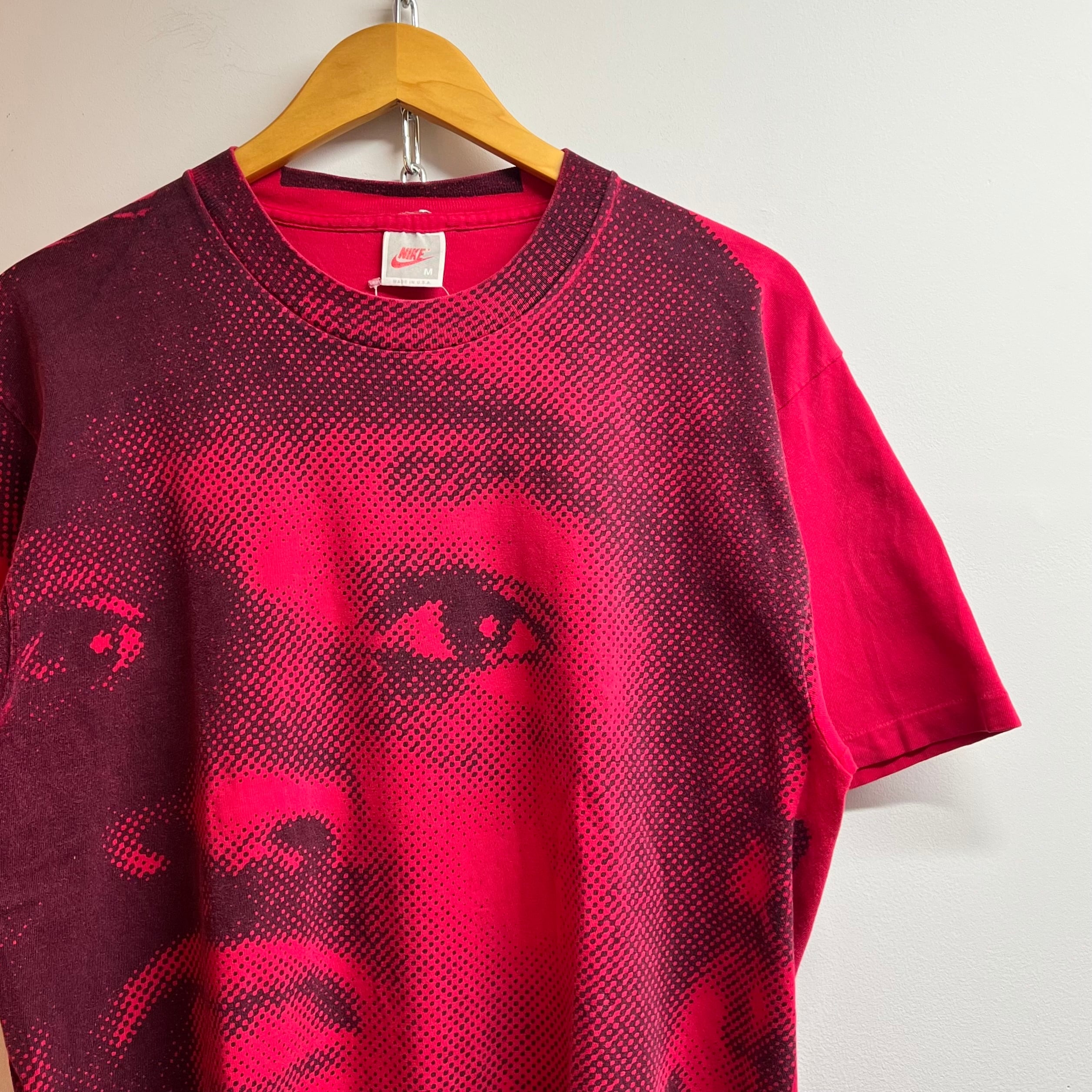 レッドのコットンボディ、フロントに大きくジョーダンの顔のフォトプリント、バックにJORDANとNIKEロゴプリントが入るデザインです。