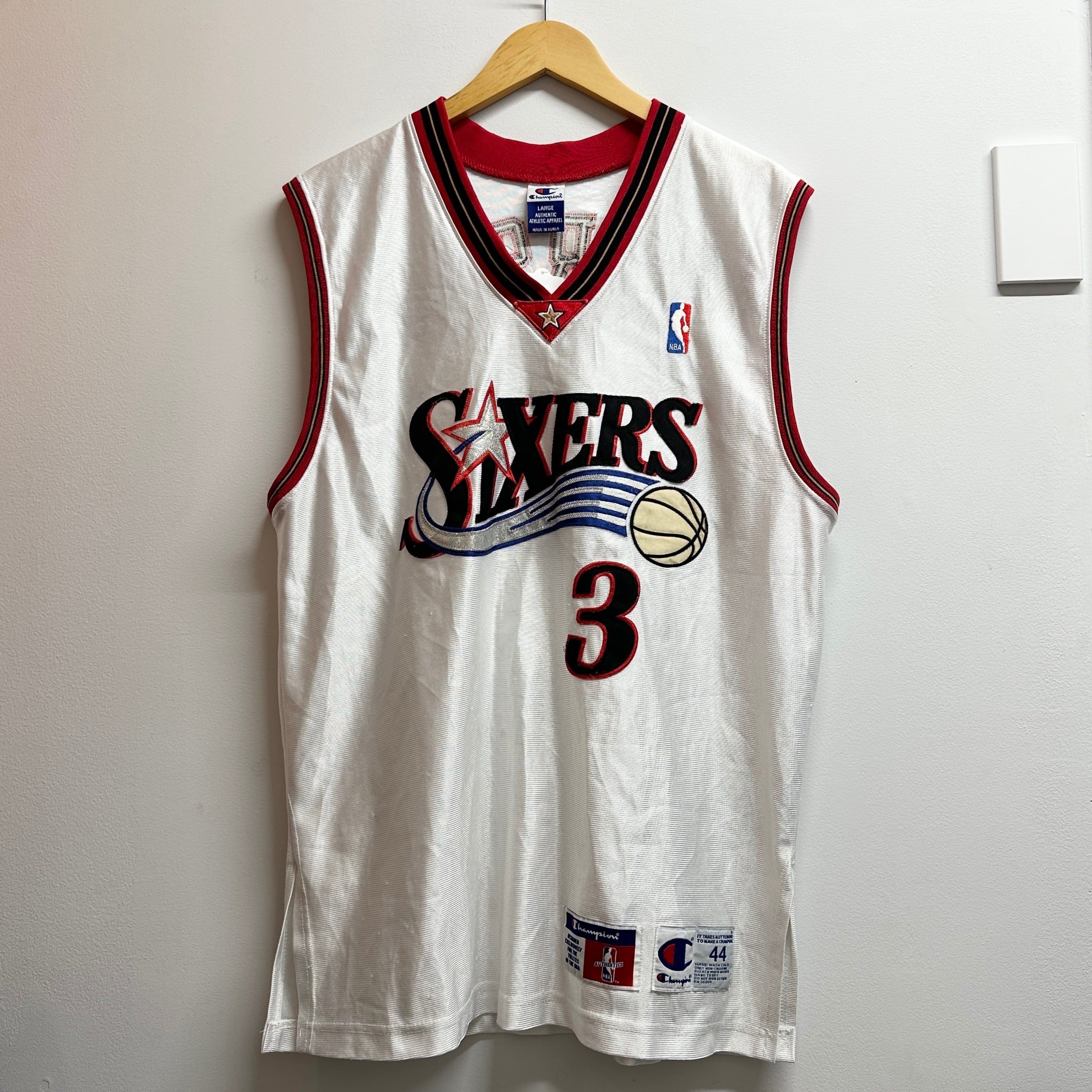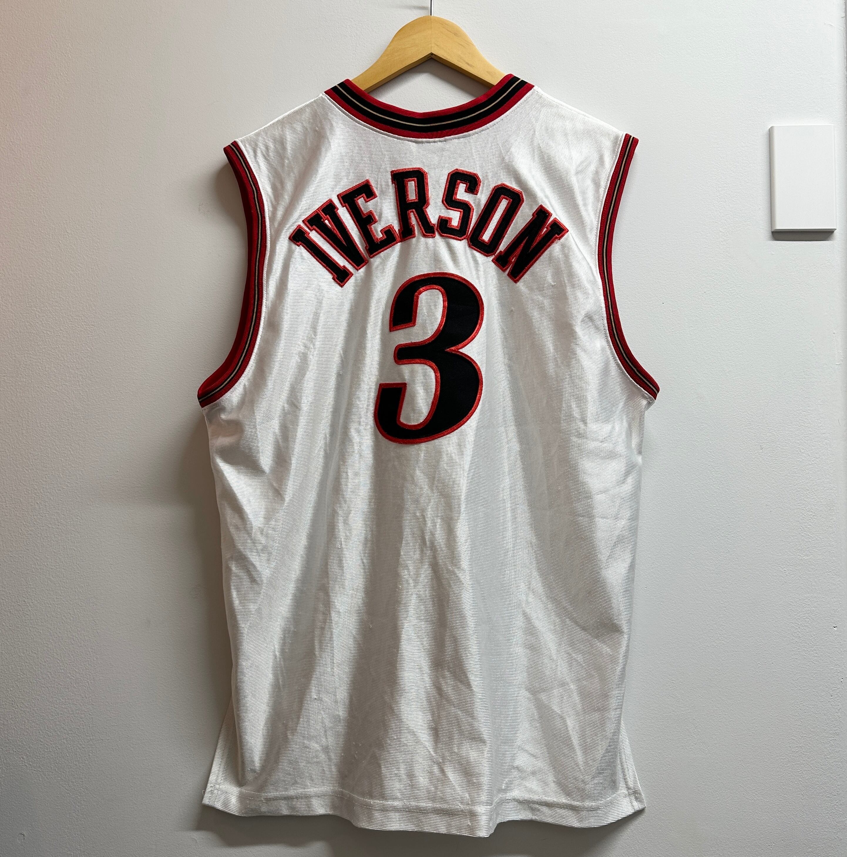ホワイトxレッド/ブラック/ブロンズライン、フロントにSIXERS3ワッペン、左胸にNBAロゴマーク刺繍、バックに大きくIVERSON3のワッペンが付いたデザインです。