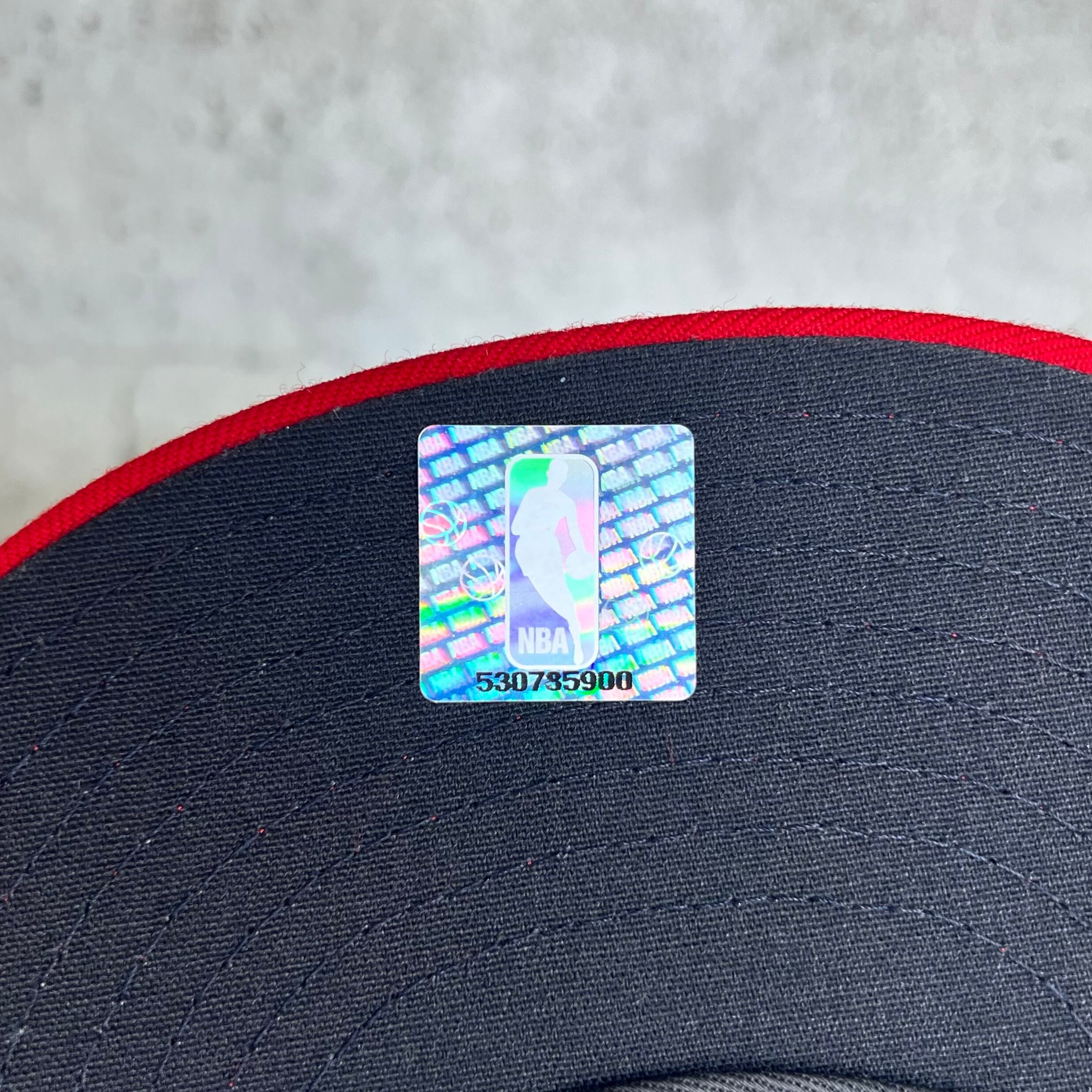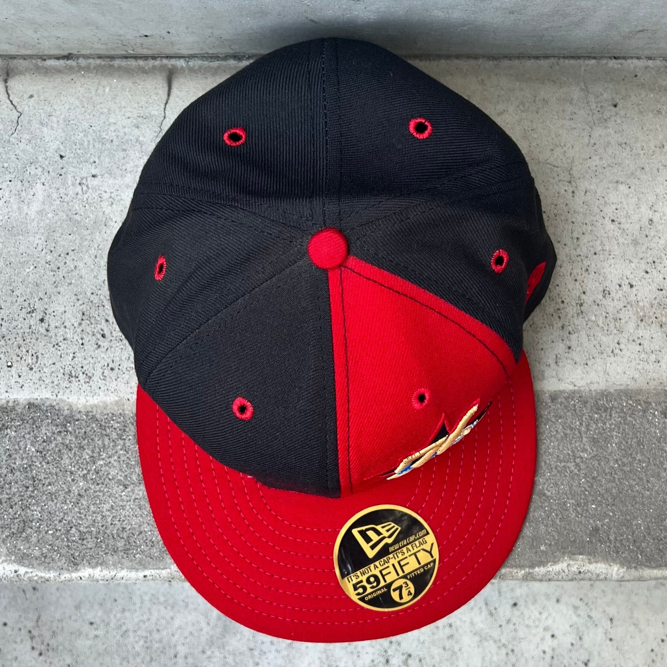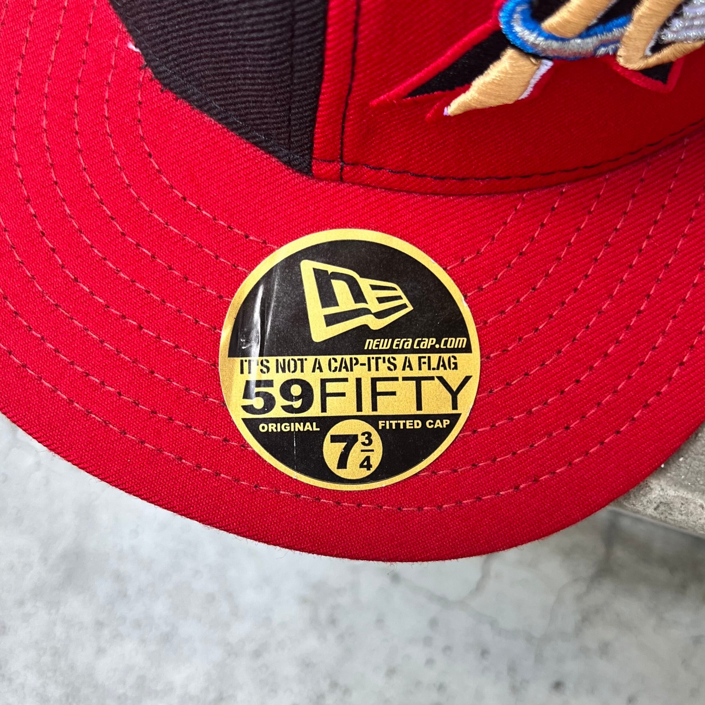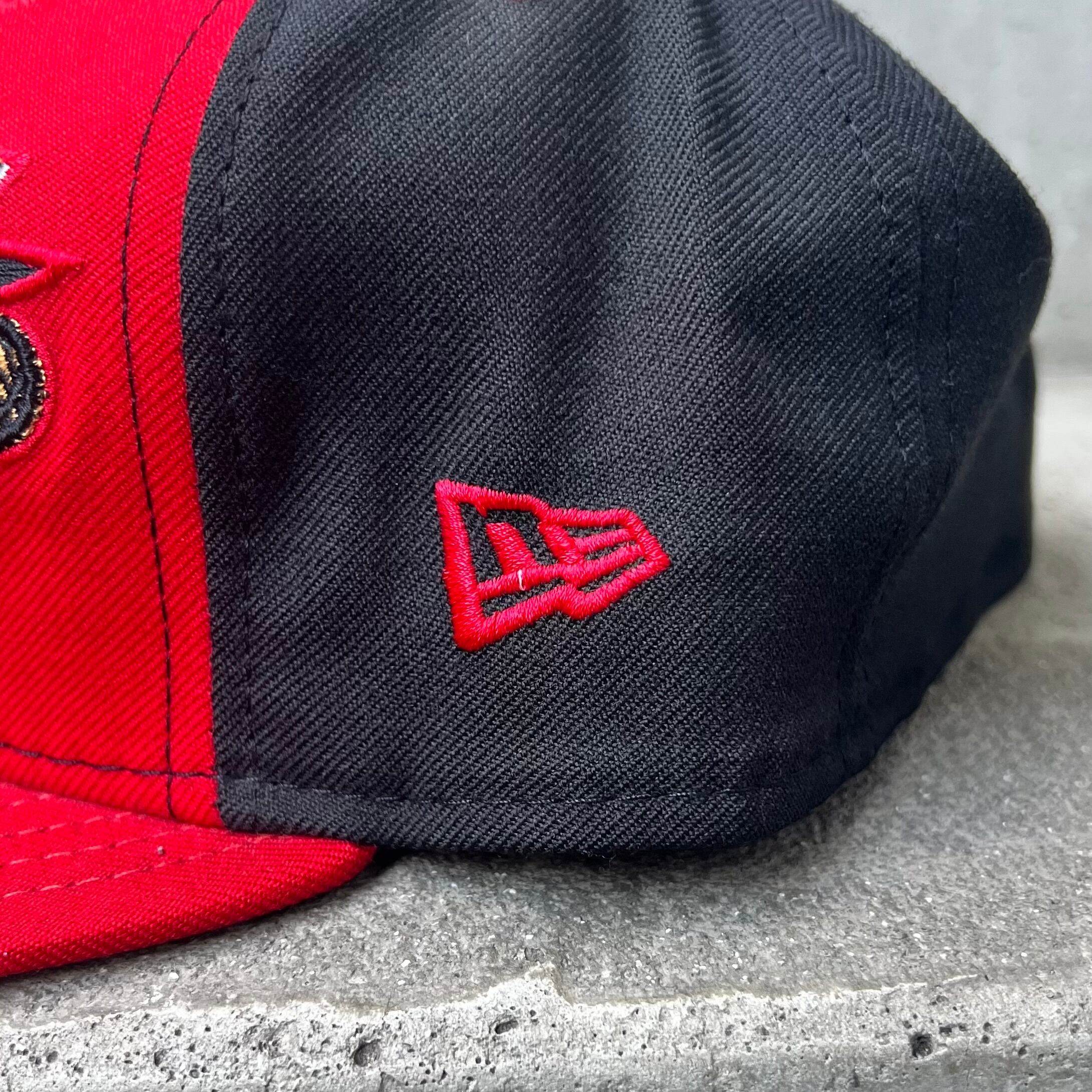 ブラックxレッドのウール素材、フロント左パネルにロゴ刺繍、左サイドにNEWERAロゴマーク刺繍、バックにNBAロゴマーク刺繍、アジャスターの無い59FIFTYのデザインです。