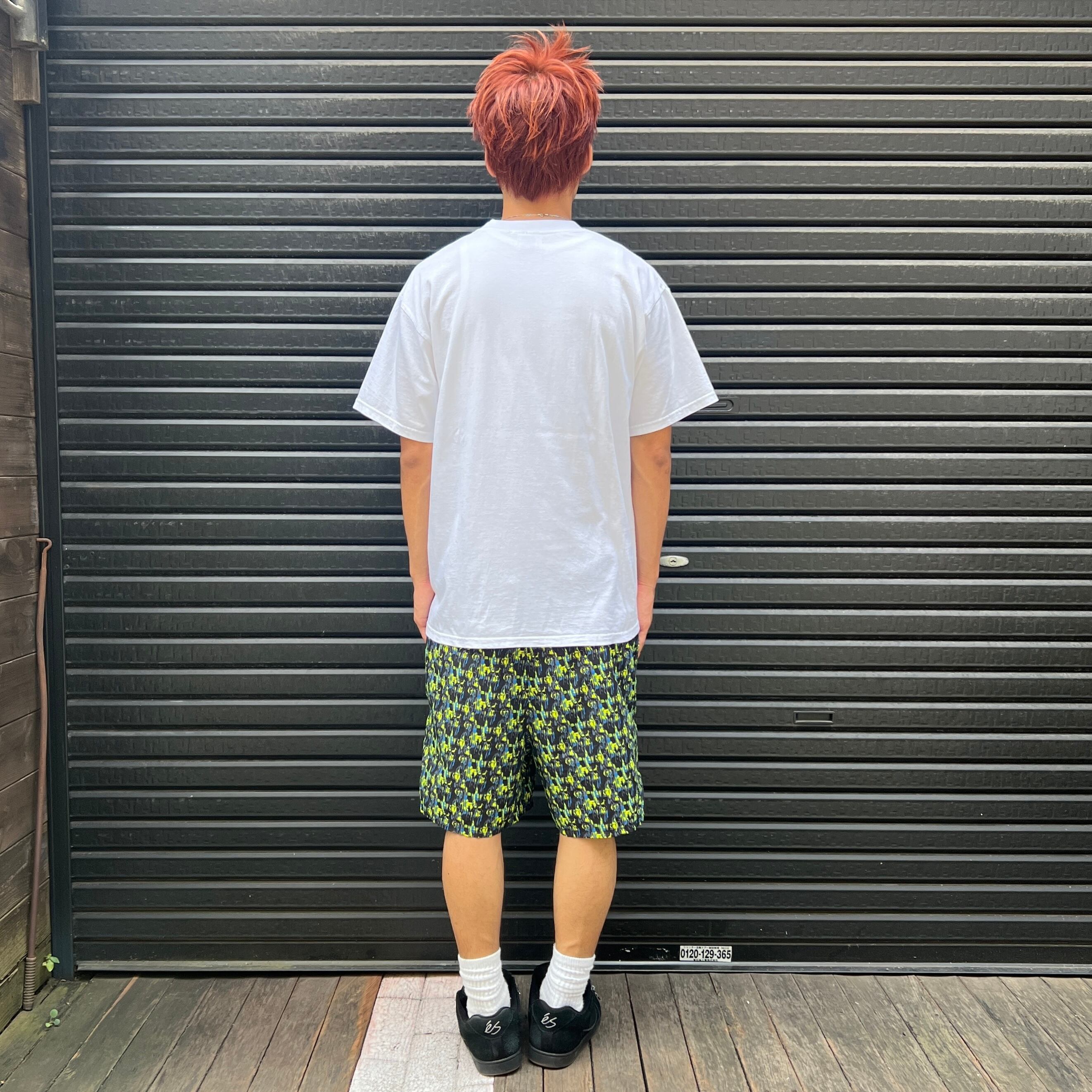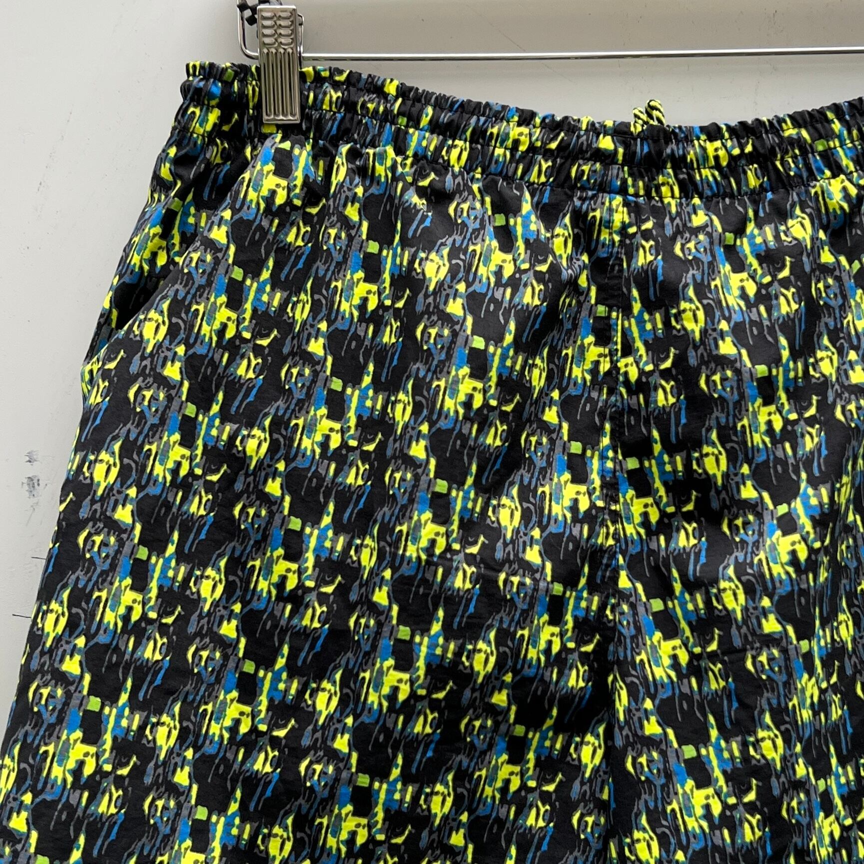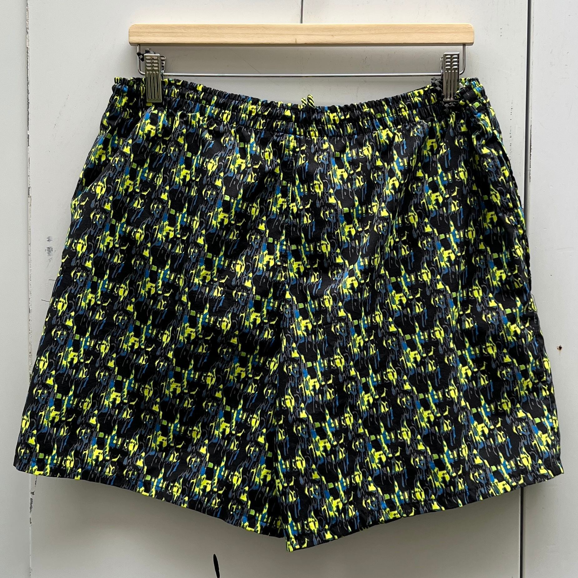 ブラック/イエロー/ブルーのナイロン素材、左裾にラバースウォッシュ刺繍、メッシュサポーターの付いたデザインです。