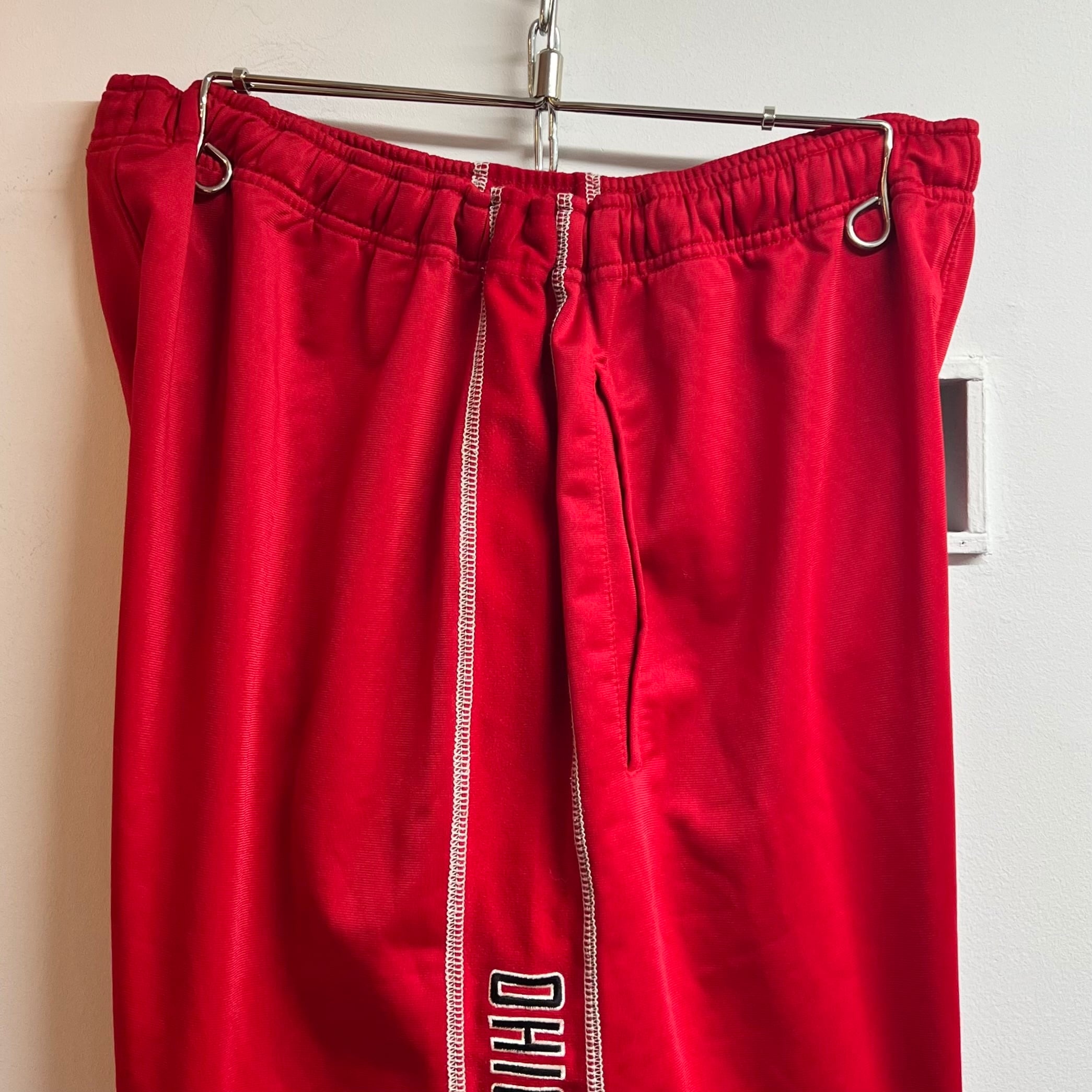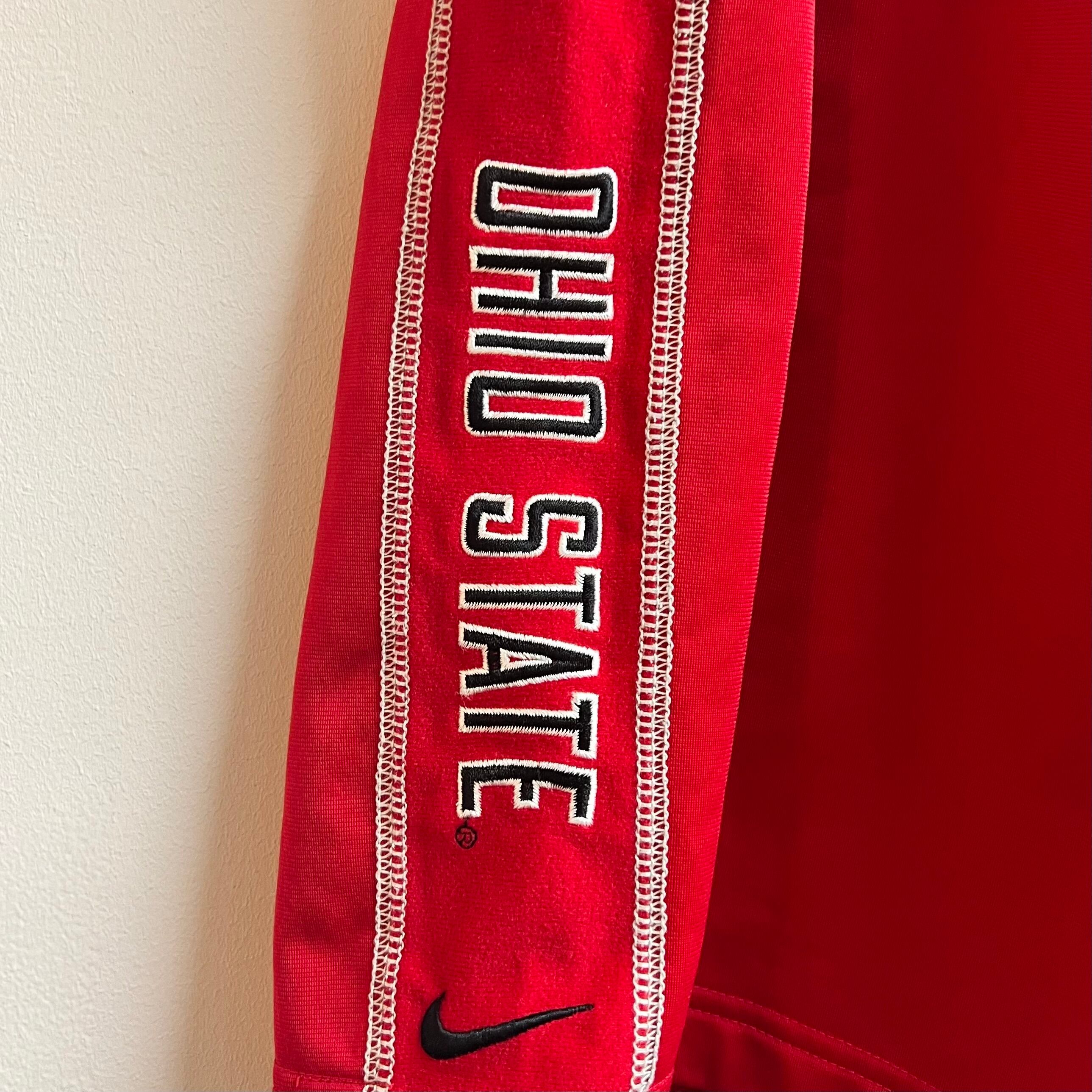 レッドのジャージ素材、左足にOHIO STATEロゴマーク刺繍、右サイドにOHIO STATEとスウォッシュ刺繍、ハンドウォームポケットの付いたデザインです。