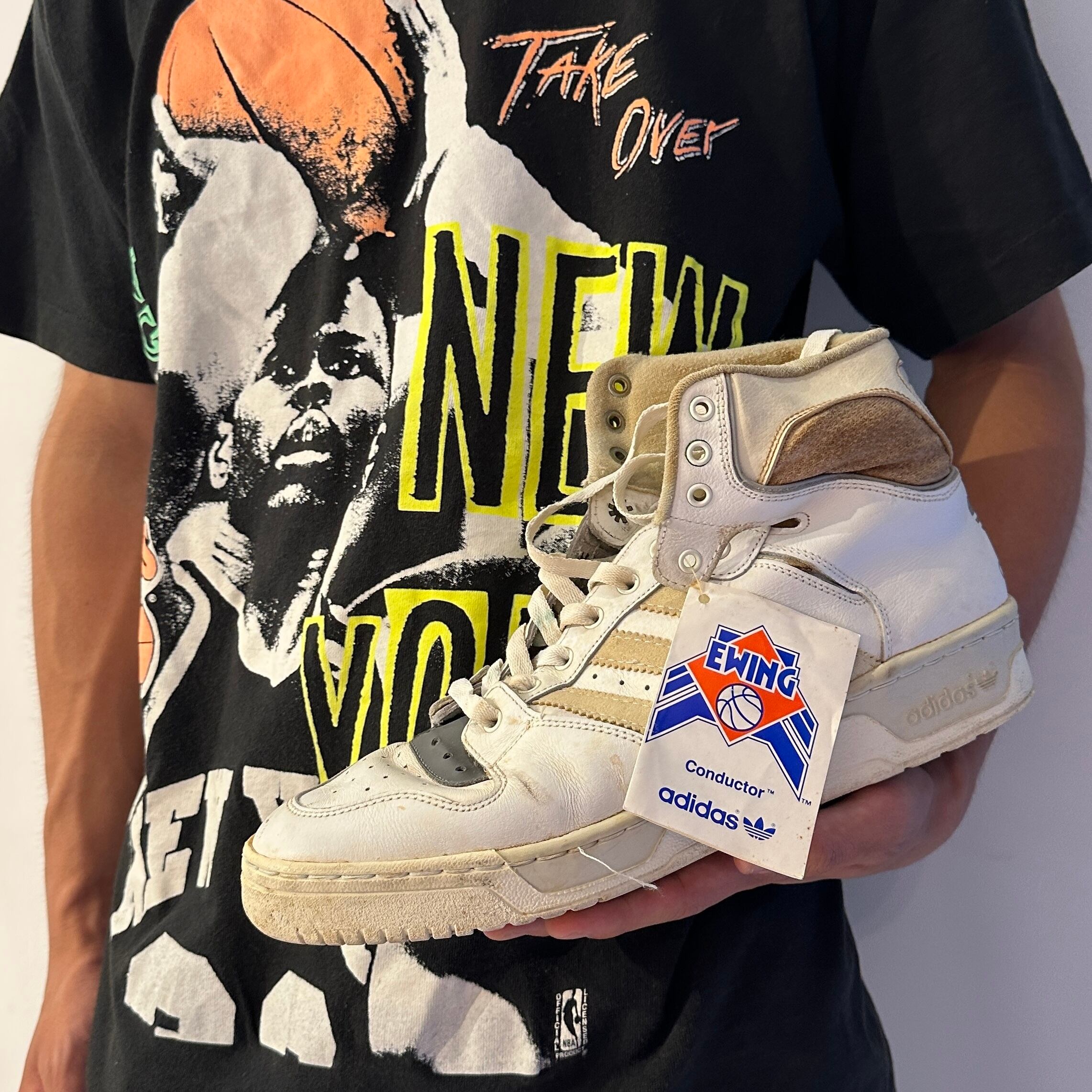 ホワイトレザーxホワイトスウェードxグレー、ヒールにトレフォイルとロゴプリント、シュータンにEWINGロゴマーク、ハイカットのバスケットボール用デザインです。