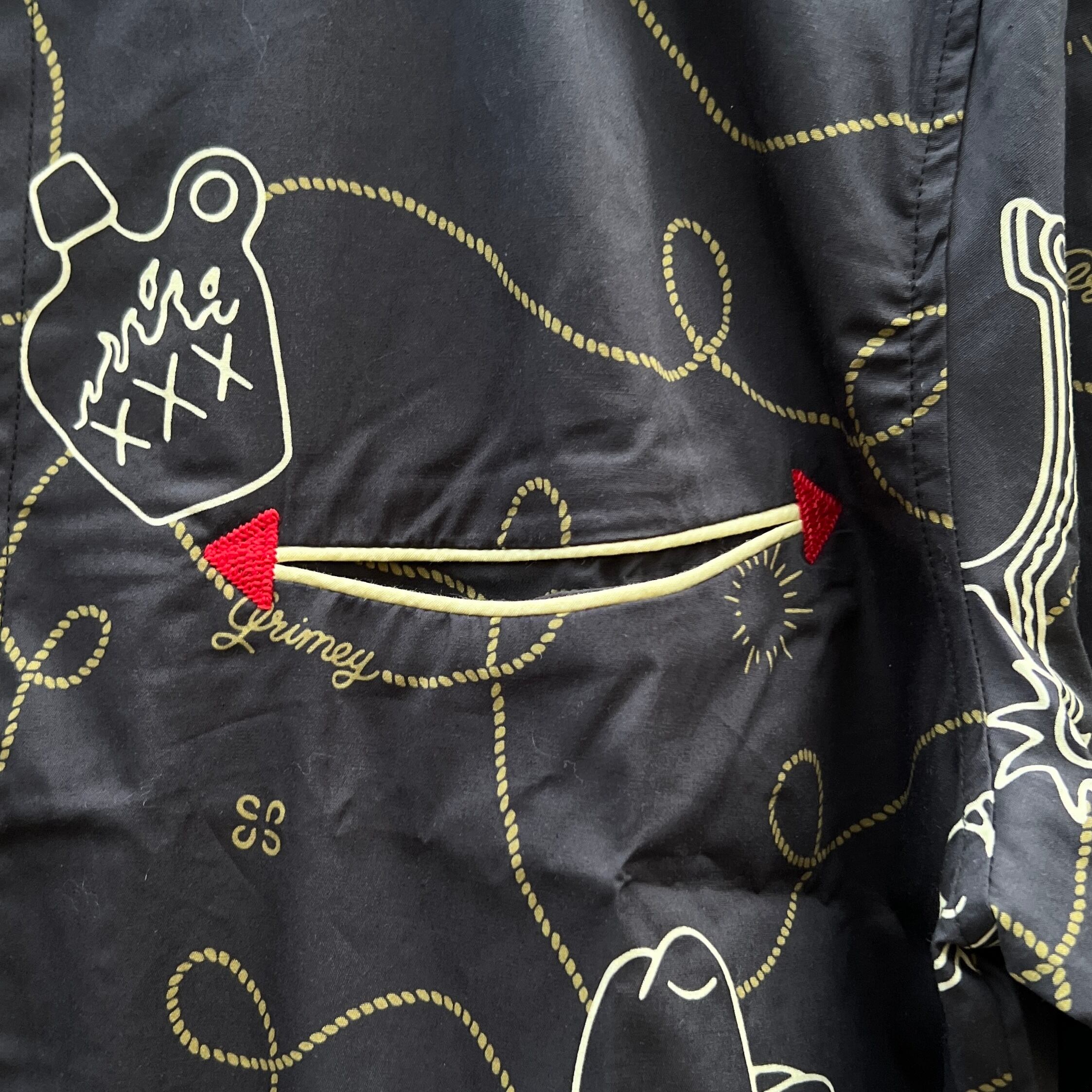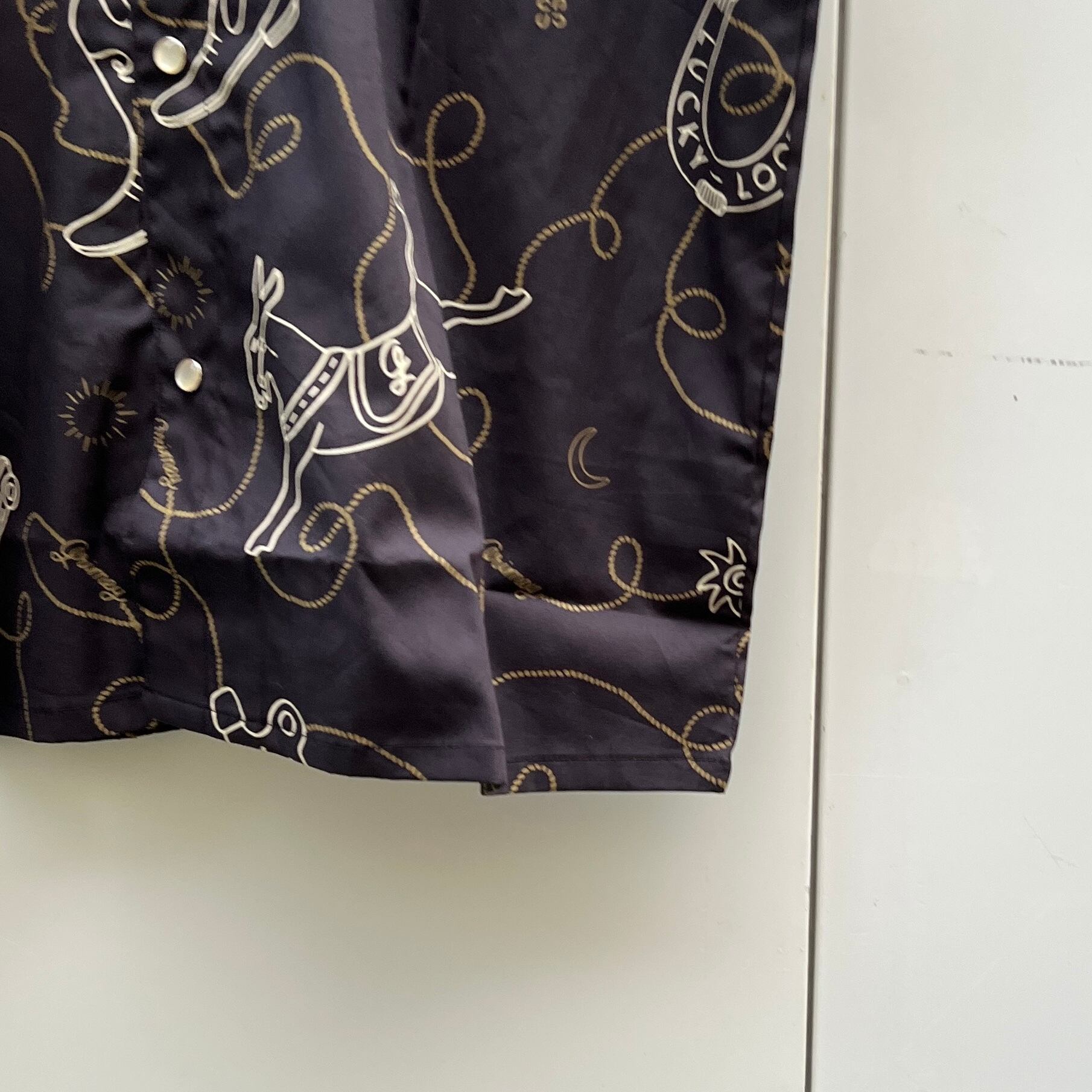 ブラックのコットン素材、ウェスタン?風柄の総柄プリント、両胸にウエスタンカットポケット、スナップボタンで開閉するデザインです。