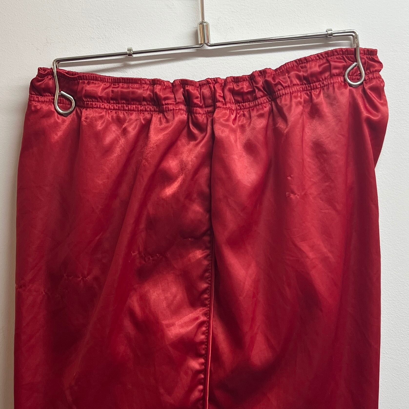 レッドのナイロンサテン素材、左裾にロゴ刺繍、ウエスト紐で調節、ポケットナシ、メッシュサポーターが付いたデザインです。