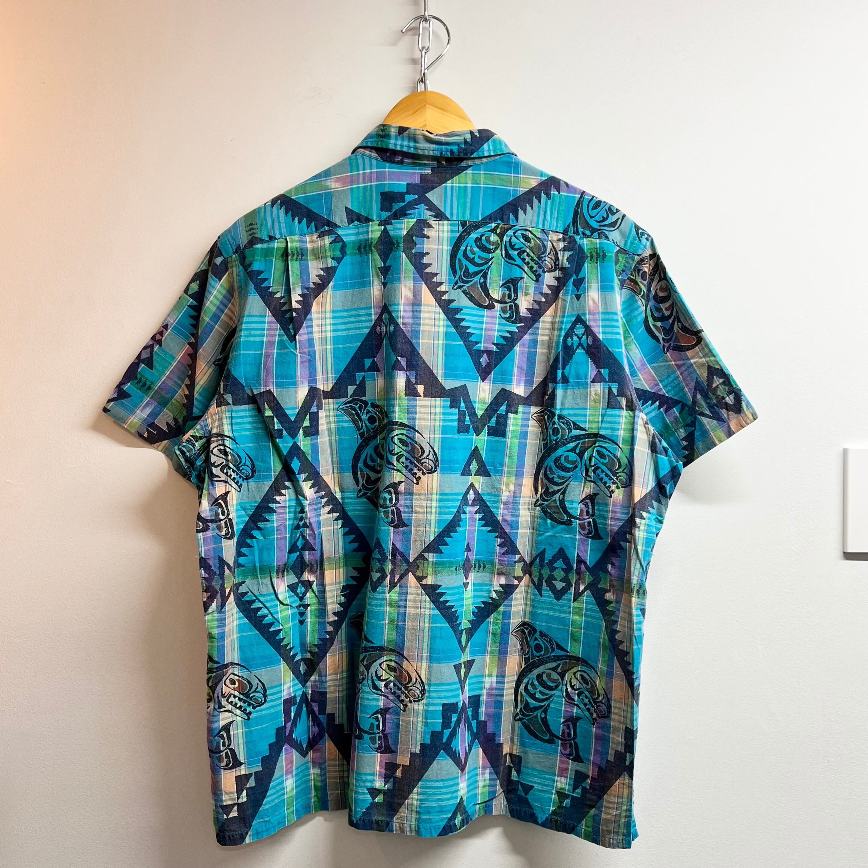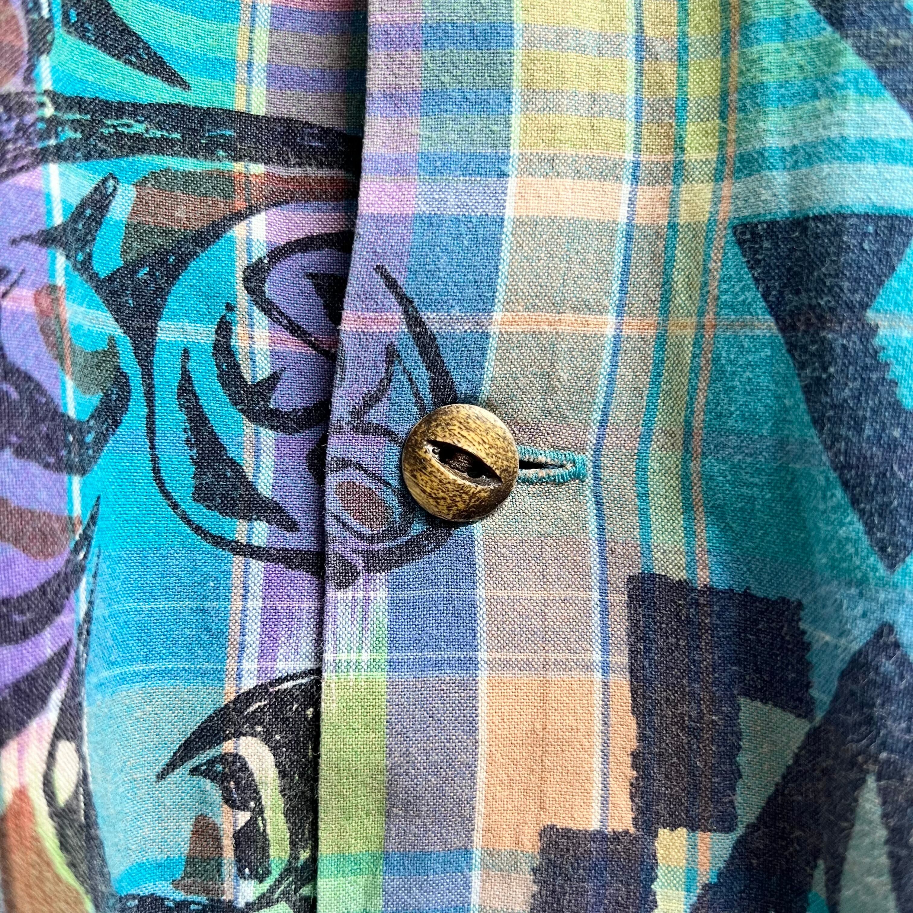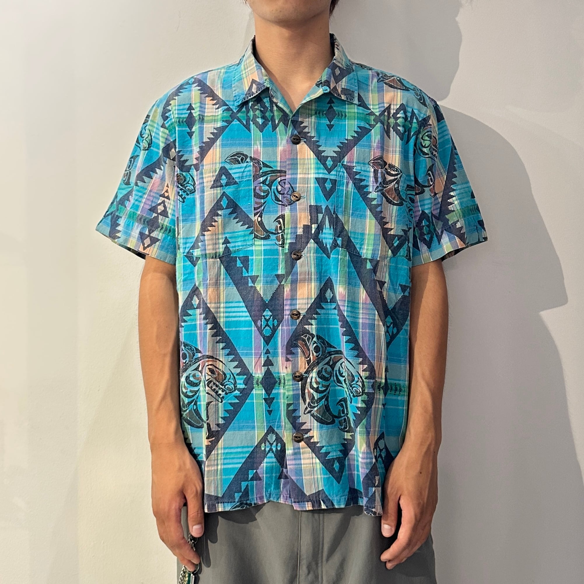 エメラルドグリーン/ピンクベースのマドラスチェックxアメリカンネイティブ系総柄プリント、オープンカラーのスクエア裾のアロハシャツ仕様のデザインです。