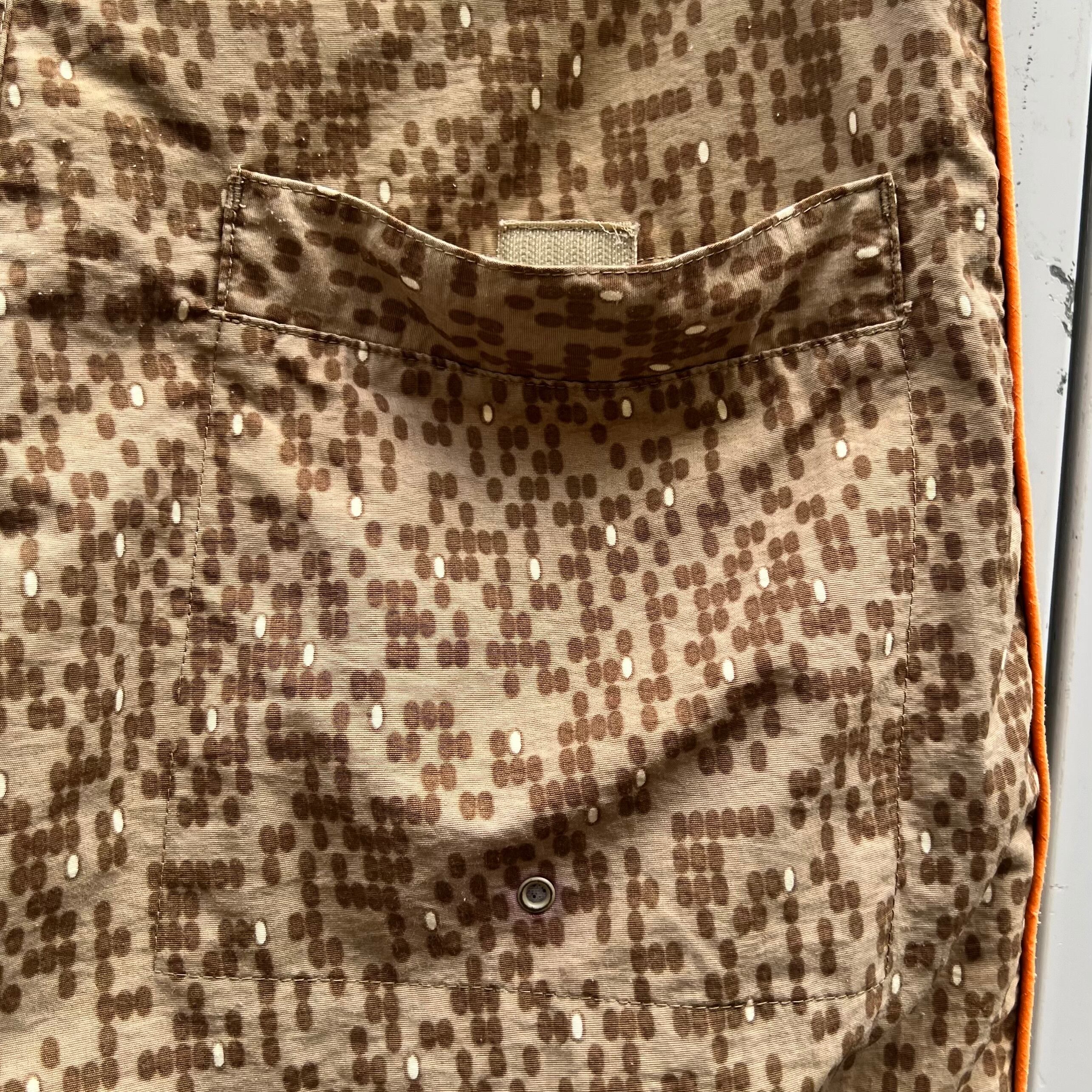 ブラウン系デジタルカモxベージュ/オレンジラインのナイロン素材、左裾にスウォッシュ刺繍、ハンドウォームポケット、両バックポケット、クライミングベルトで調節の前開き、スナップボタンフライ、裾にドローコードが入るデザインです。