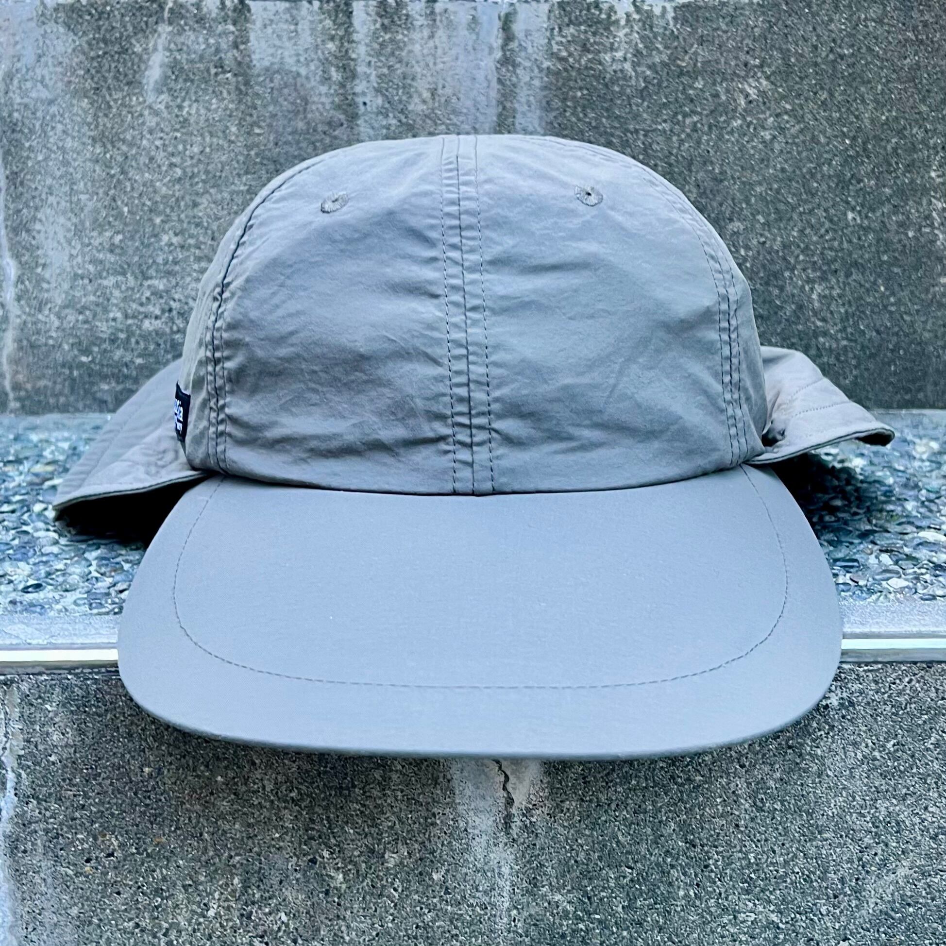 ターコイズブルーのナイロン系素材、フロントにロゴとロゴマーク刺繍、ゴムアジャスター、サイドのスナップボタンで付属脱着、つば裏にベロクロ付きポケット、5パネルのジェットキャップ型デザインです。