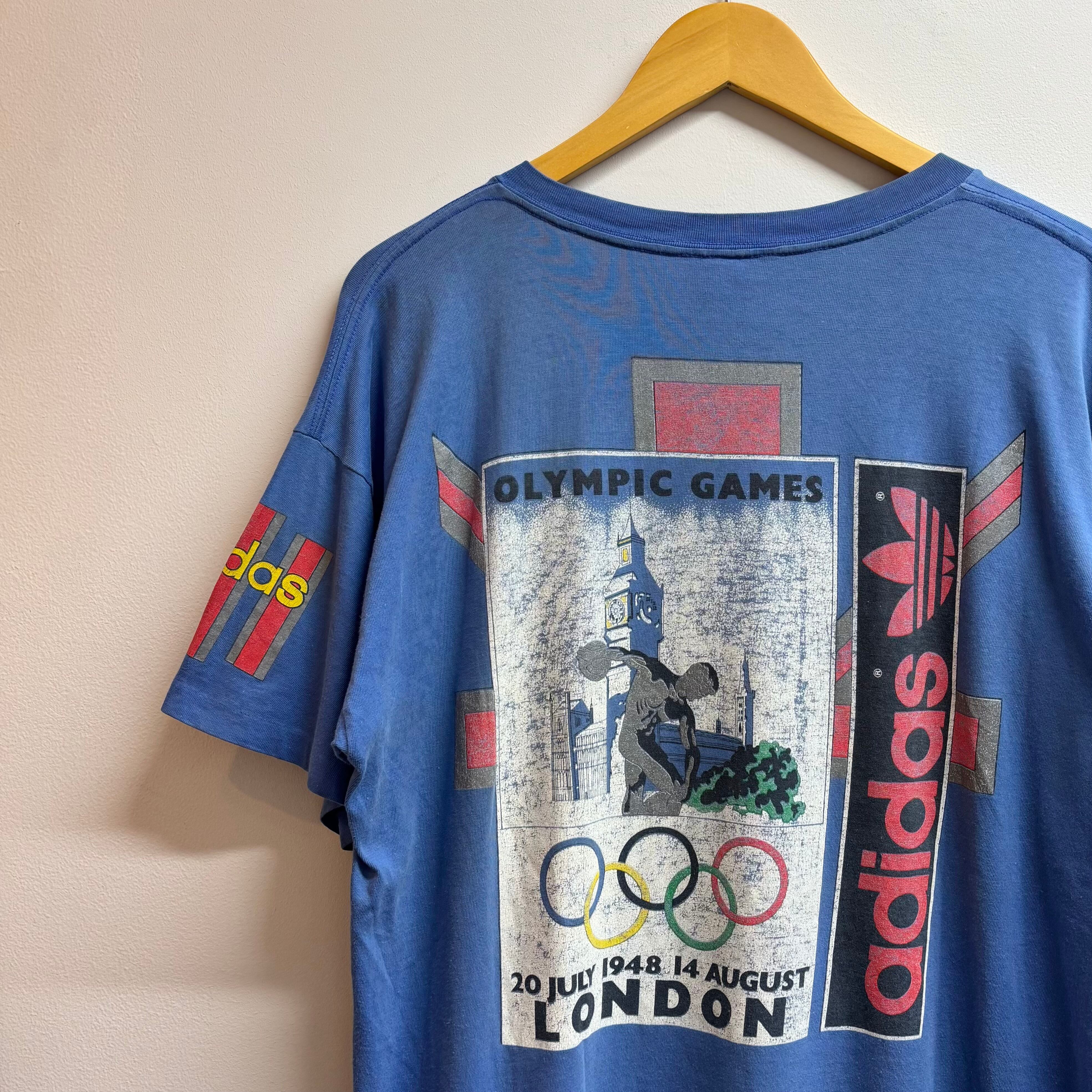 ブルーのコットン系素材、フロントにアディダスロゴとトレフォイル、THE OLYMPIC GAMES1908プリント、左袖にadidasプリント、右袖にLONDONと5輪プリント、バックに大きくロゴとトレフォイル、OLYMPIC GAMES LONDONプリントが入るデザインです。
