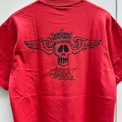 レッドのコットン素材、左胸に25周年ロゴプリント、バックにスカルウイングマークと25周年ロゴがプリントされたデザインです。