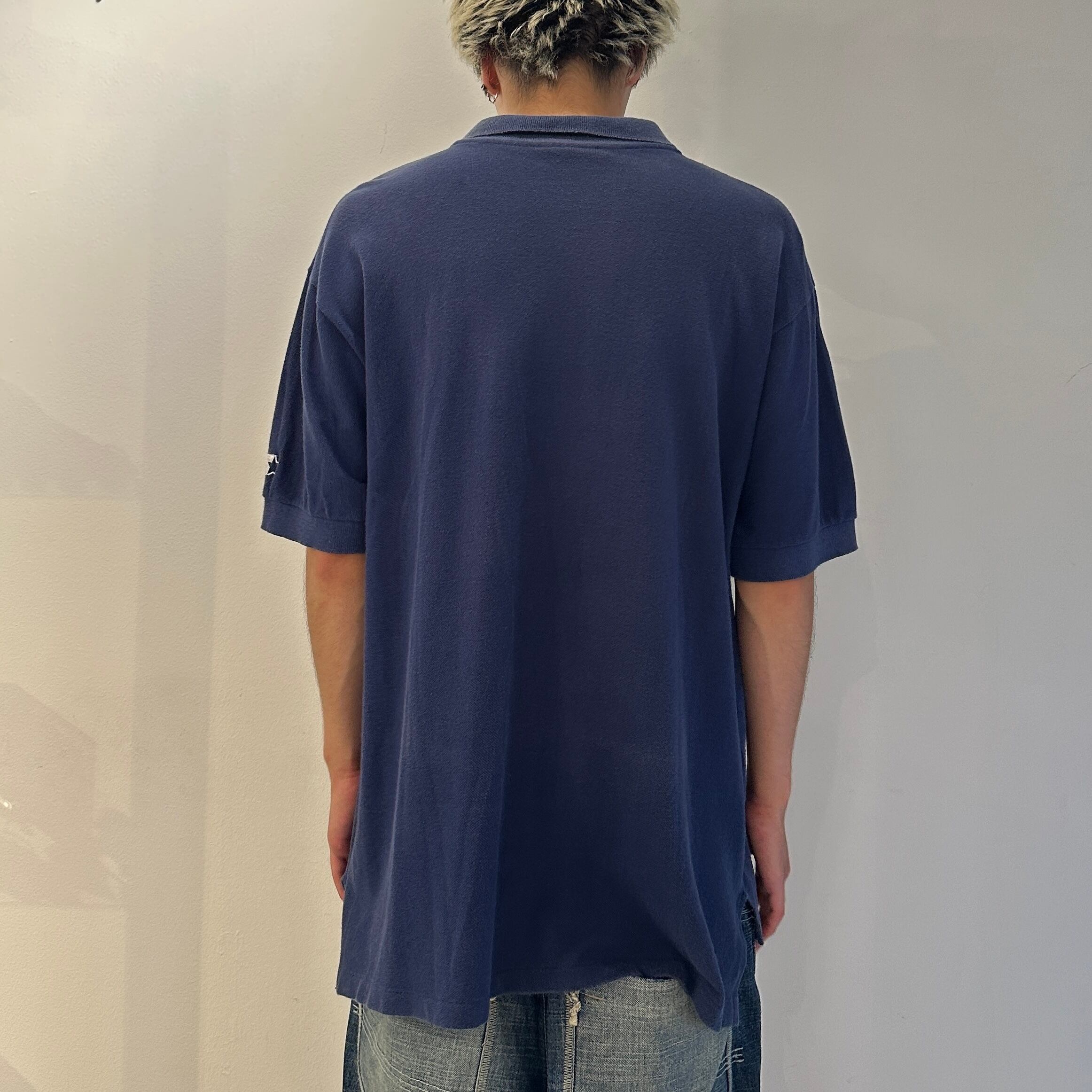 ネイビーのカノコ素材、左胸にロゴマーク刺繍、左袖にSTARTERロゴマーク刺繍が入るシンプルデザインです。