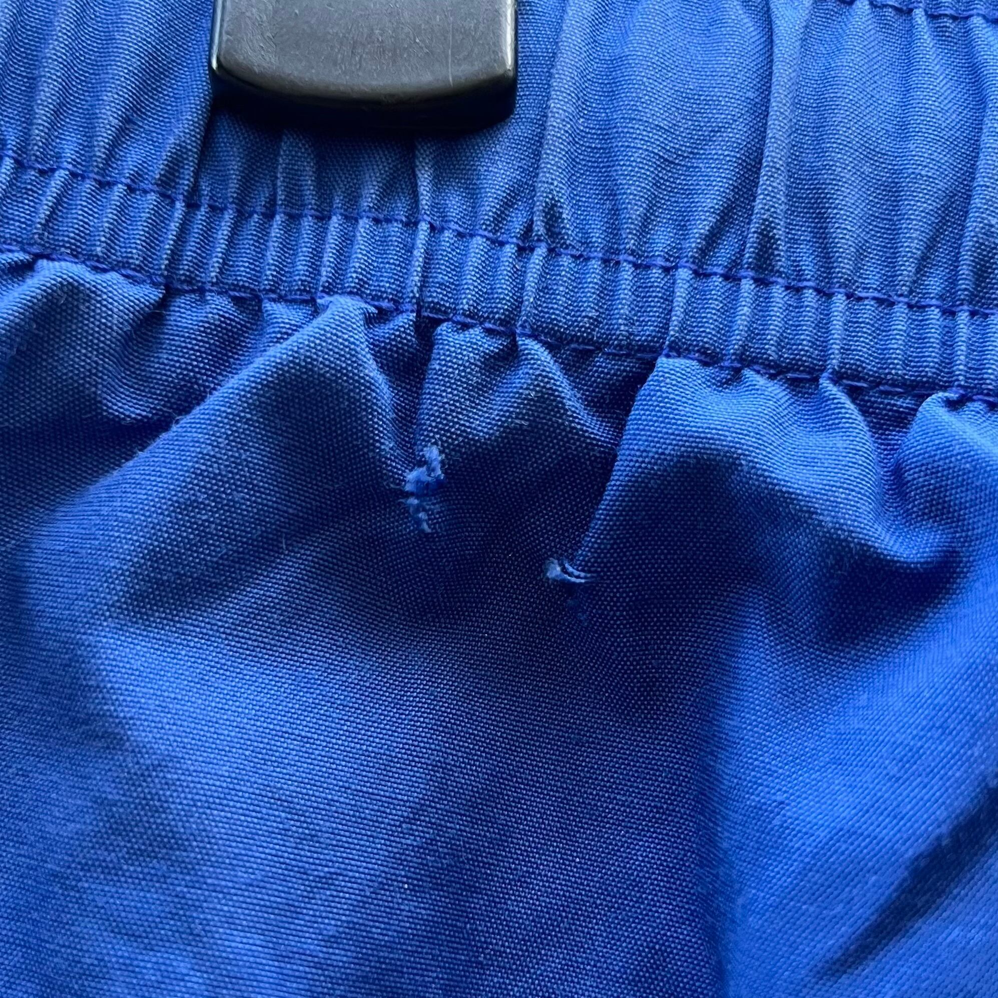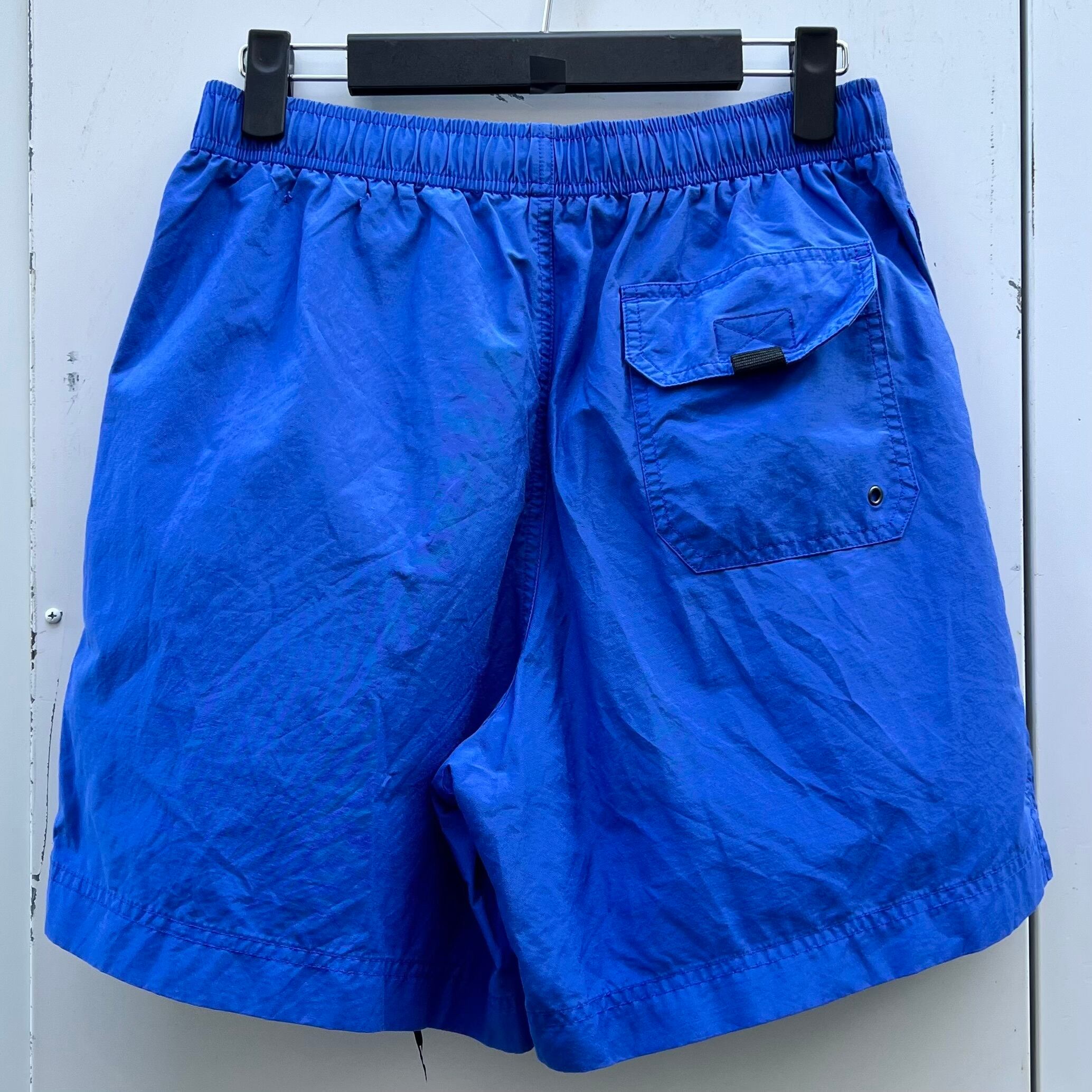 ブルーのナイロン混素材、左裾にポニー刺繍が入るシンプルデザインです。