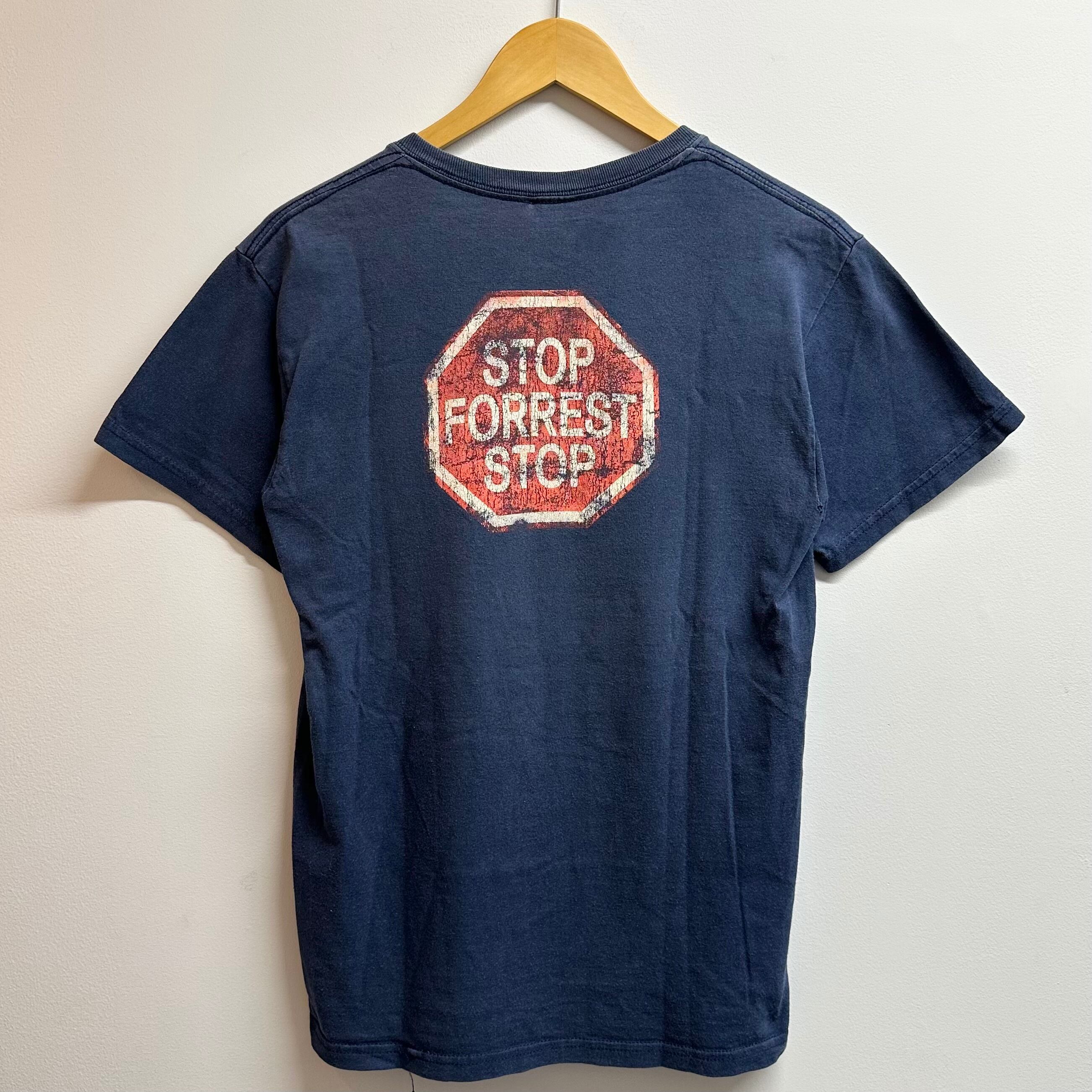 ネイビーのコットン系ボディ、フロントにRUN FORREST RUNのナンバープレートとNEW YORK TIMES SQUAREプリント、バックにSTOP FORREST STOPの標識プリントが入るデザインです。