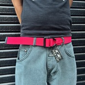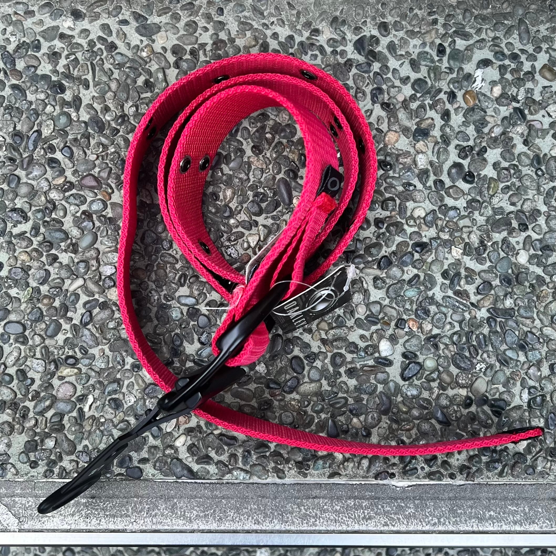 レッドのポリエステル素材、ブラックのアイレット、バックル部と先端にネームが付いたデザインです。