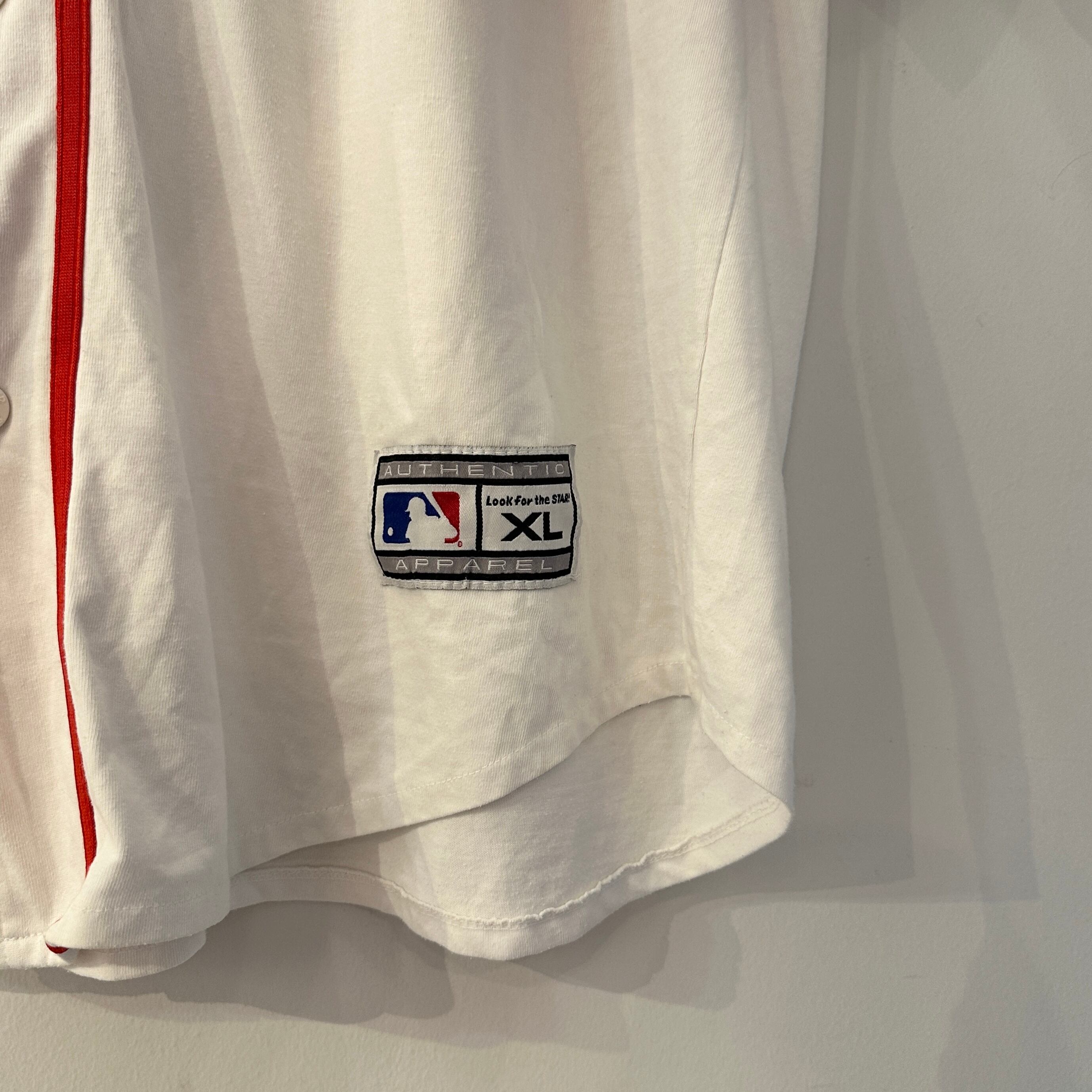 ホワイトのポリエステル混素材xレッドライン、フロントにCLEVELAND刺繍、左袖にワフー酋長とSTARTERロゴマーク刺繍が入るスタンダードデザインです。
