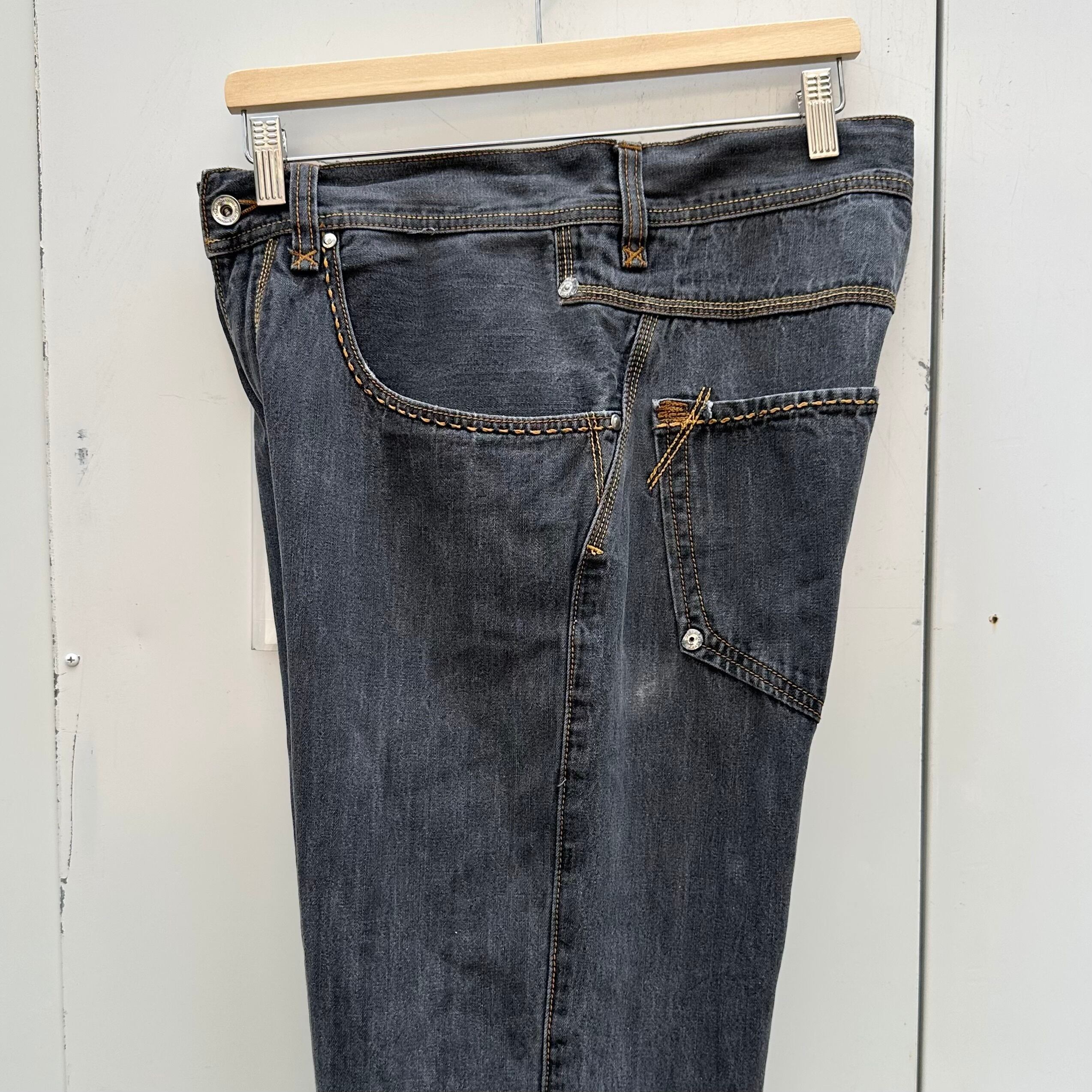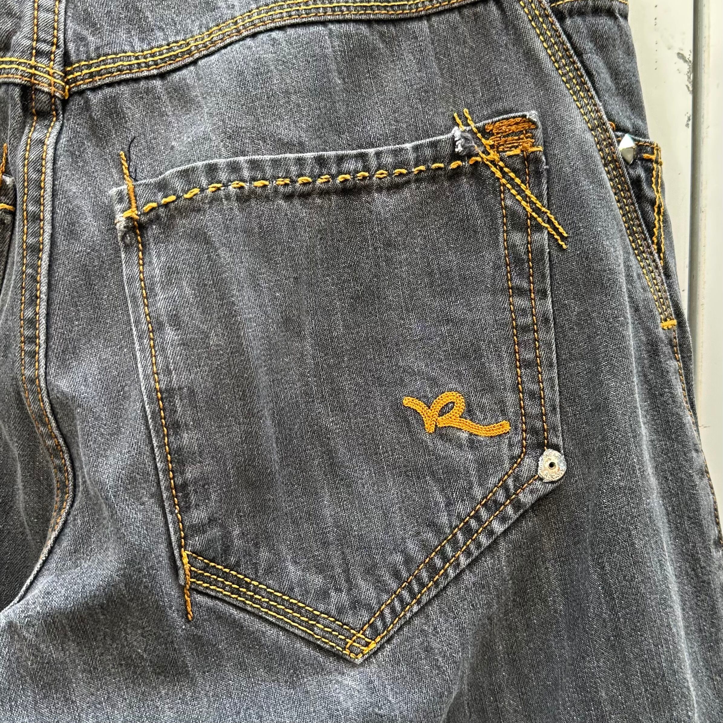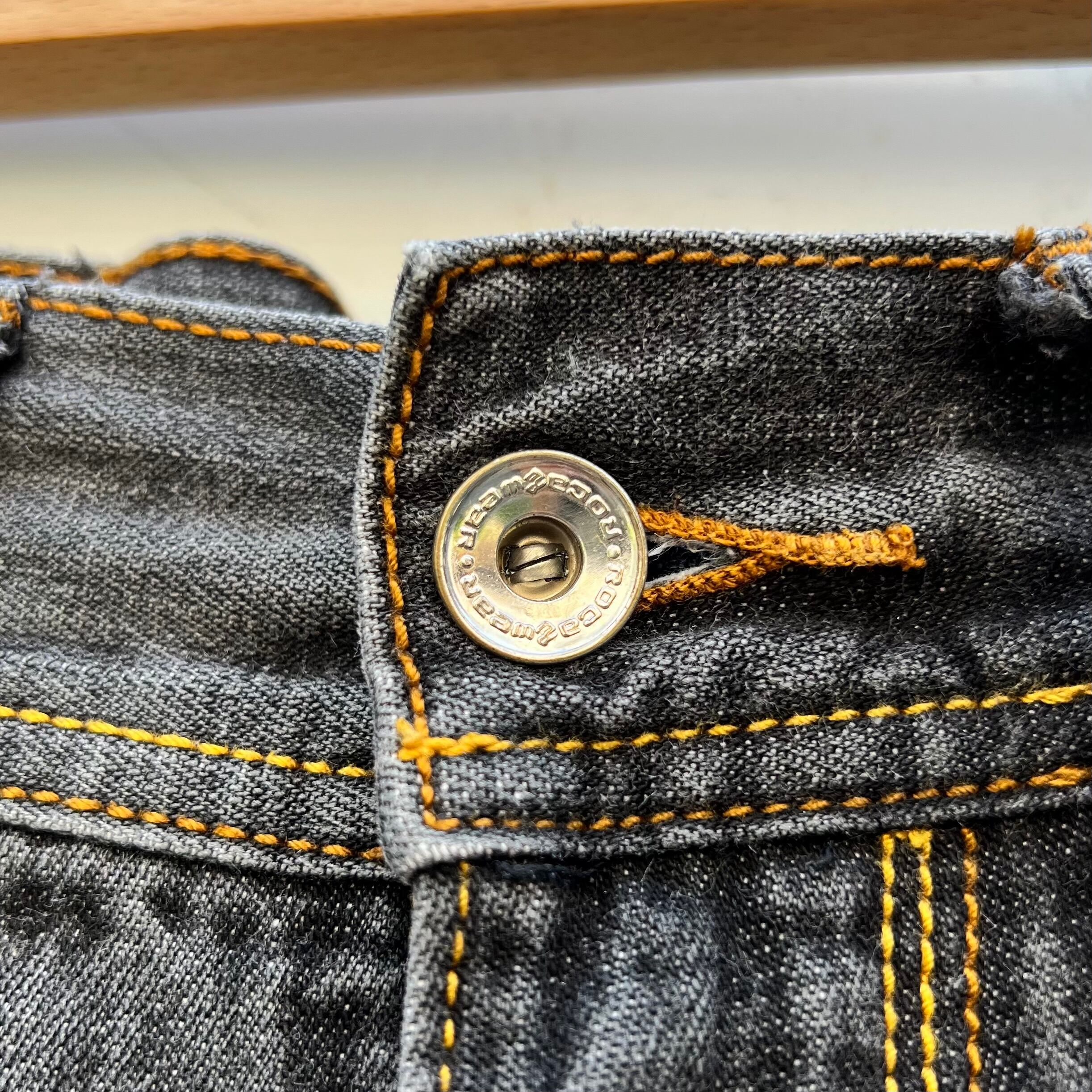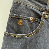 ウォッシュド先染ブラックデニム、右バックポケットにロゴマーク刺繍、コインポケットにロゴマーク刺繍、レザーパッチ、2色のカラーステッチ、ロゴ入りボタンの付いた5ポケット型デザインです。