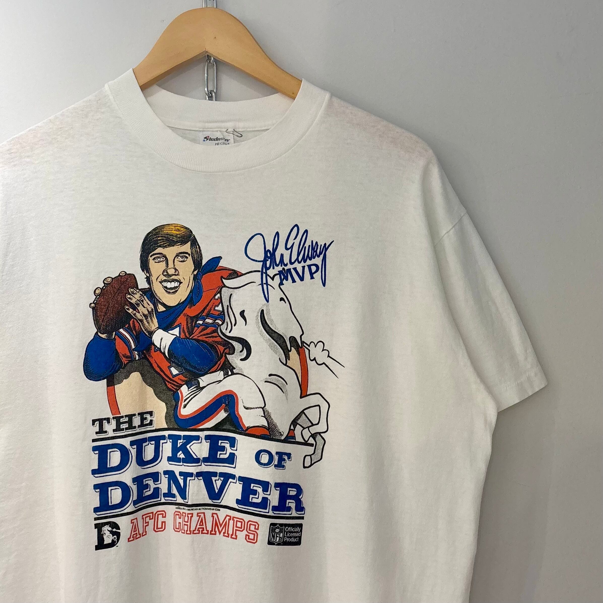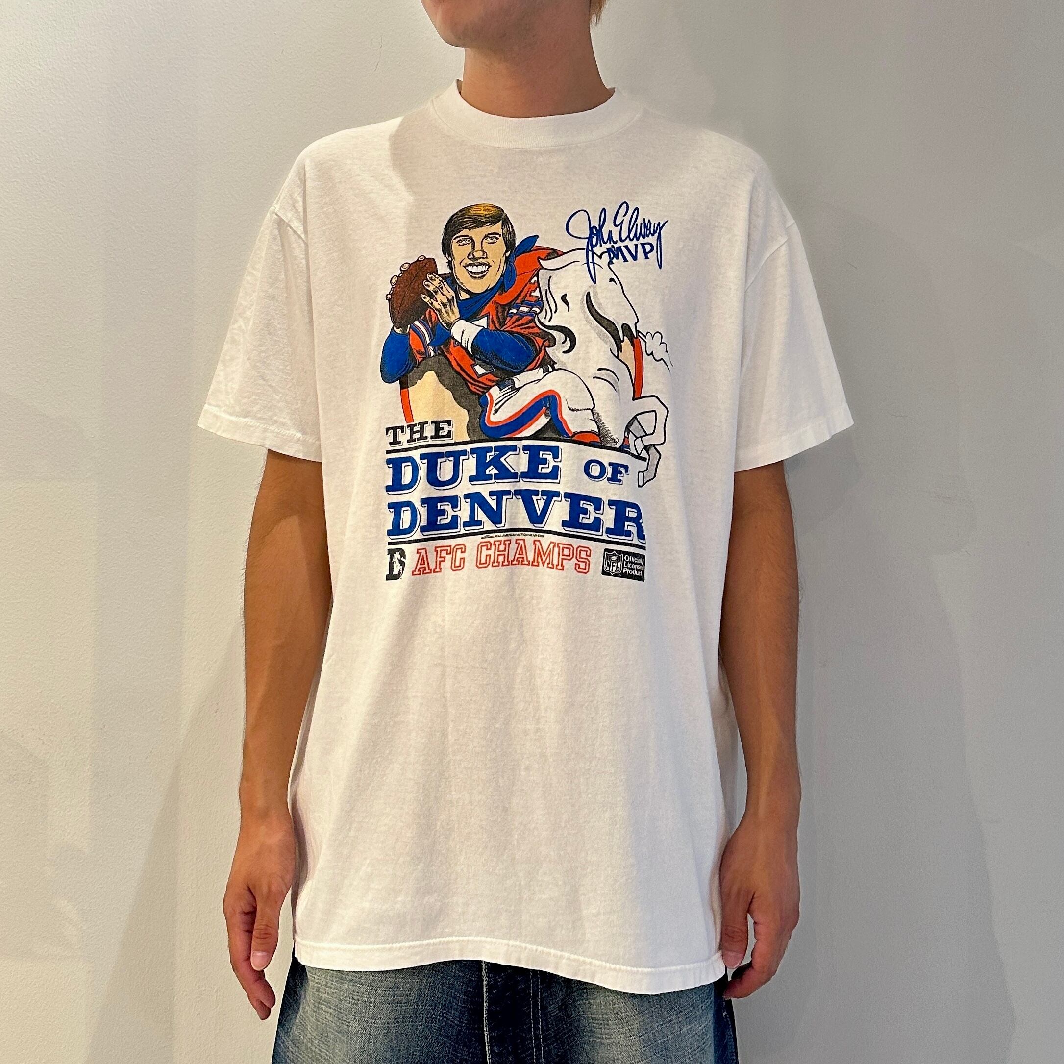 ホワイトのコットン素材、フロントにTHE DUKE OF DENVER AFC CHAMPSとエルウェイのプリントが入るデザインです。
