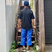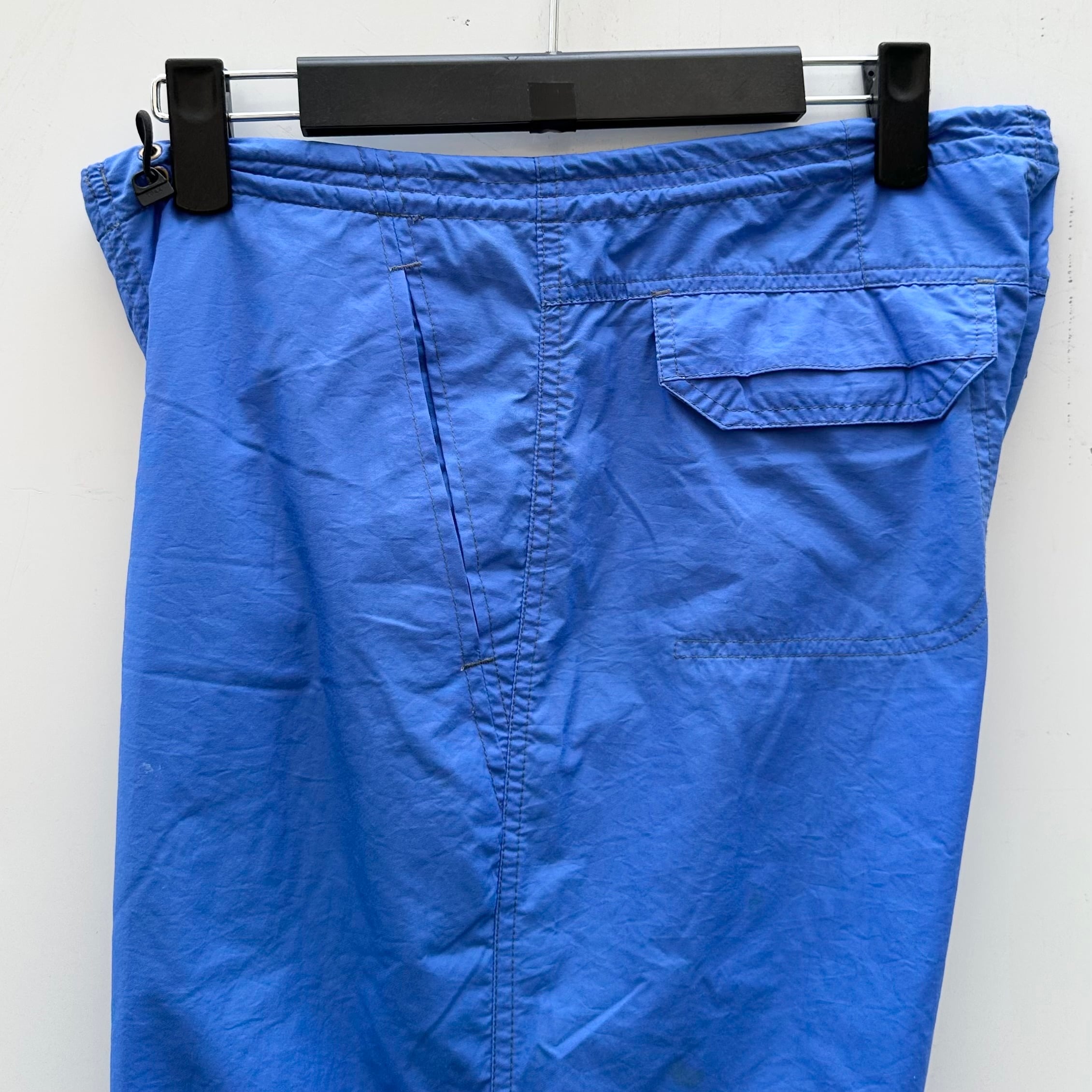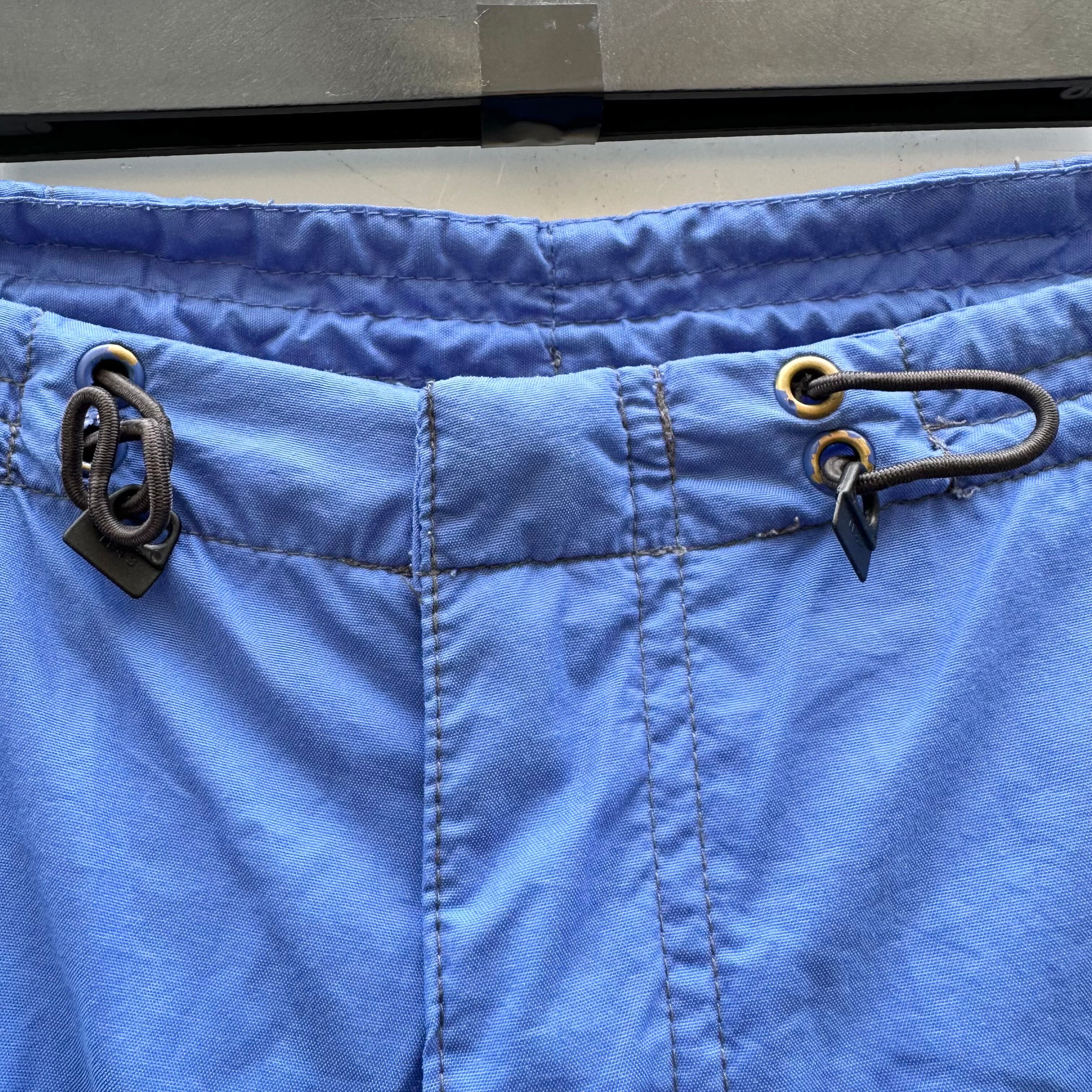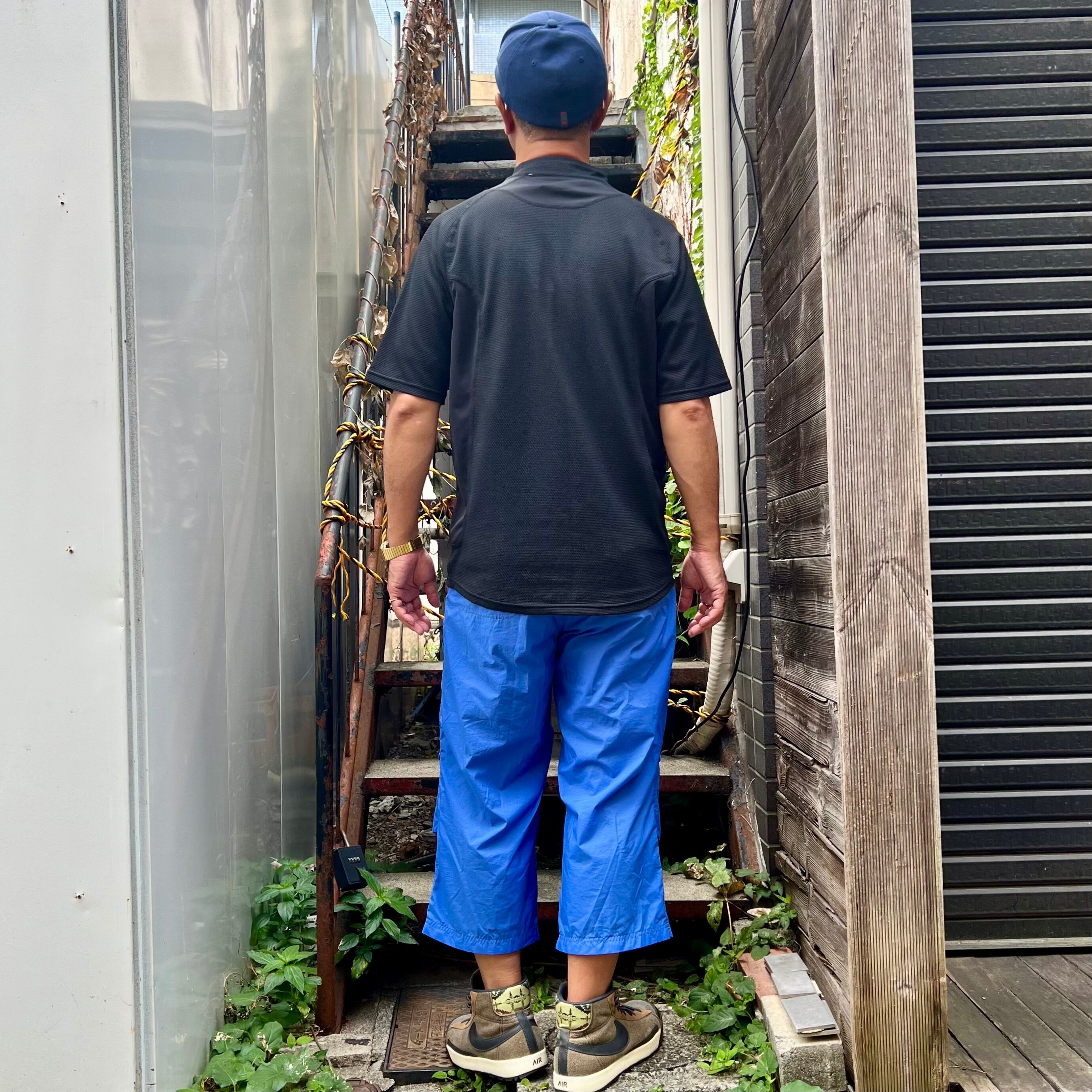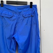ブルーのナイロン素材、左足裾と右バックポケットにロゴネーム、ハンドウォームポケット、フラップ付き付きバックポケット、両膝に立体ステッチ、ボタン、内側にロールアップ時に丈を固定するストラップ、ウェストをゴムで調節するデザインです。