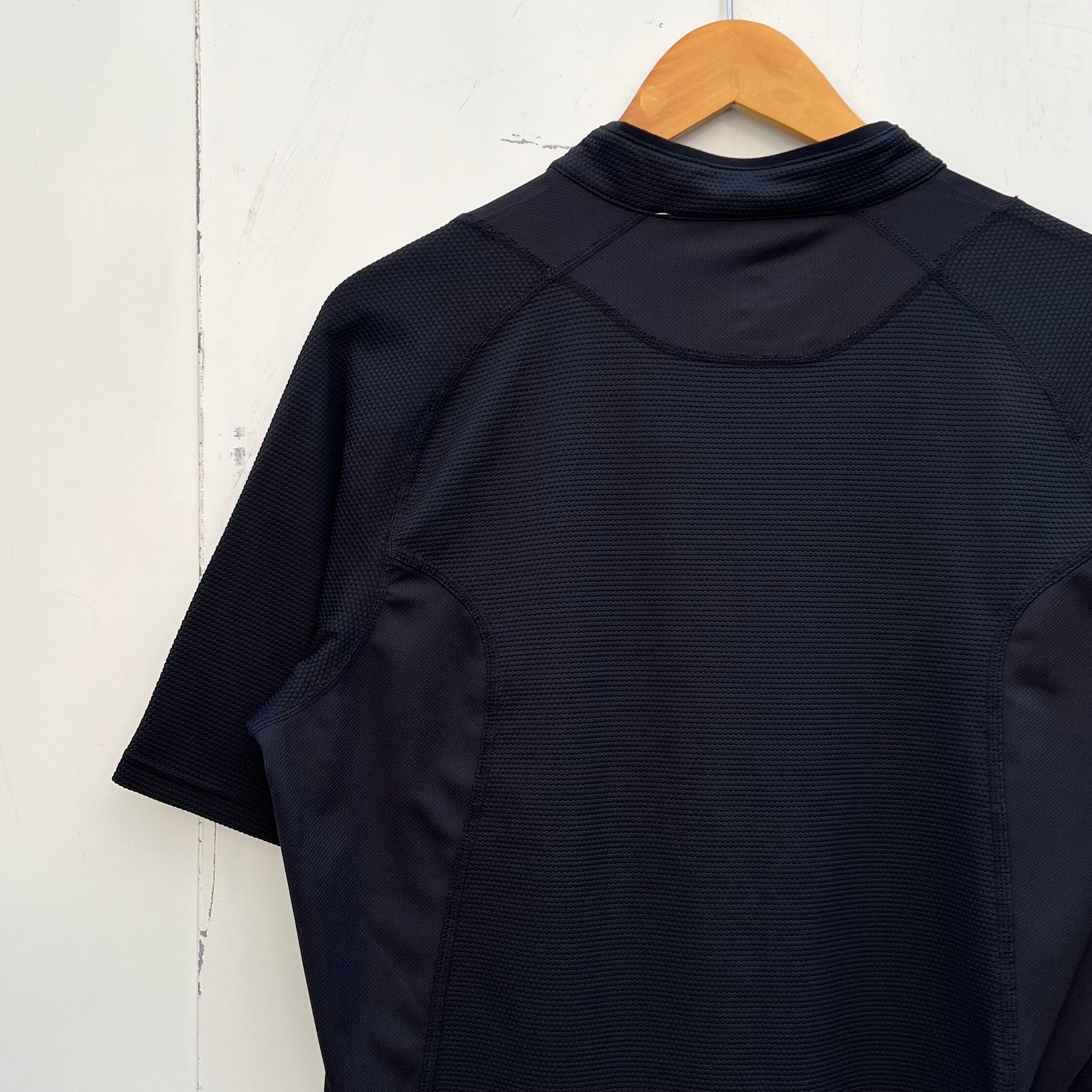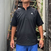 ブラックのワッフル素材xブラックのメッシュ素材、左胸にACGロゴマーク刺繍、右バックサイドにジッパー付きポケット、ハーフジップのレイヤー1、機能素材を使用したデザインです。