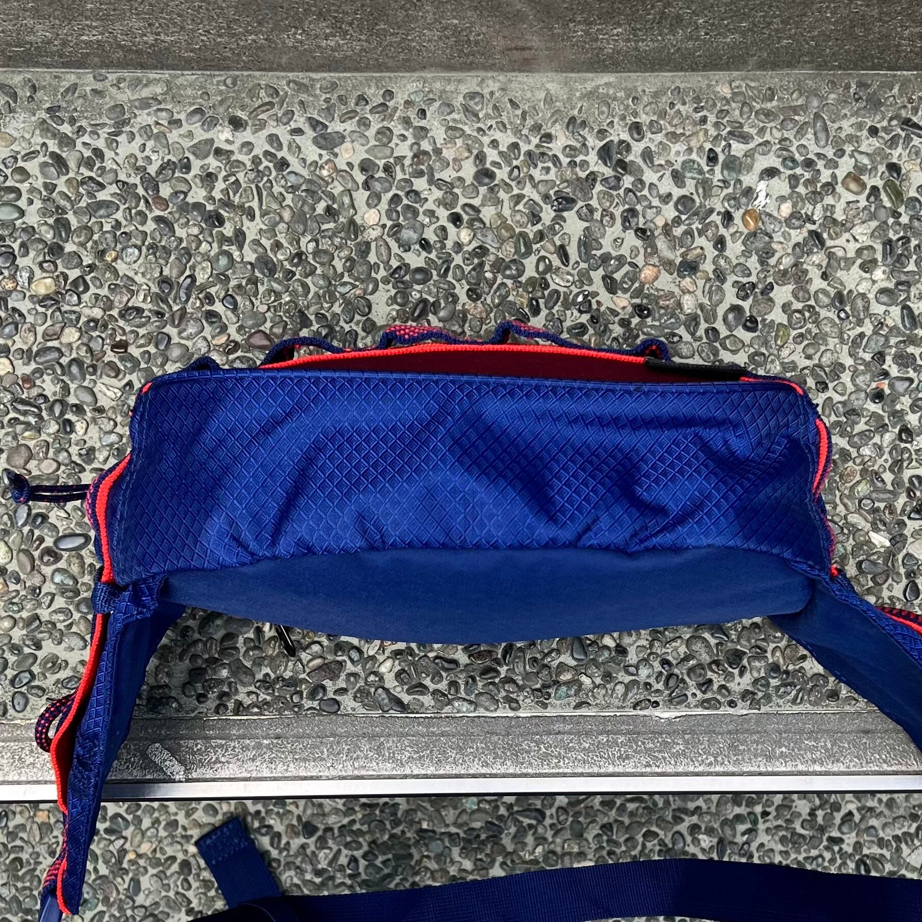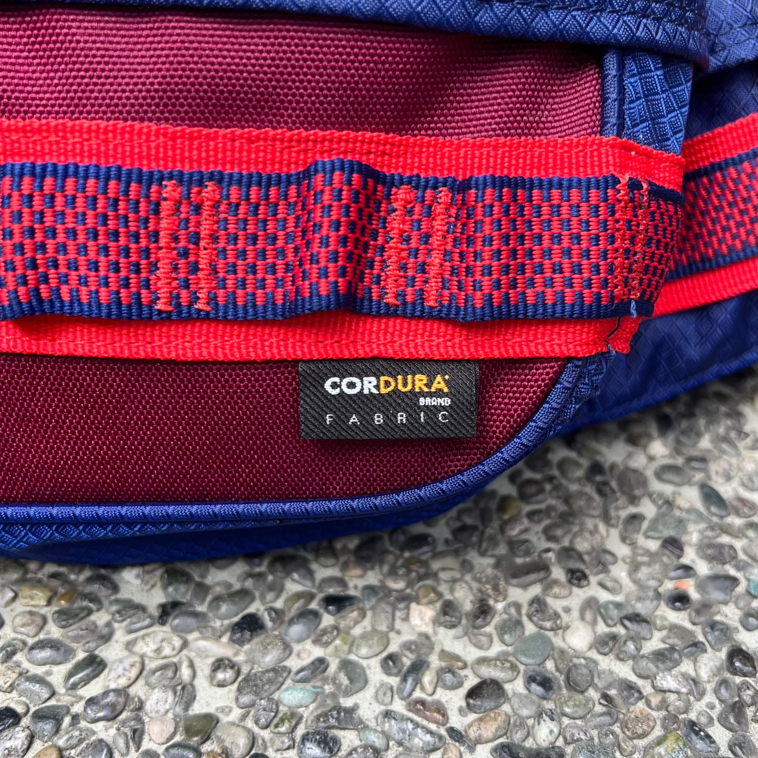 ネイビーのリップストップxバーガンディのコーデュラナイロン、オレンジテープにネイビー/オレンジテープ、メインポケットと両サイドのサブポケット、右のフラップ部にロゴマーク刺繍、メッシュの内ポケット、背面にジッパー付きポケットが付いたデザインです。
