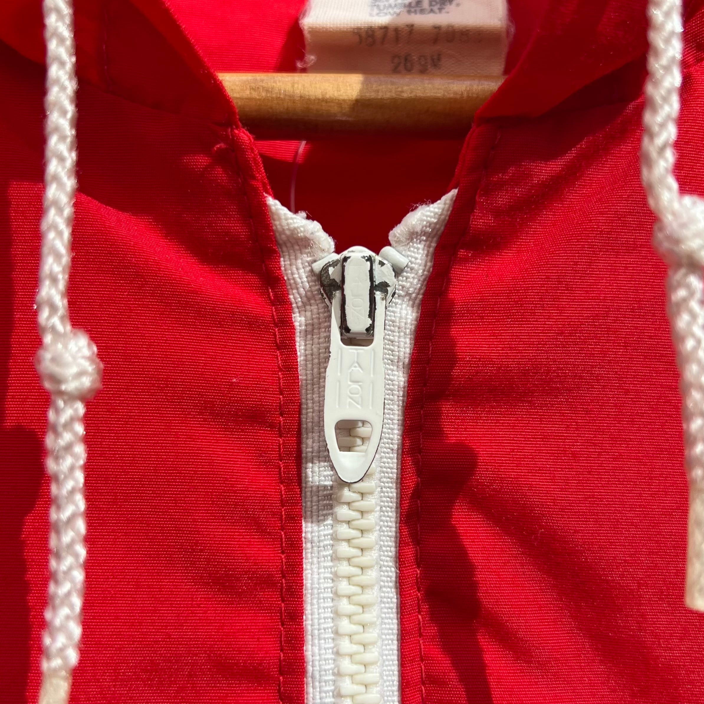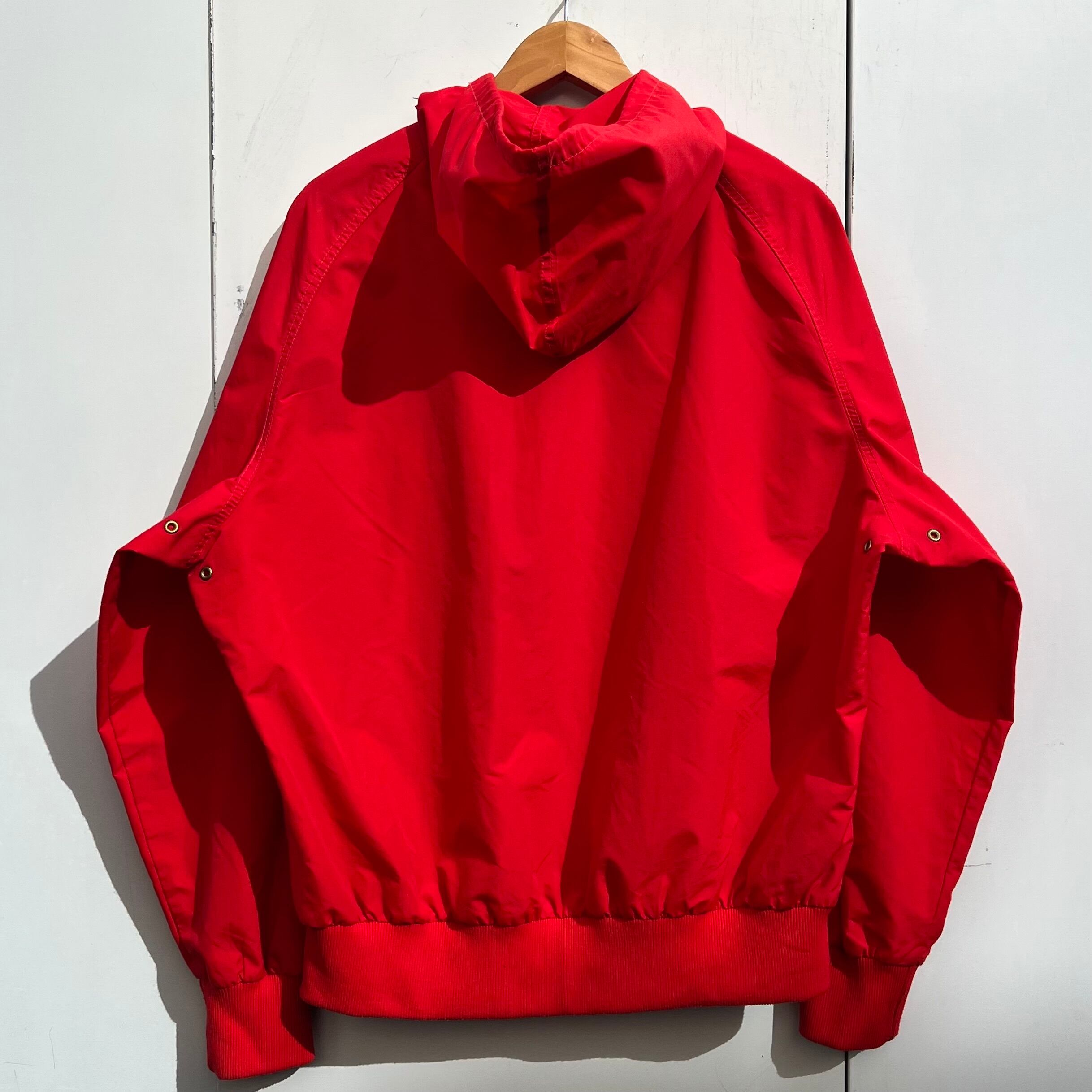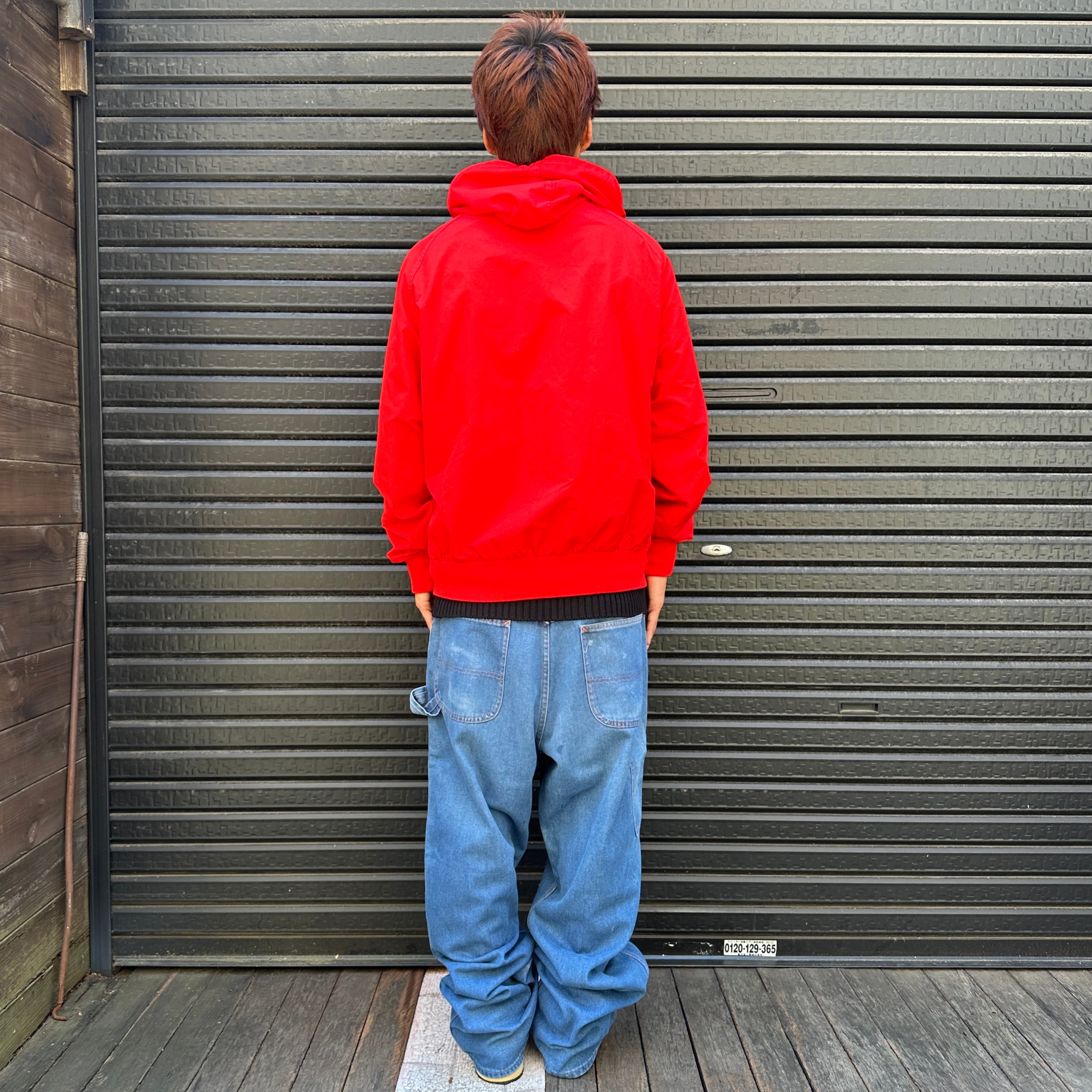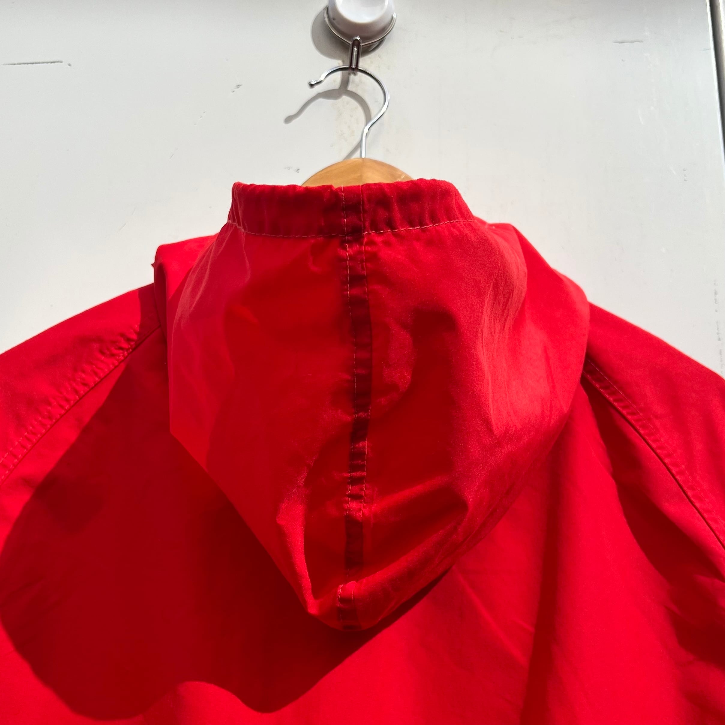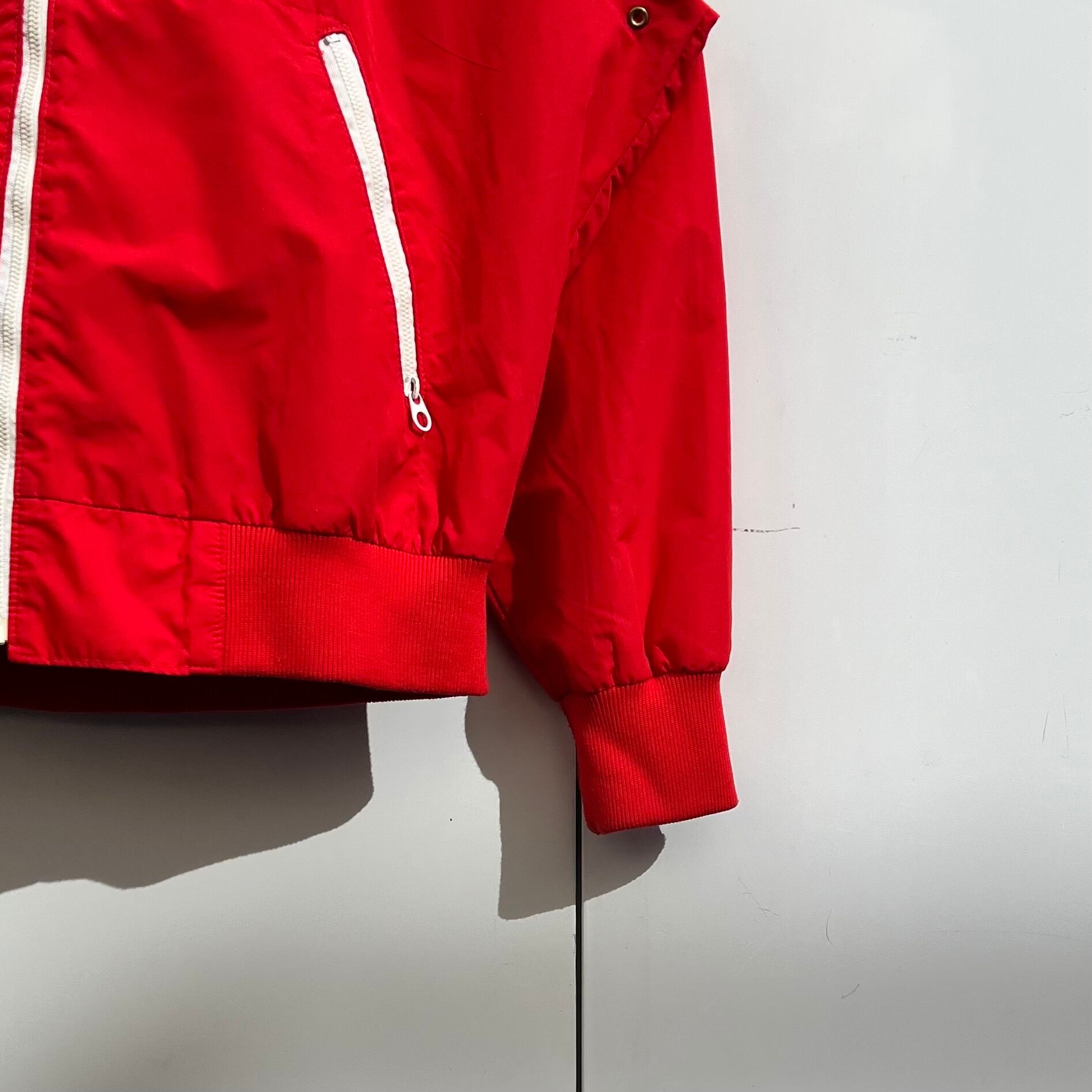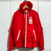 レッドのナイロン素材、左袖にロゴとNATIONAL SPORTS FESTIVALワッペン、ジッパー付きポケット、フロントにフラップ付きポケット、ジッパー付きハンドウォームポケット、袖、裾にリブの付いたスタンダードデザインです。